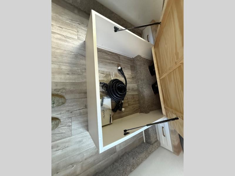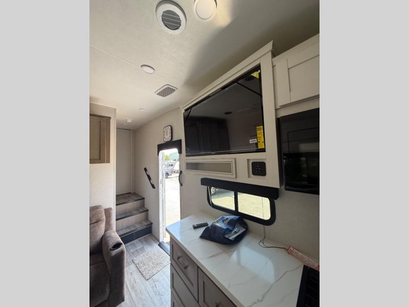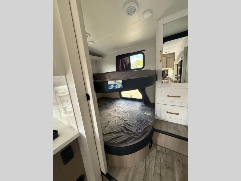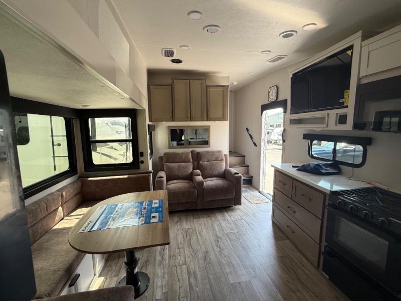 If you're needing a fifth wheel with more sleeping space, this unit will be perfect for you! There are double-size bunks in the back with a wardrobe for your guests' things and TV prep if you want to add a TV here. The front private bedroom up front will have you feeling right at home with its Olympic queen bed and dual wardrobes, and any additional guests you have can sleep on the U-shaped dinette within the slide out. There is also a theater seat here where you can relax with a good book in the evenings.