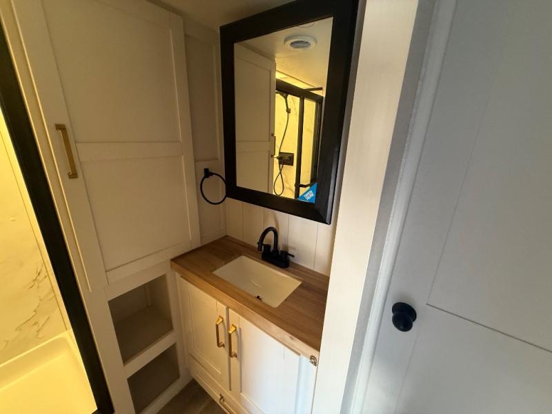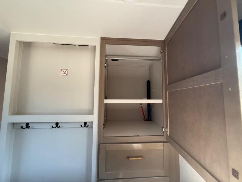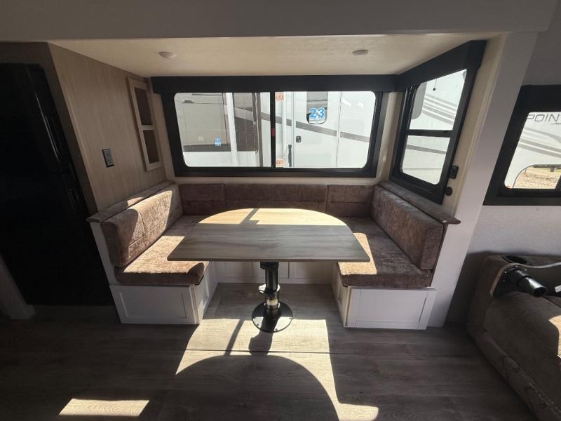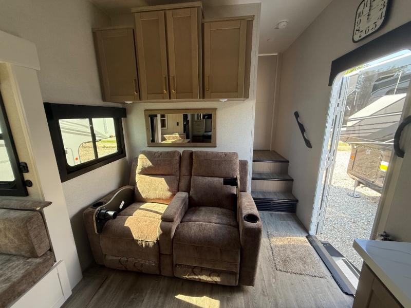 If you're needing a fifth wheel with more sleeping space, this unit will be perfect for you! There are double-size bunks in the back with a wardrobe for your guests' things and TV prep if you want to add a TV here. The front private bedroom up front will have you feeling right at home with its Olympic queen bed and dual wardrobes, and any additional guests you have can sleep on the U-shaped dinette within the slide out. There is also a theater seat here where you can relax with a good book in the evenings.