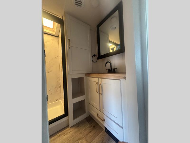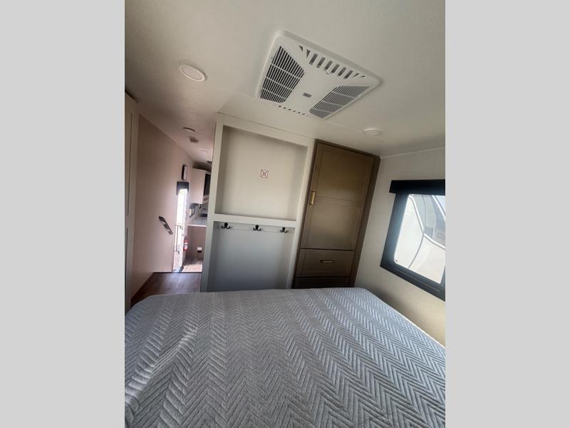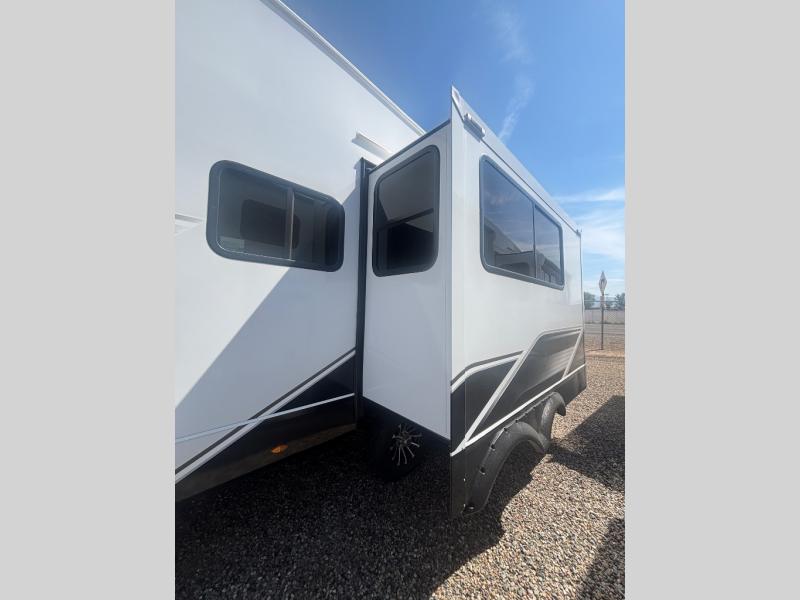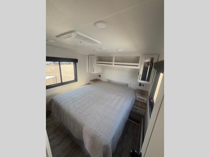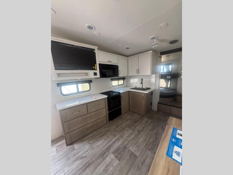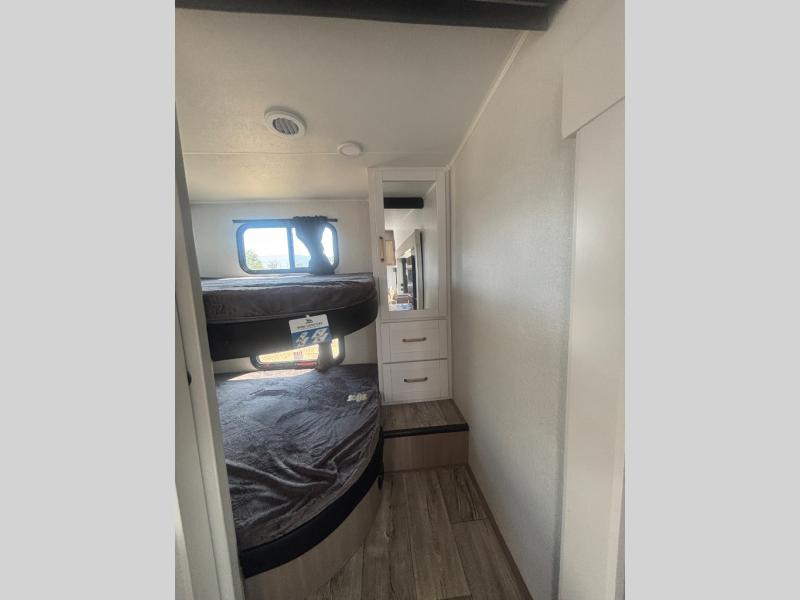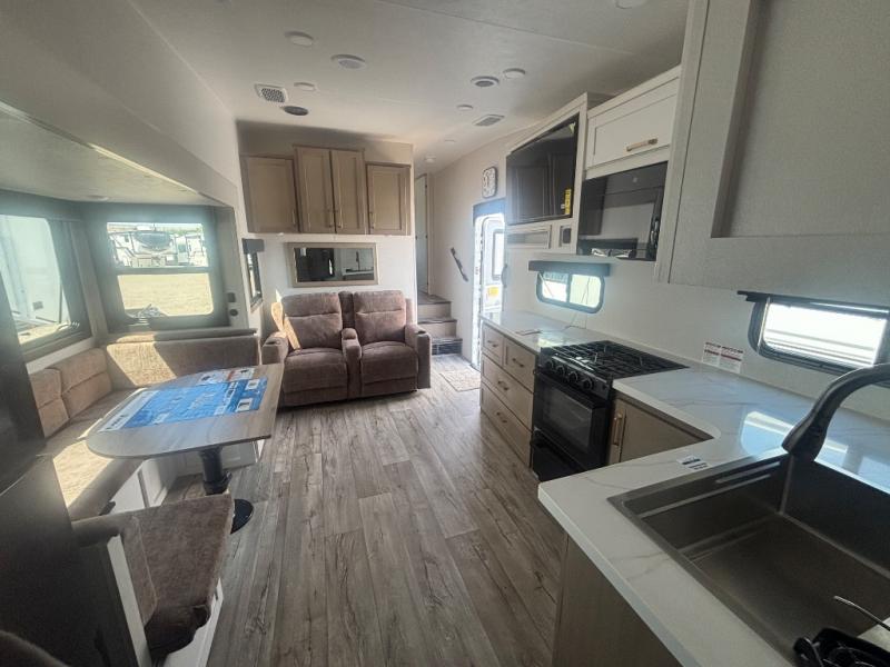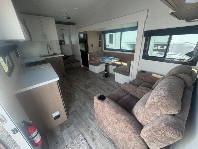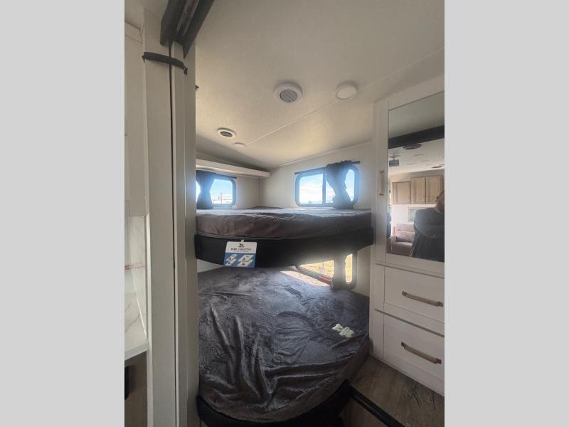 If you're needing a fifth wheel with more sleeping space, this unit will be perfect for you! There are double-size bunks in the back with a wardrobe for your guests' things and TV prep if you want to add a TV here. The front private bedroom up front will have you feeling right at home with its Olympic queen bed and dual wardrobes, and any additional guests you have can sleep on the U-shaped dinette within the slide out. There is also a theater seat here where you can relax with a good book in the evenings.