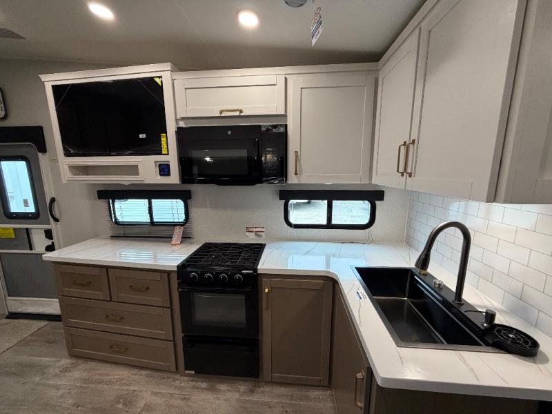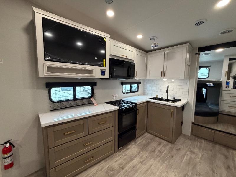With any Eagle HT fifth wheel or travel trailer by Jayco you will enjoy a smooth drive thanks to the 4 Star Handling Package and MORryde CRE-3000 rubberized suspension. The Customer Value Package includes amenities that are sure to make camping easier than ever, like the 60K on-demand water heater, Keyed-Alike lock system, 15,000 BTU "Whisper Quiet" A/C, and more. Handcrafted door/drawer fronts will make your space feel more like home, along with residential vinyl flooring throughout, GE appliances, and blackout roller shades with reflective side throughout to keep the sun out when you want to sleep in. Each model also includes a NuVo H2O water treatment system with filters included, interior and exterior "Blue Sync" audio connect with MB Quart Sound for your TV and phone, and 100% no floor vents for added comfort and convenience!