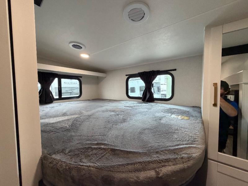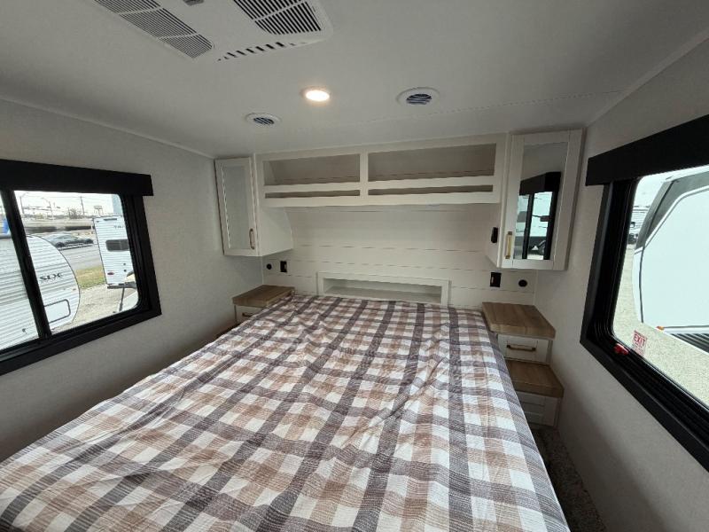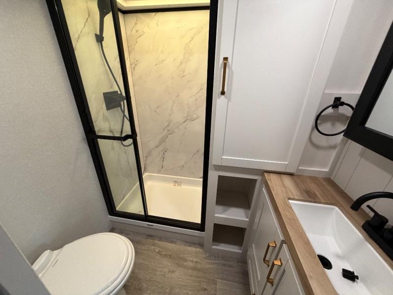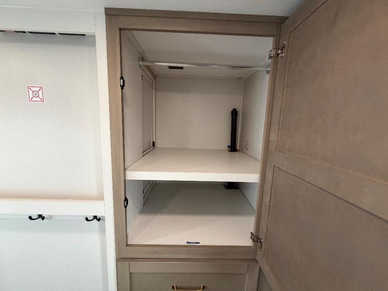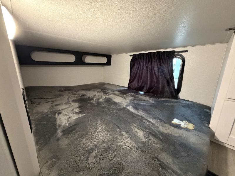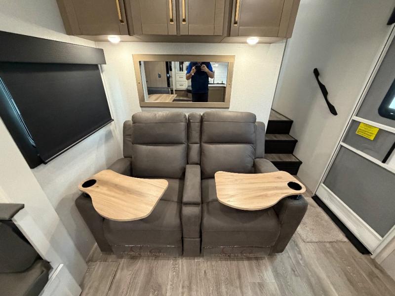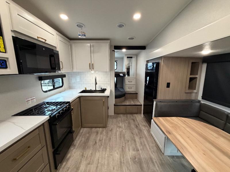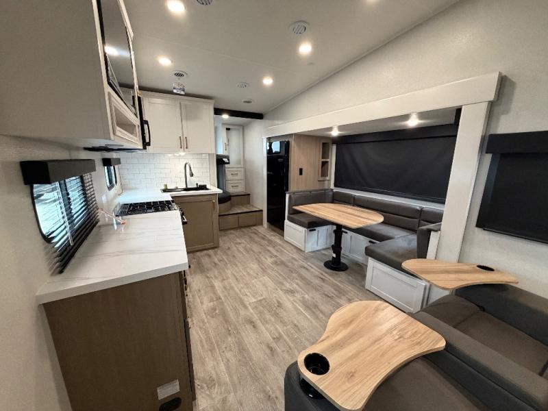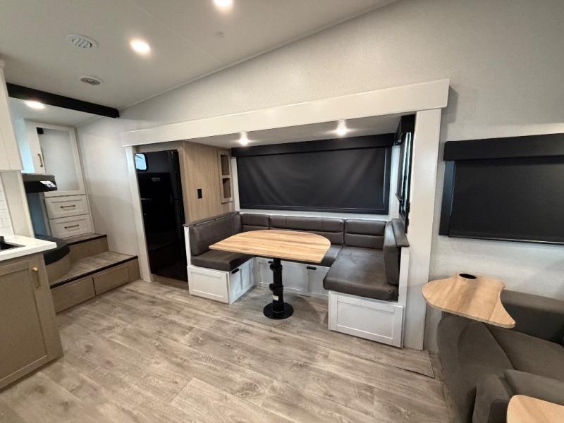 If you're needing a fifth wheel with more sleeping space, this unit will be perfect for you! There are double-size bunks in the back with a wardrobe for your guests' things and TV prep if you want to add a TV here. The front private bedroom up front will have you feeling right at home with its Olympic queen bed and dual wardrobes, and any additional guests you have can sleep on the U-shaped dinette within the slide out. There is also a theater seat here where you can relax with a good book in the evenings.
