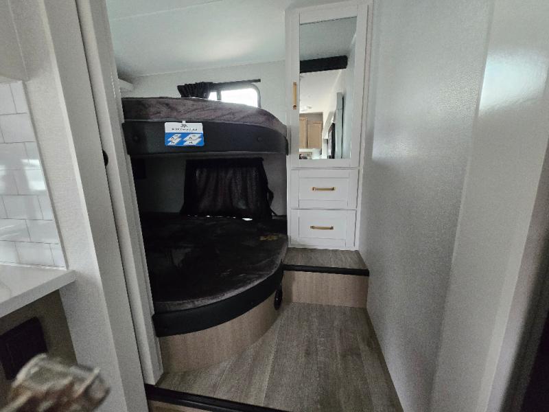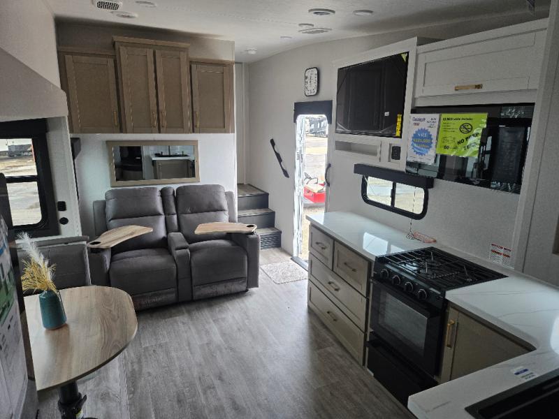 If you're needing a fifth wheel with more sleeping space, this unit will be perfect for you! There are double-size bunks in the back with a wardrobe for your guests' things and TV prep if you want to add a TV here. The front private bedroom up front will have you feeling right at home with its Olympic queen bed and dual wardrobes, and any additional guests you have can sleep on the U-shaped dinette within the slide out. There is also a theater seat here where you can relax with a good book in the evenings.