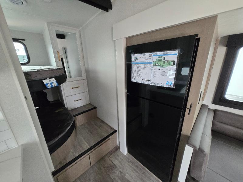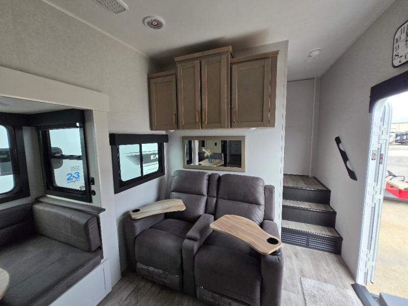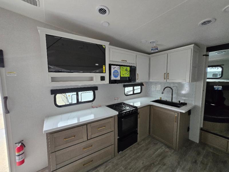 With any Eagle HT fifth wheel or travel trailer by Jayco you will enjoy a smooth drive thanks to the 4 Star Handling Package and MORryde CRE-3000 rubberized suspension. The Customer Value Package includes amenities that are sure to make camping easier than ever, like the 60K on-demand water heater, Keyed-Alike lock system, 15,000 BTU "Whisper Quiet" A/C, and more. Handcrafted door/drawer fronts will make your space feel more like home, along with residential vinyl flooring throughout, GE appliances, and blackout roller shades with reflective side throughout to keep the sun out when you want to sleep in. Each model also includes a NuVo H2O water treatment system with filters included, interior and exterior "Blue Sync" audio connect with MB Quart Sound for your TV and phone, and 100% no floor vents for added comfort and convenience!