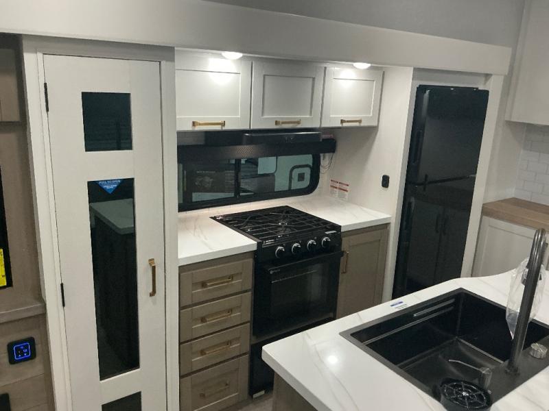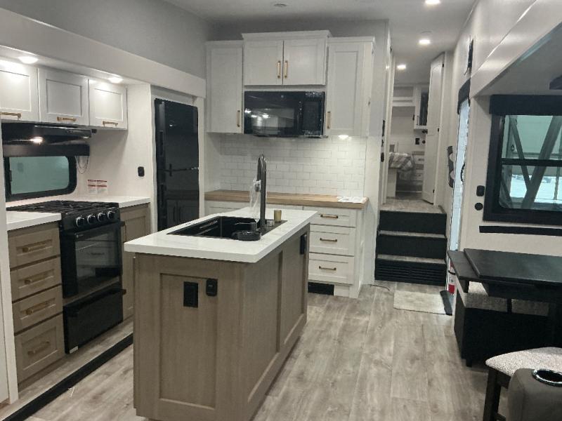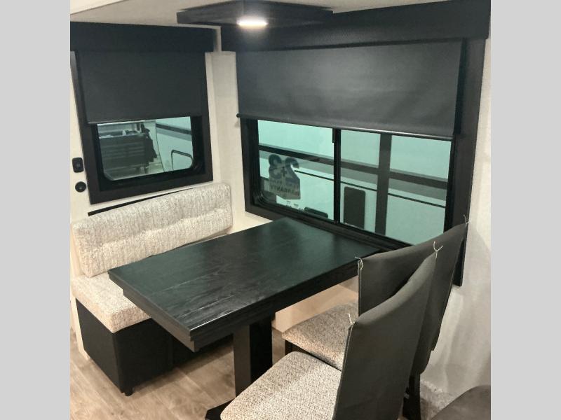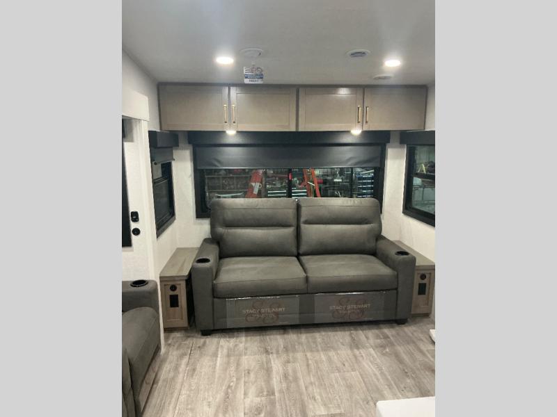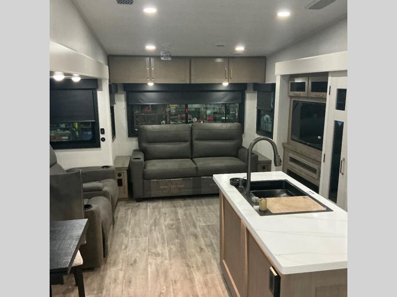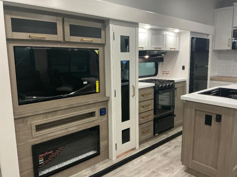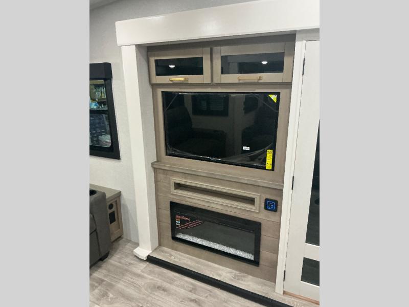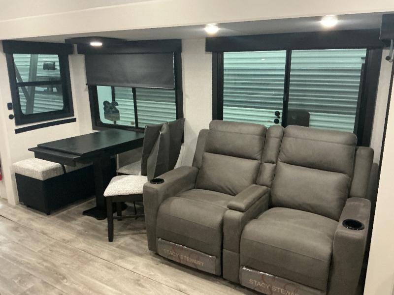 You will love how much interior space you have in this fifth wheel thanks to the dual opposing slides in the combined kitchen and living area! While your crew is relaxing on the theater seat or tri-fold sofa, you can prepare dinner on the GE black and stainless 21" range. There is also an entertainment center and fireplace across from the theater seat for easy viewing, and the table and chairs with a bench will be the perfect place to play a board game at. Head to the front to enjoy the private bedroom with an Olympic queen bed, and the full bath is close by for easy nighttime use!