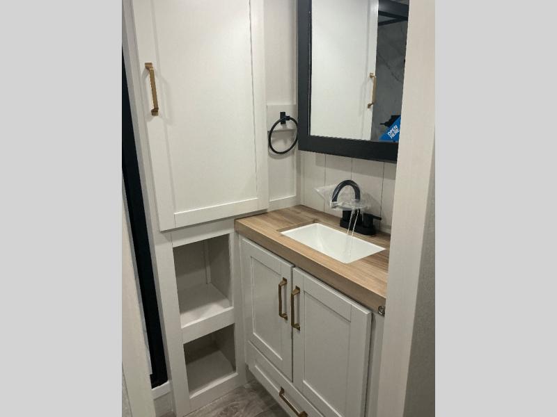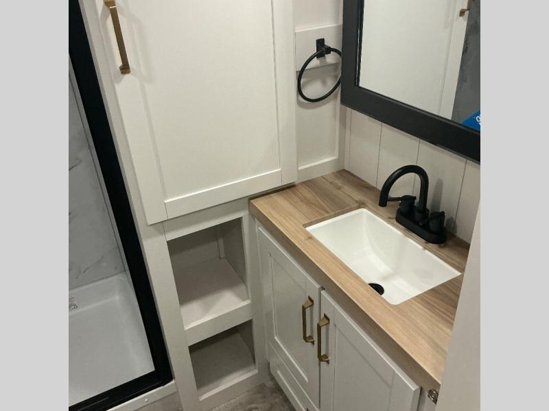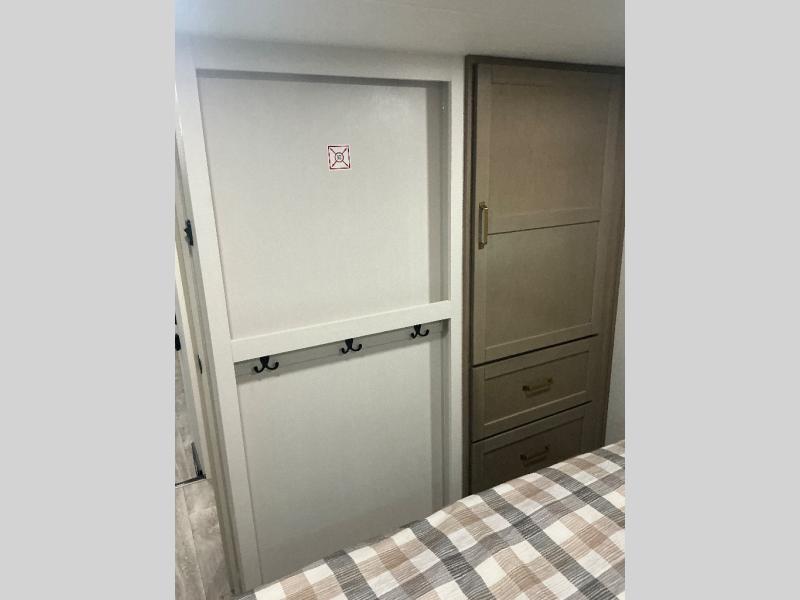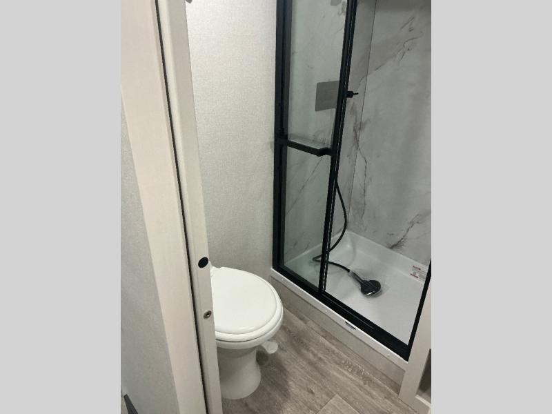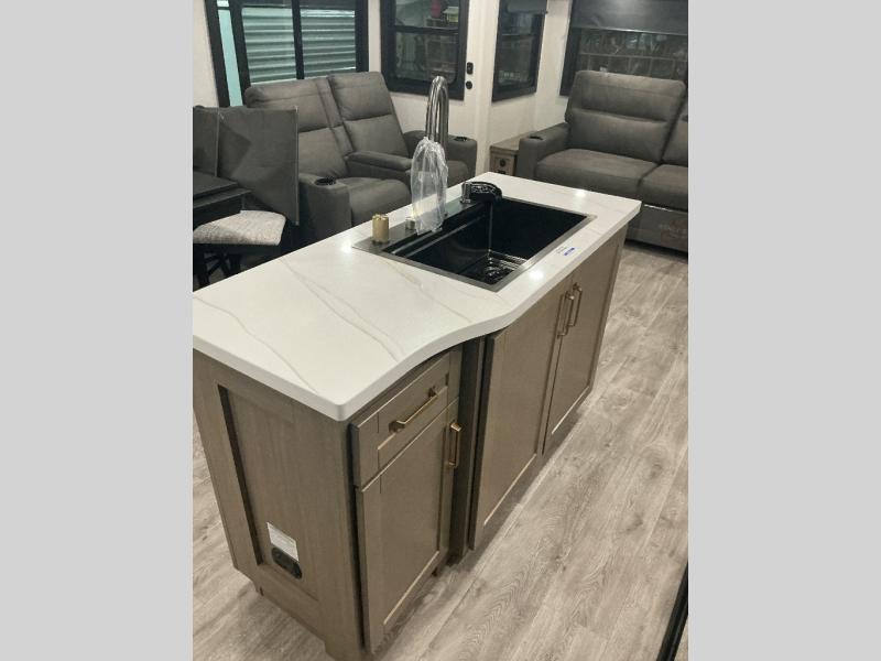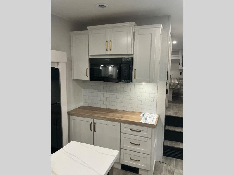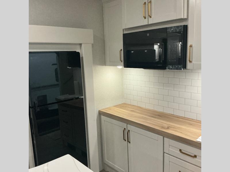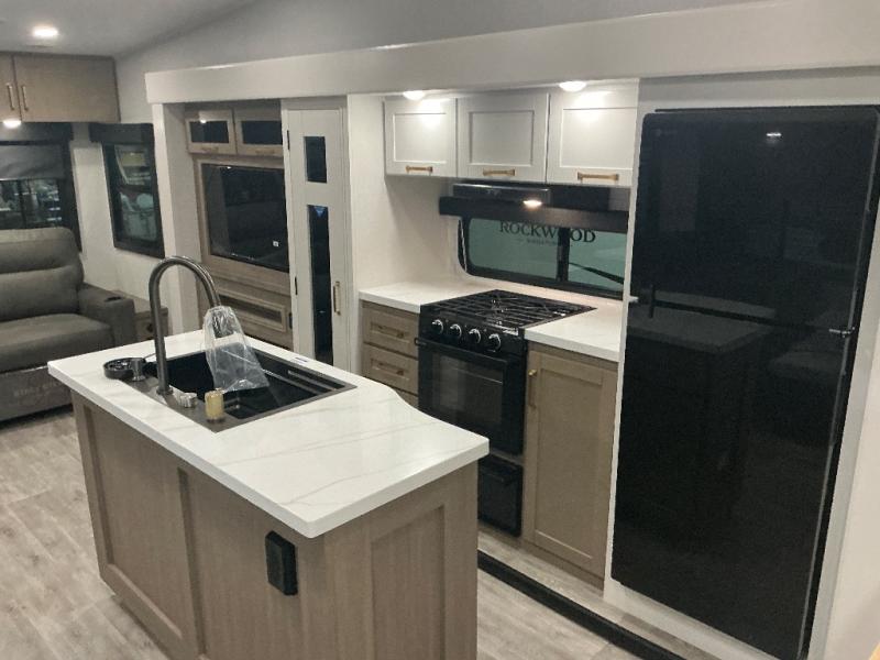 You will love how much interior space you have in this fifth wheel thanks to the dual opposing slides in the combined kitchen and living area! While your crew is relaxing on the theater seat or tri-fold sofa, you can prepare dinner on the GE black and stainless 21" range. There is also an entertainment center and fireplace across from the theater seat for easy viewing, and the table and chairs with a bench will be the perfect place to play a board game at. Head to the front to enjoy the private bedroom with an Olympic queen bed, and the full bath is close by for easy nighttime use!