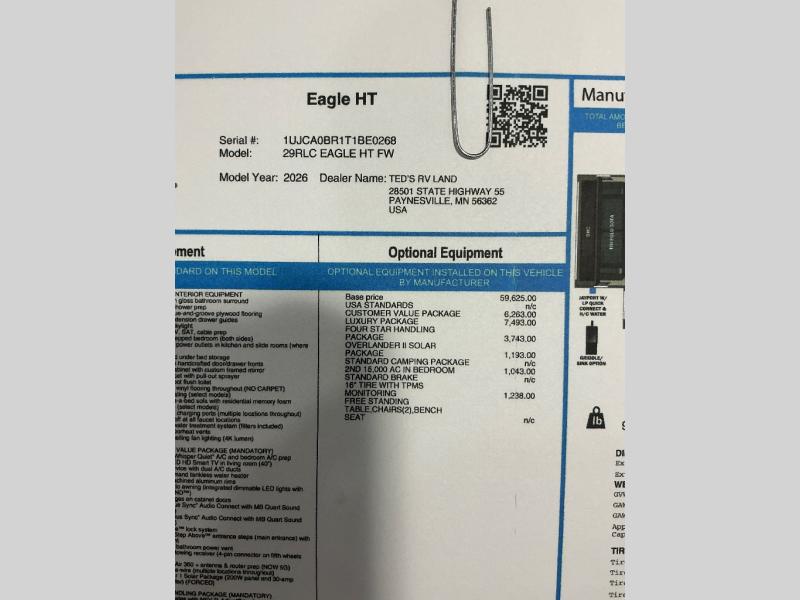 With any Eagle HT fifth wheel or travel trailer by Jayco you will enjoy a smooth drive thanks to the 4 Star Handling Package, Goodyear Endurance tires, and MORryde CRE-3000 rubberized suspension. The Customer Value Package includes amenities that are sure to make camping easier than ever, like the 60K on-demand water heater, Keyed-Alike lock system, 15,000 BTU "Whisper Quiet" A/C, and more. Handcrafted and glazed door/drawer fronts will make your space feel more like home, along with residential vinyl flooring throughout, GE appliances, and blackout roller shades with reflective side throughout to keep the sun out when you want to sleep in. Each model also includes a NuVo H2O water treatment system with filters included, interior and exterior "Blue Sync" audio connect with MB Quart Sound for your TV and phone, and 100% no floor vents for added comfort and convenience!