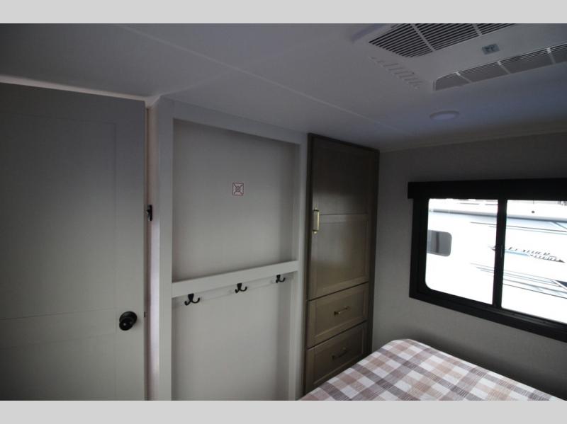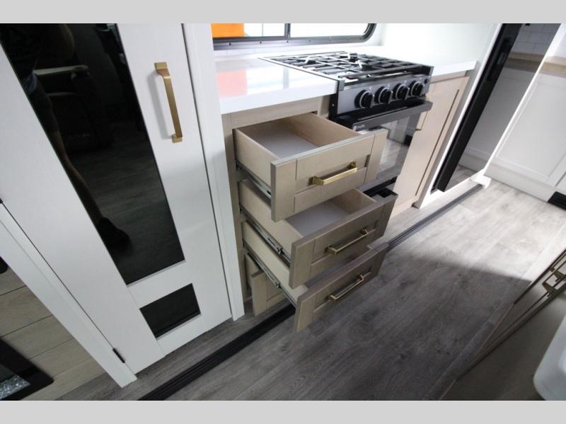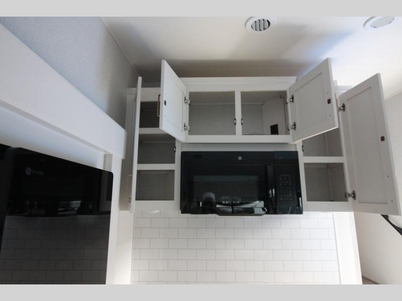 You will love how much interior space you have in this fifth wheel thanks to the dual opposing slides in the combined kitchen and living area! While your crew is relaxing on the theater seat or tri-fold sofa, you can prepare dinner on the GE black and stainless 21" range. There is also an entertainment center and fireplace across from the theater seat for easy viewing, and the table and chairs with a bench will be the perfect place to play a board game at. Head to the front to enjoy the private bedroom with an Olympic queen bed, and the full bath is close by for easy nighttime use!