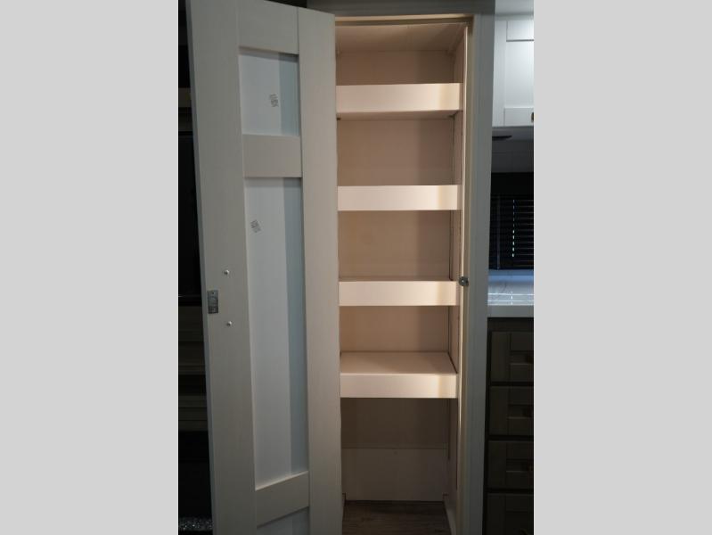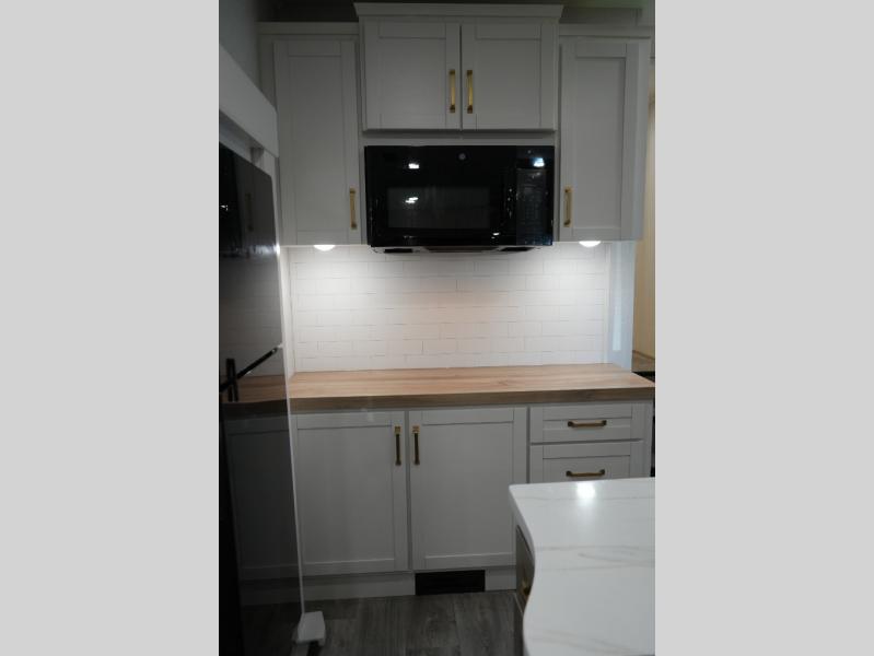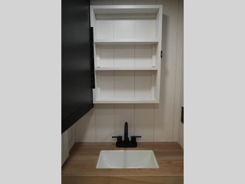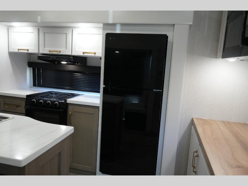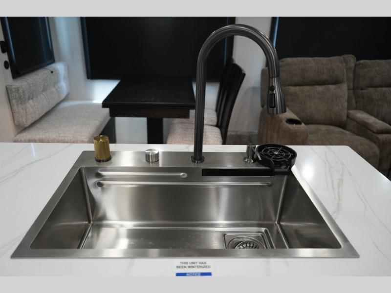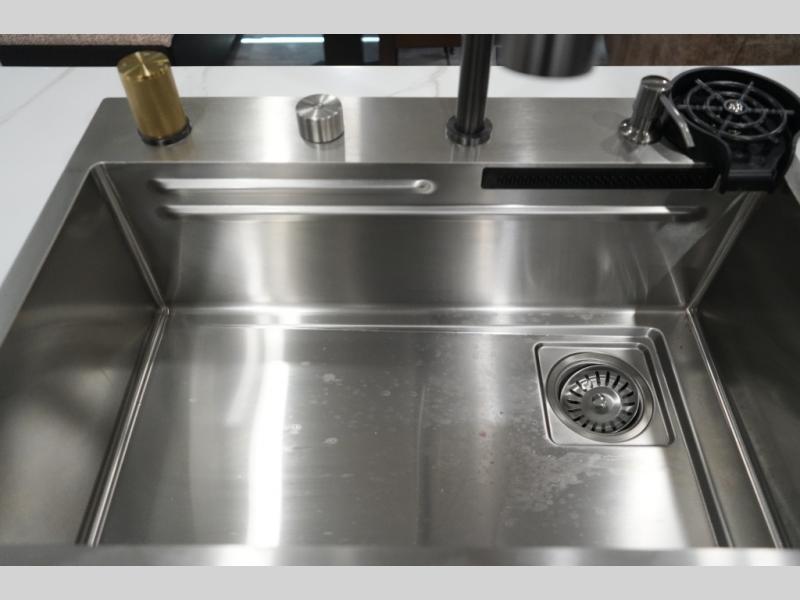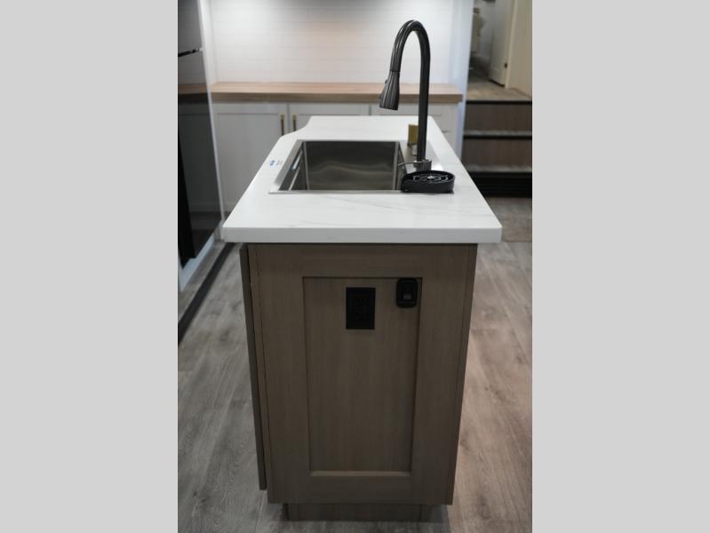 Modern Kitchen Island with a multi-functional sink, GE 10 cu. ft. 12V refrigerator, pantry, and a stylish hutch for added storage