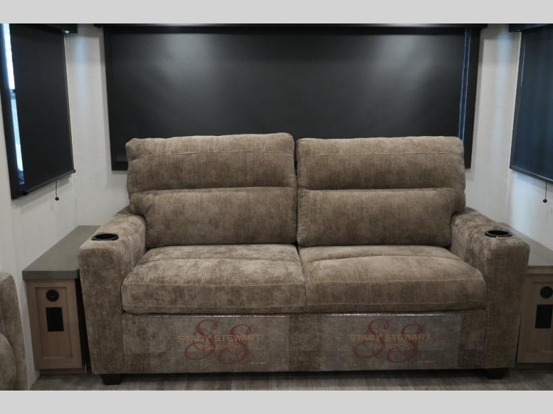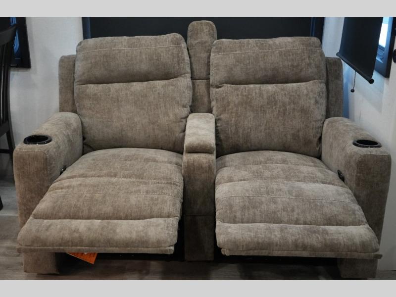 Theater Seating & Tri-Fold Sofa across from the entertainment center with fireplace for cozy movie nights