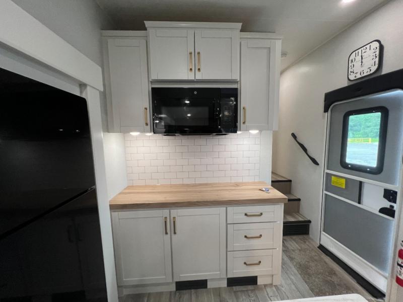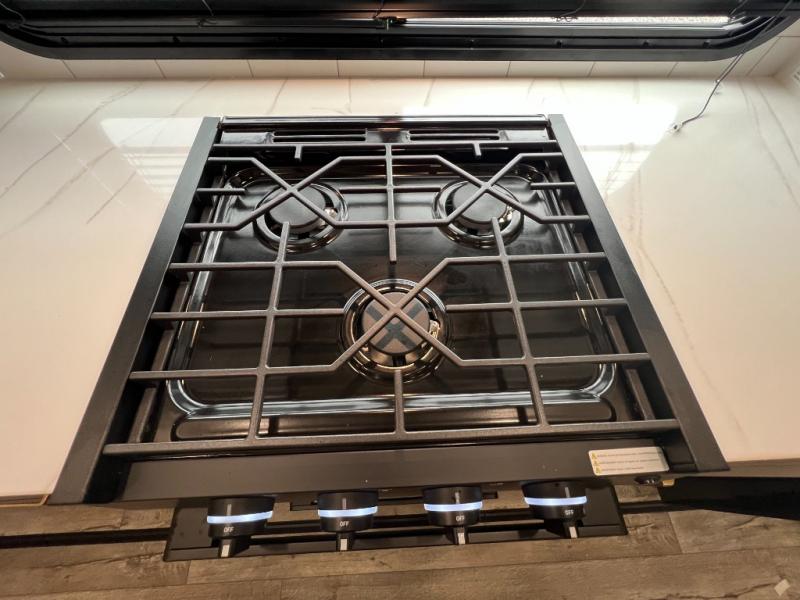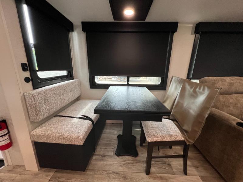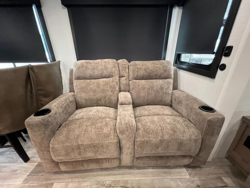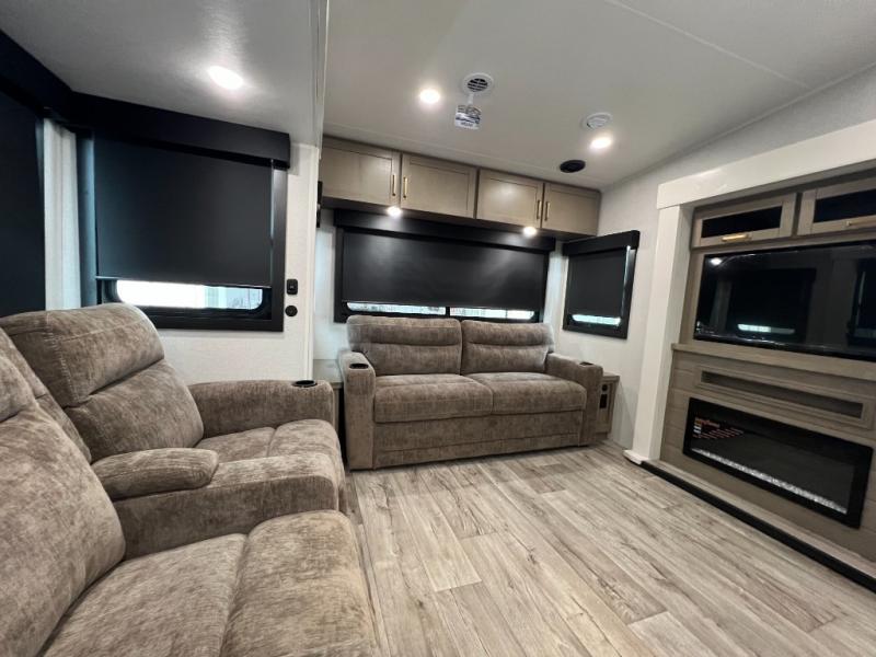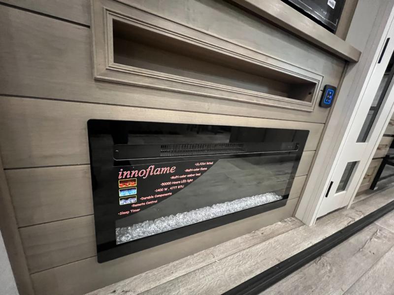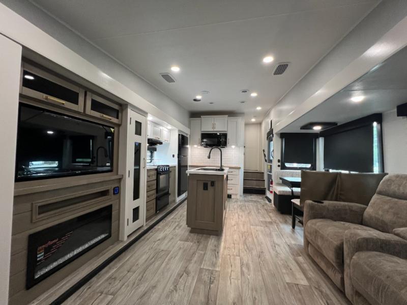 You will love how much interior space you have in this fifth wheel thanks to the dual opposing slides in the combined kitchen and living area! While your crew is relaxing on the theater seat or tri-fold sofa, you can prepare dinner on the GE black and stainless 21" range. There is also an entertainment center and fireplace across from the theater seat for easy viewing, and the table and chairs with a bench will be the perfect place to play a board game at. Head to the front to enjoy the private bedroom with an Olympic queen bed, and the full bath is close by for easy nighttime use!