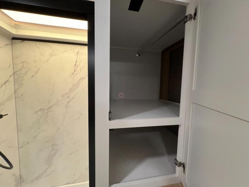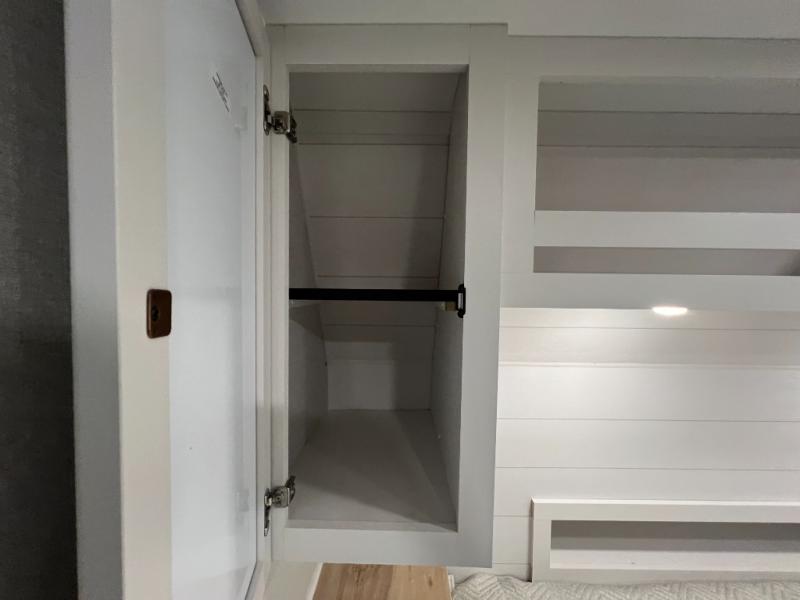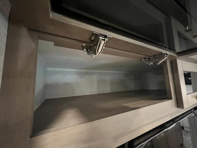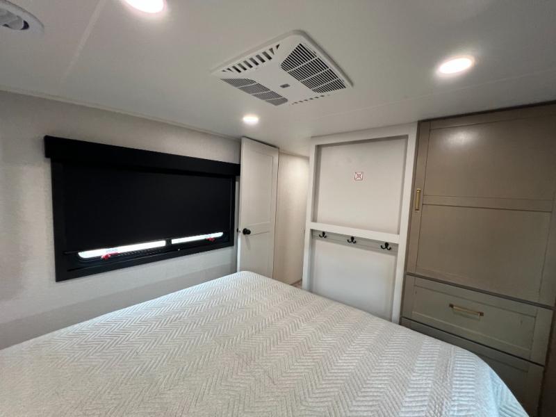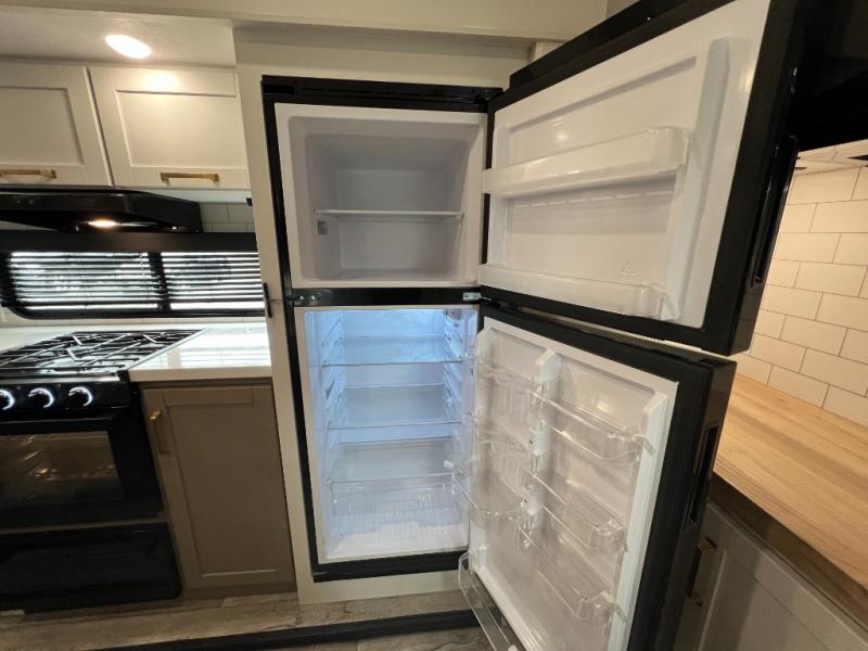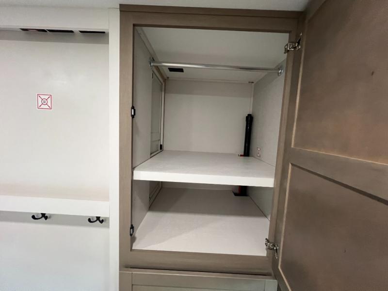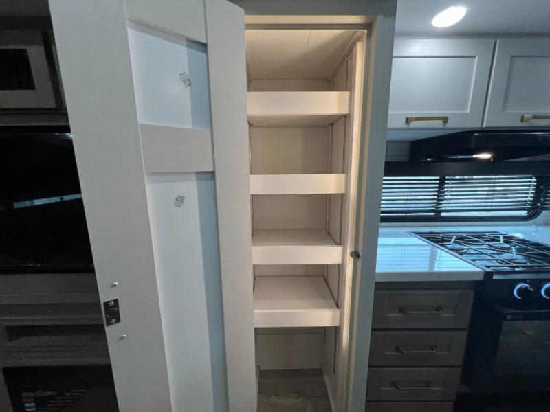 You will love how much interior space you have in this fifth wheel thanks to the dual opposing slides in the combined kitchen and living area! While your crew is relaxing on the theater seat or tri-fold sofa, you can prepare dinner on the GE black and stainless 21" range. There is also an entertainment center and fireplace across from the theater seat for easy viewing, and the table and chairs with a bench will be the perfect place to play a board game at. Head to the front to enjoy the private bedroom with an Olympic queen bed, and the full bath is close by for easy nighttime use!