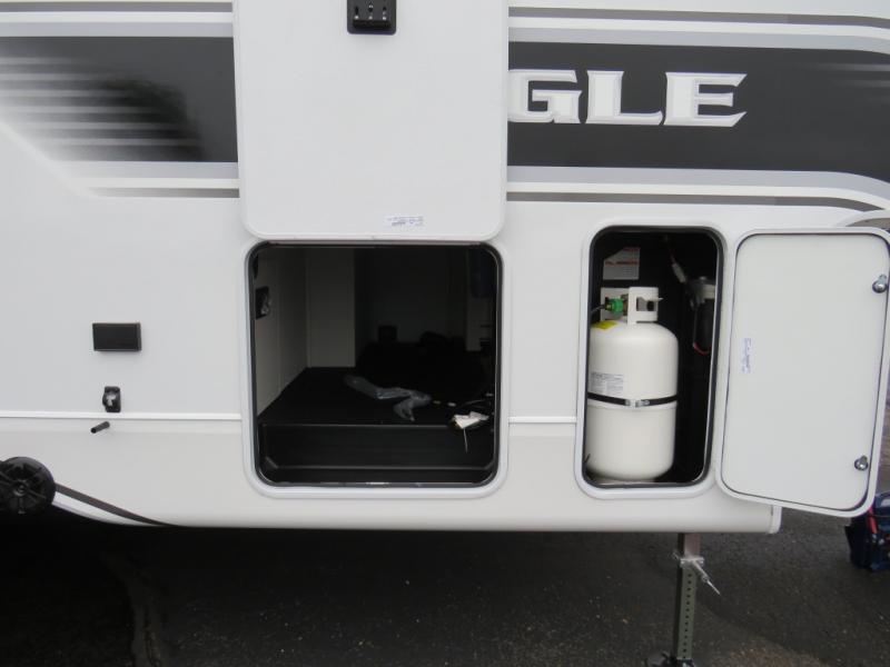 With any Eagle HT fifth wheel or travel trailer by Jayco you will enjoy a smooth drive thanks to the 4 Star Handling Package, Goodyear Endurance tires, and MORryde CRE-3000 rubberized suspension. The Customer Value Package includes amenities that are sure to make camping easier than ever, like the 60K on-demand water heater, Keyed-Alike lock system, 15,000 BTU "Whisper Quiet" A/C, and more. Handcrafted and glazed door/drawer fronts will make your space feel more like home, along with residential vinyl flooring throughout, GE appliances, and blackout roller shades with reflective side throughout to keep the sun out when you want to sleep in. Each model also includes a NuVo H2O water treatment system with filters included, interior and exterior "Blue Sync" audio connect with MB Quart Sound for your TV and phone, and 100% no floor vents for added comfort and convenience!