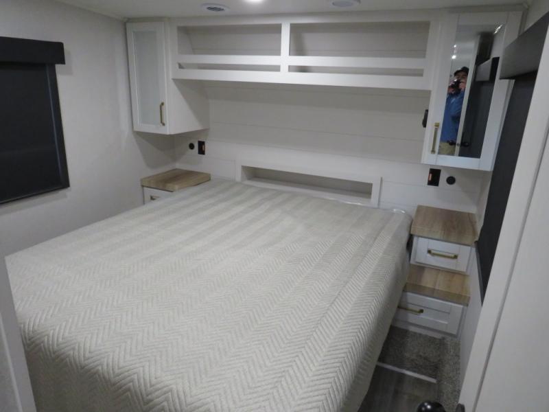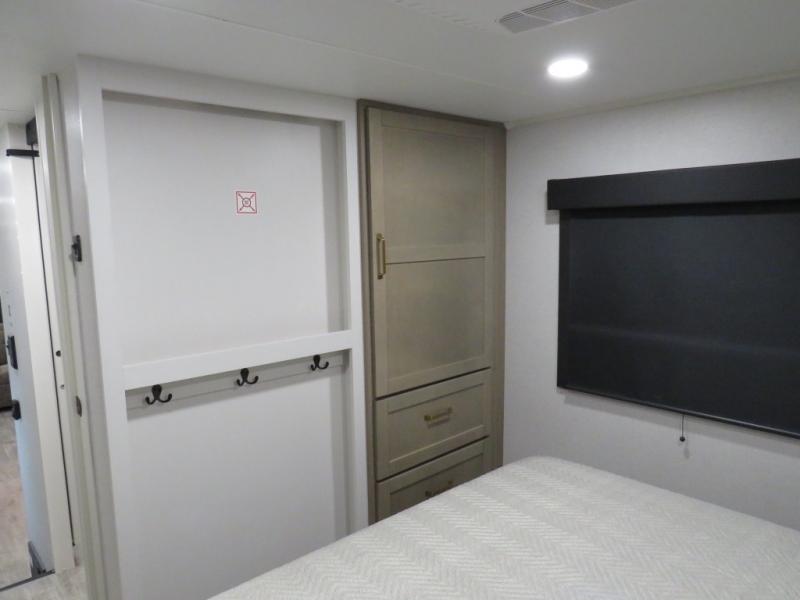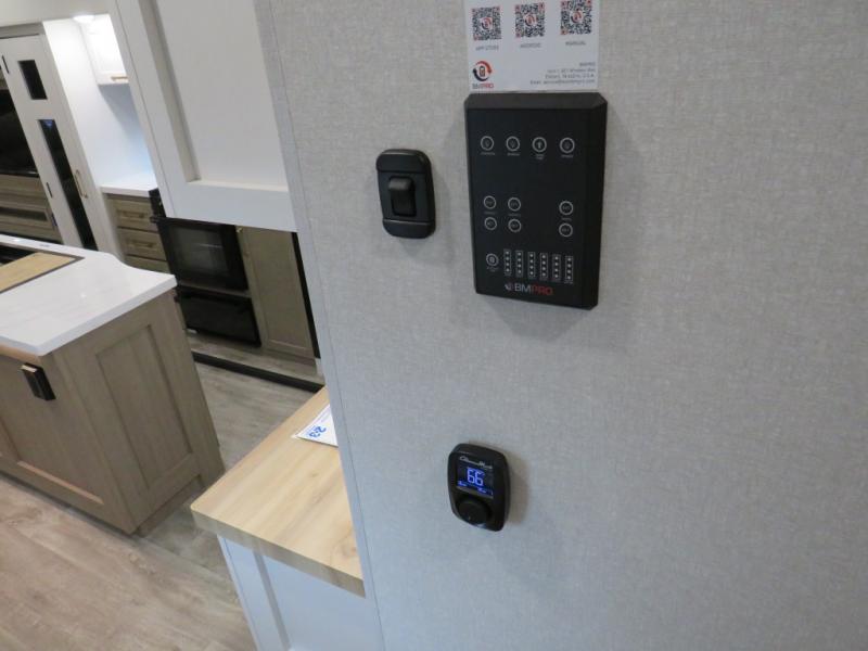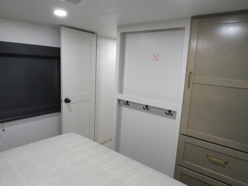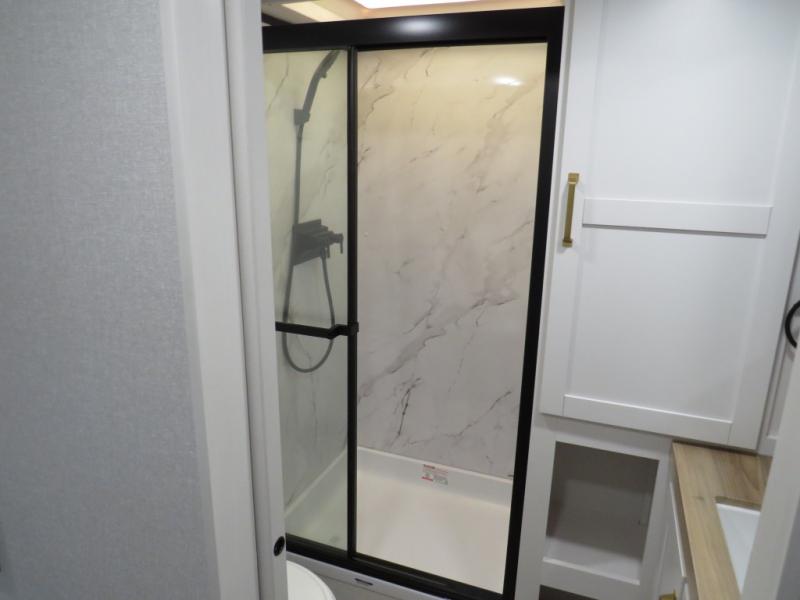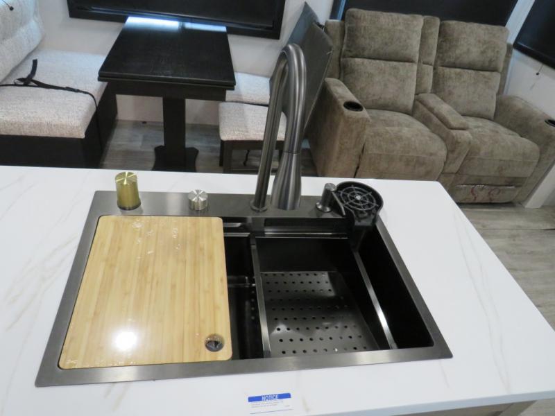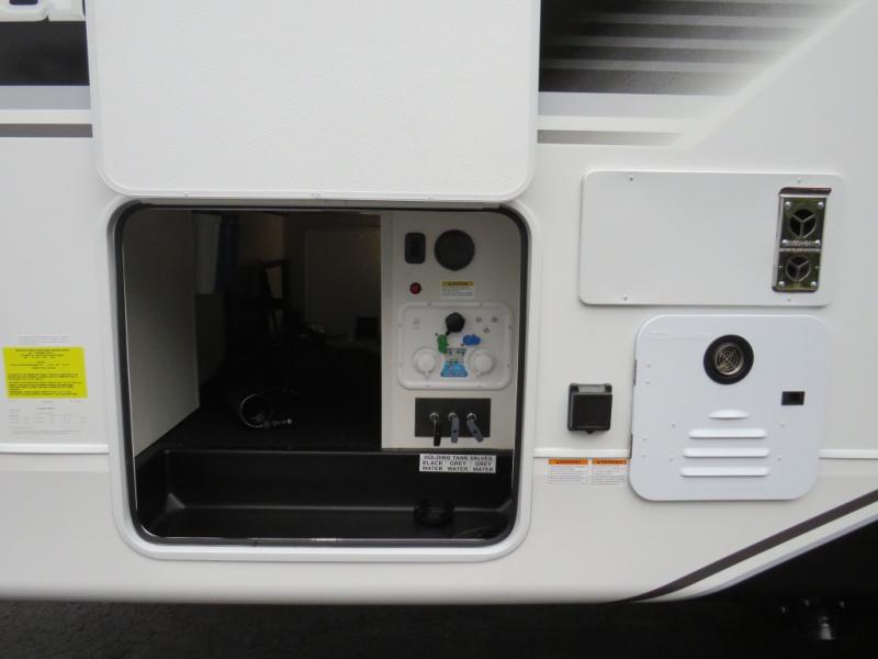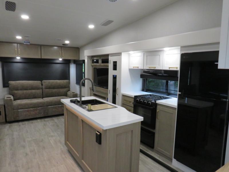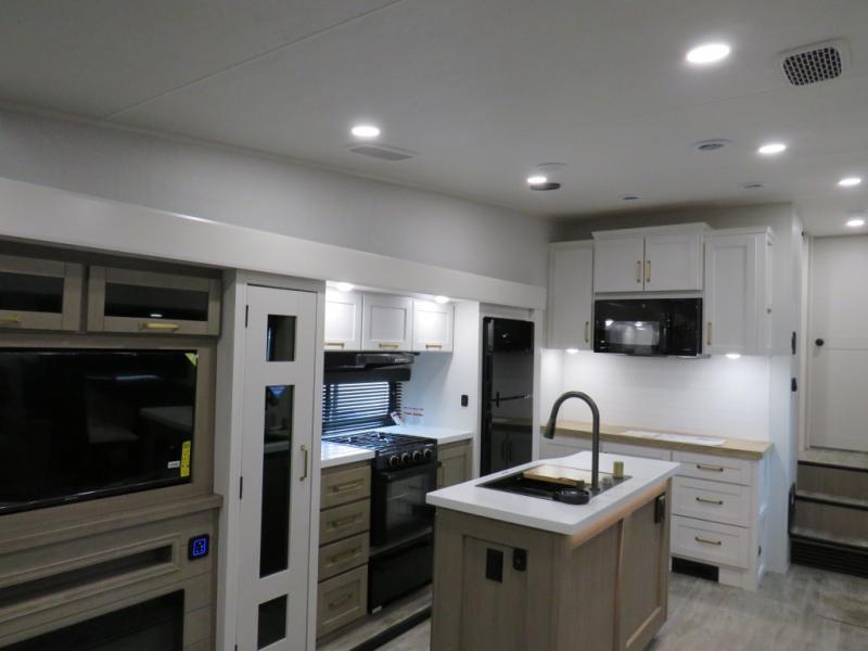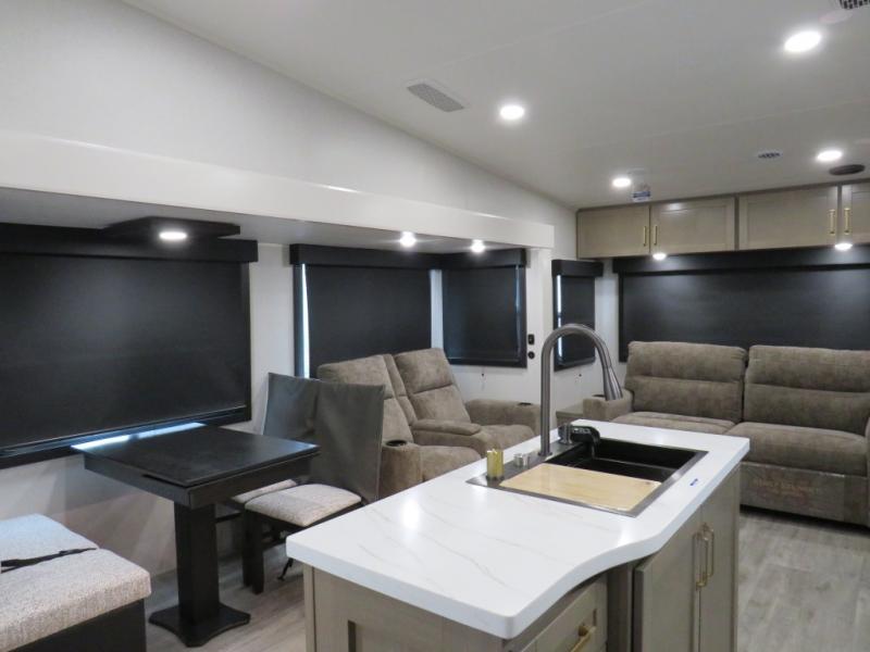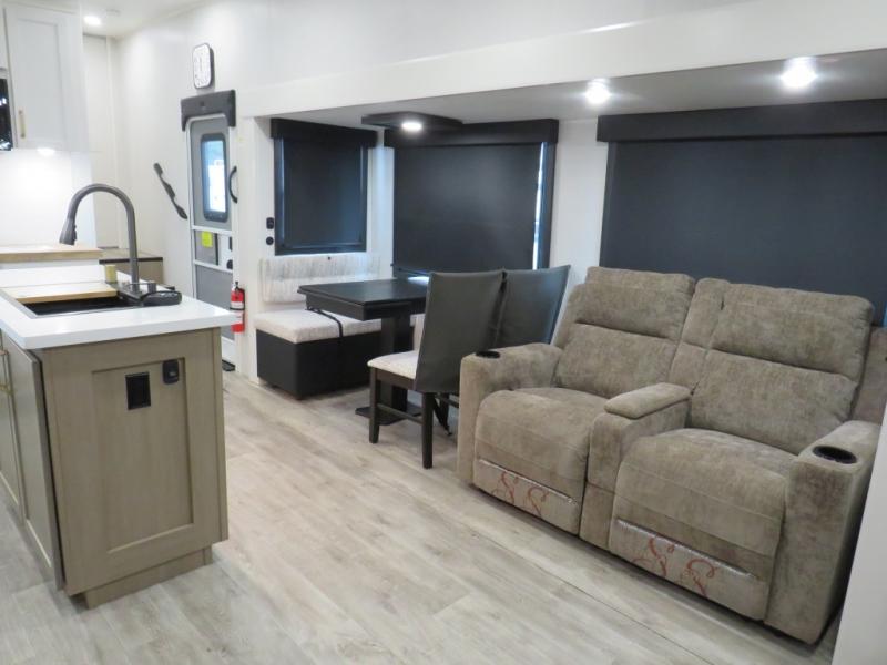 You will love how much interior space you have in this fifth wheel thanks to the dual opposing slides in the combined kitchen and living area! While your crew is relaxing on the theater seat or tri-fold sofa, you can prepare dinner on the GE black and stainless 21" range. There is also an entertainment center and fireplace across from the theater seat for easy viewing, and the table and chairs with a bench will be the perfect place to play a board game at. Head to the front to enjoy the private bedroom with an Olympic queen bed, and the full bath is close by for easy nighttime use!