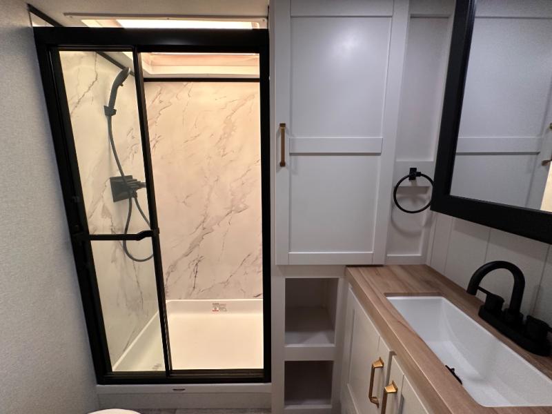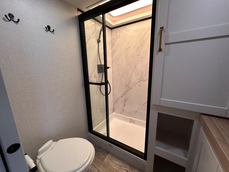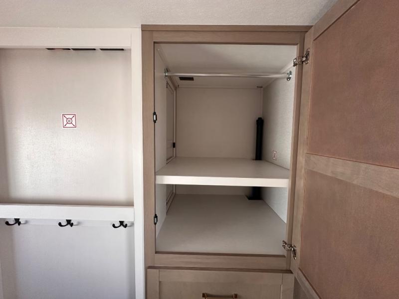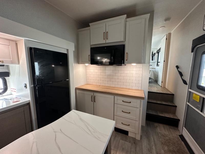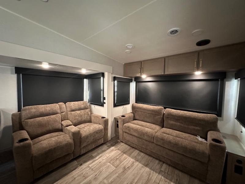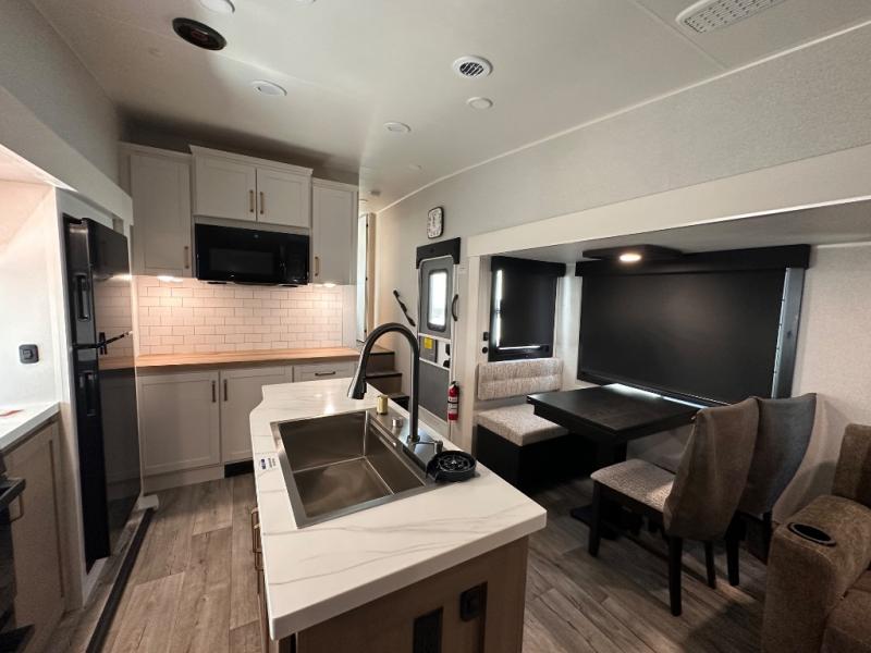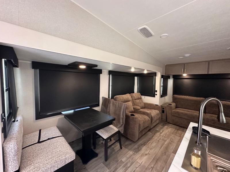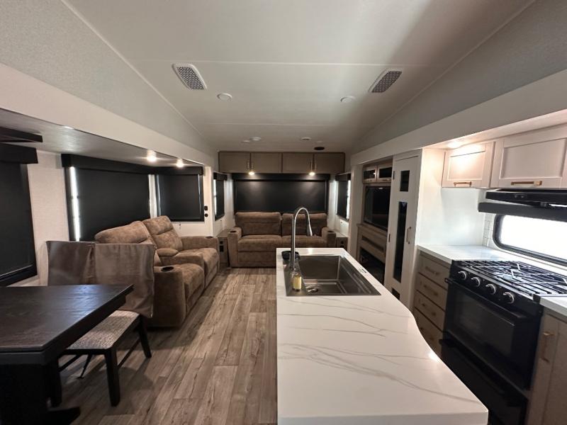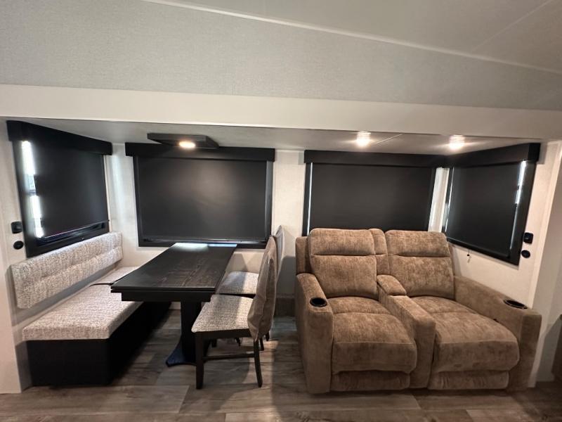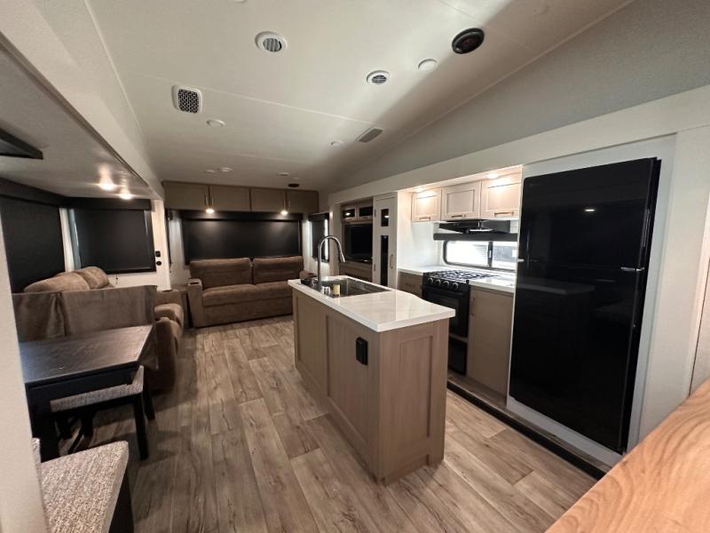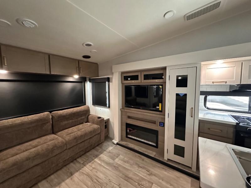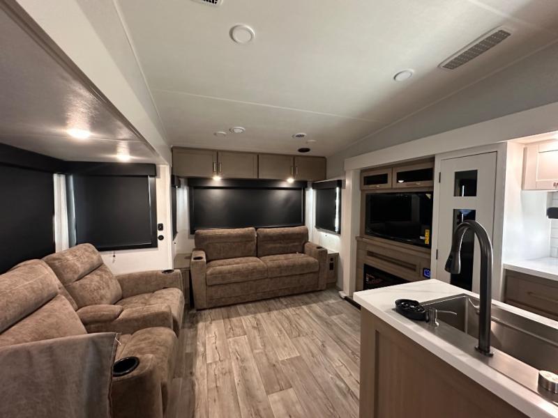 You will love how much interior space you have in this fifth wheel thanks to the dual opposing slides in the combined kitchen and living area! While your crew is relaxing on the theater seat or tri-fold sofa, you can prepare dinner on the GE black and stainless 21" range. There is also an entertainment center and fireplace across from the theater seat for easy viewing, and the table and chairs with a bench will be the perfect place to play a board game at. Head to the front to enjoy the private bedroom with an Olympic queen bed, and the full bath is close by for easy nighttime use!