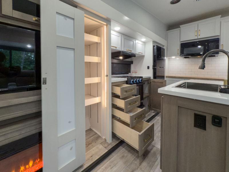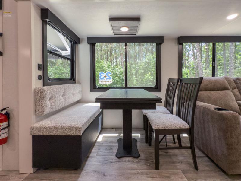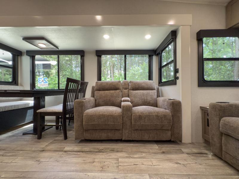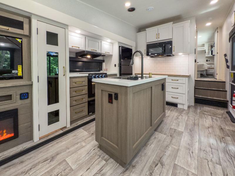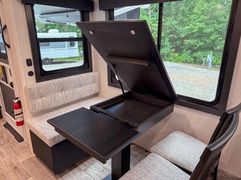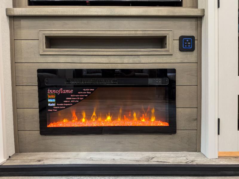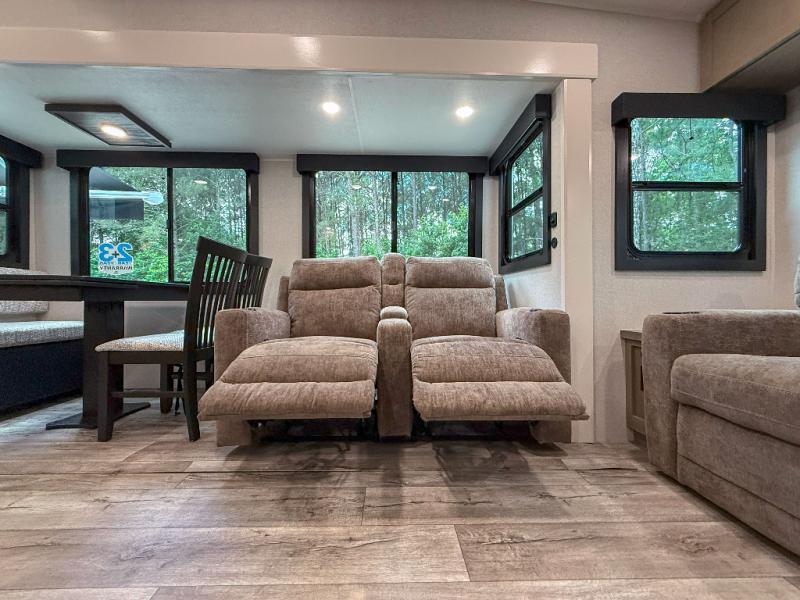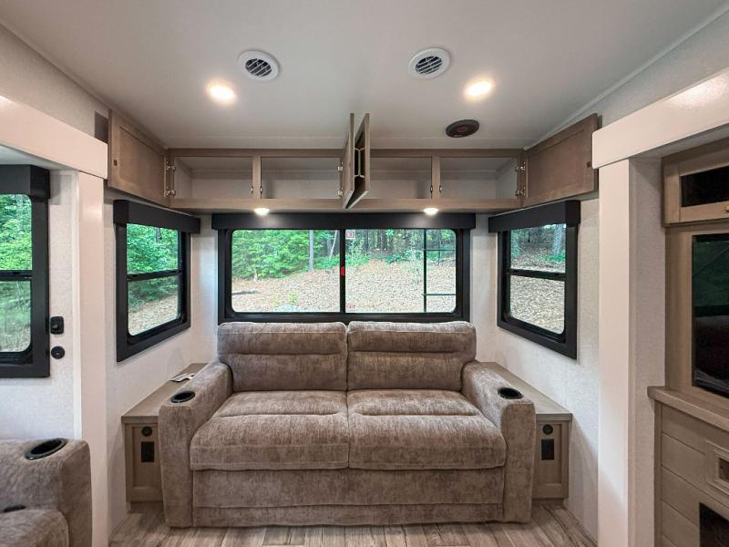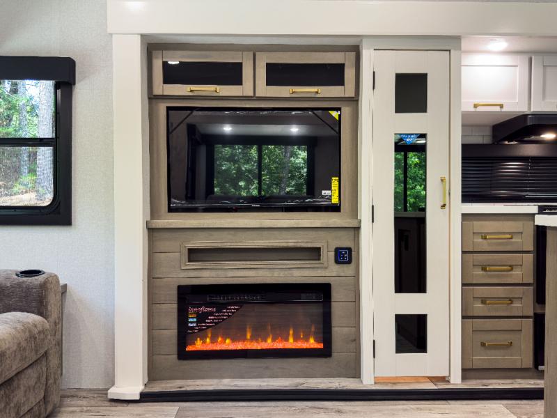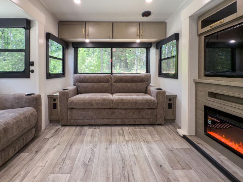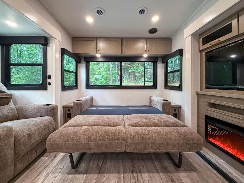 You will love how much interior space you have in this fifth wheel thanks to the dual opposing slides in the combined kitchen and living area! While your crew is relaxing on the theater seat or tri-fold sofa, you can prepare dinner on the GE black and stainless 21" range. There is also an entertainment center and fireplace across from the theater seat for easy viewing, and the table and chairs with a bench will be the perfect place to play a board game at. Head to the front to enjoy the private bedroom with an Olympic queen bed, and the full bath is close by for easy nighttime use!