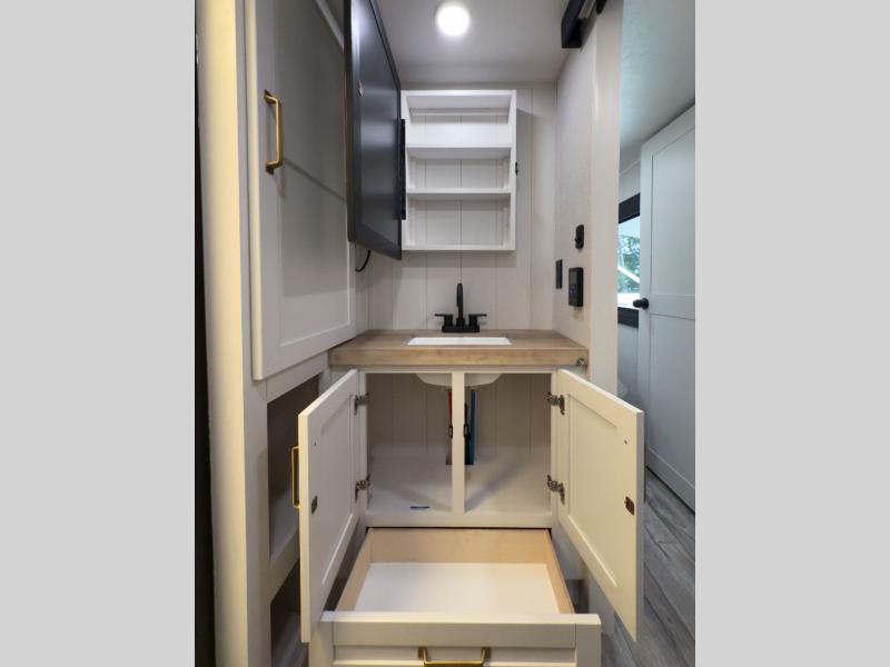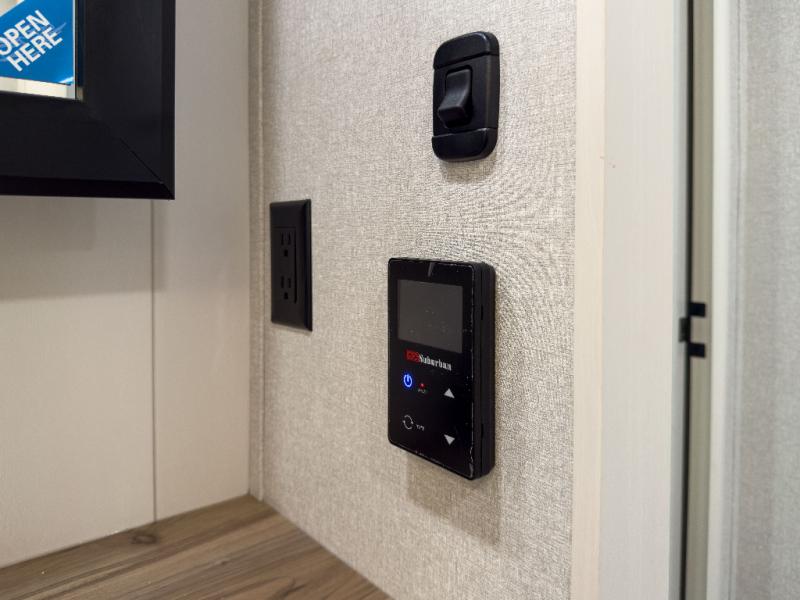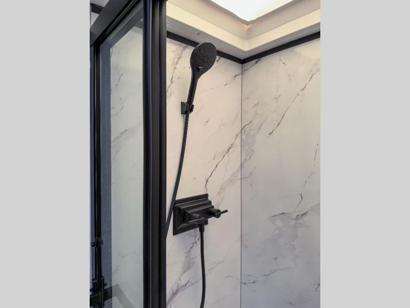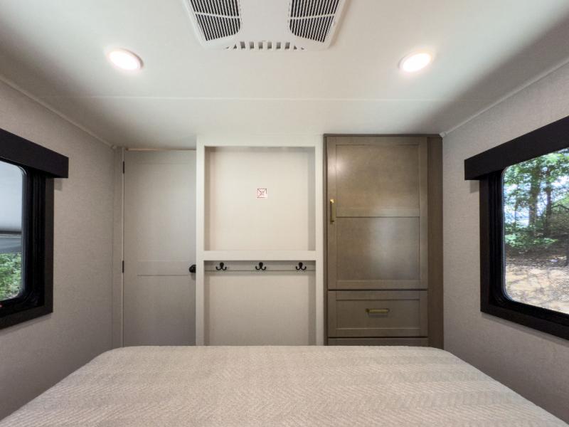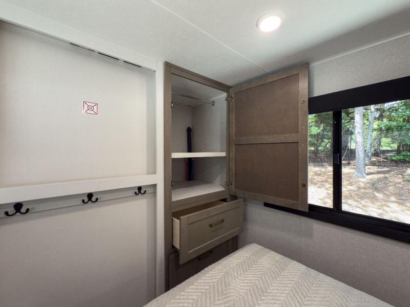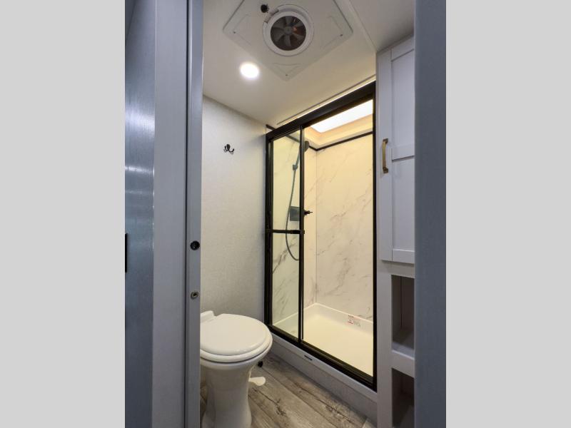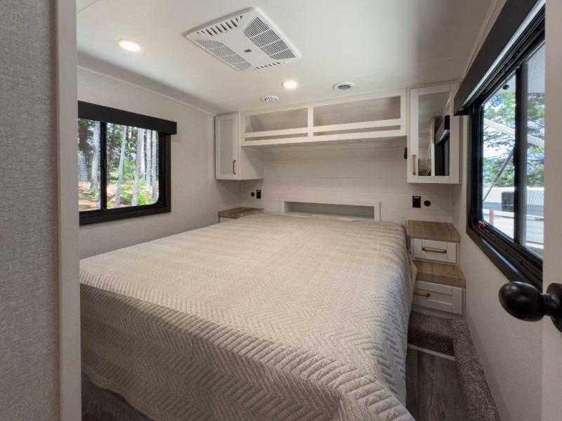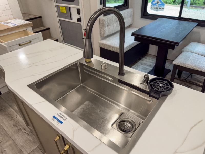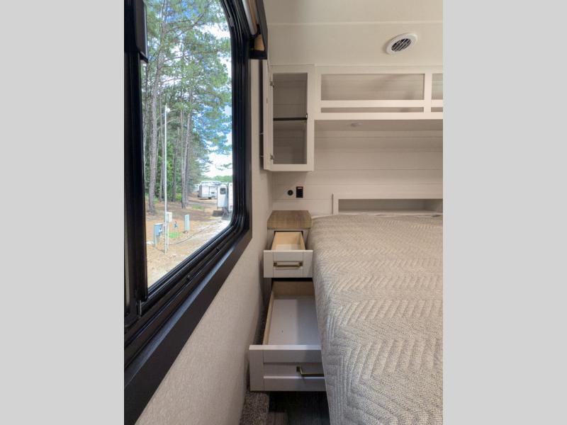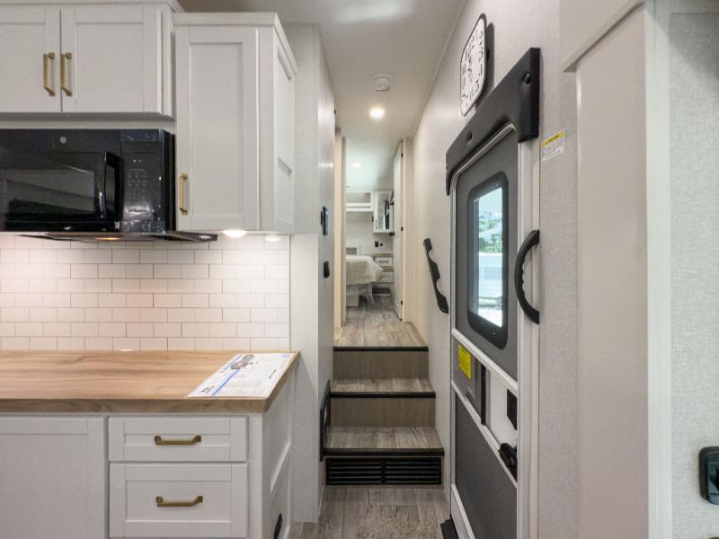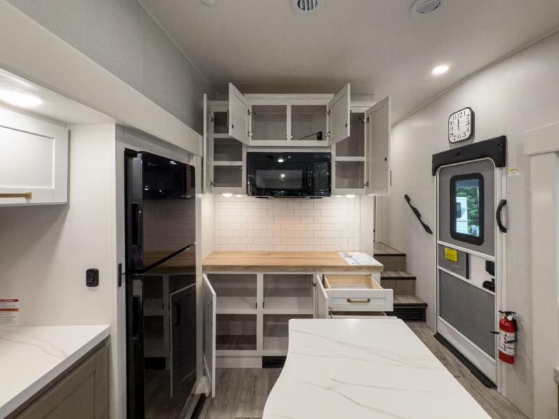 You will love how much interior space you have in this fifth wheel thanks to the dual opposing slides in the combined kitchen and living area! While your crew is relaxing on the theater seat or tri-fold sofa, you can prepare dinner on the GE black and stainless 21" range. There is also an entertainment center and fireplace across from the theater seat for easy viewing, and the table and chairs with a bench will be the perfect place to play a board game at. Head to the front to enjoy the private bedroom with an Olympic queen bed, and the full bath is close by for easy nighttime use!