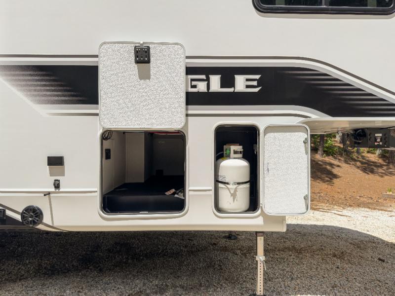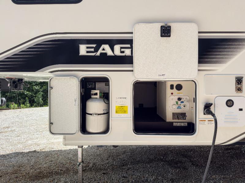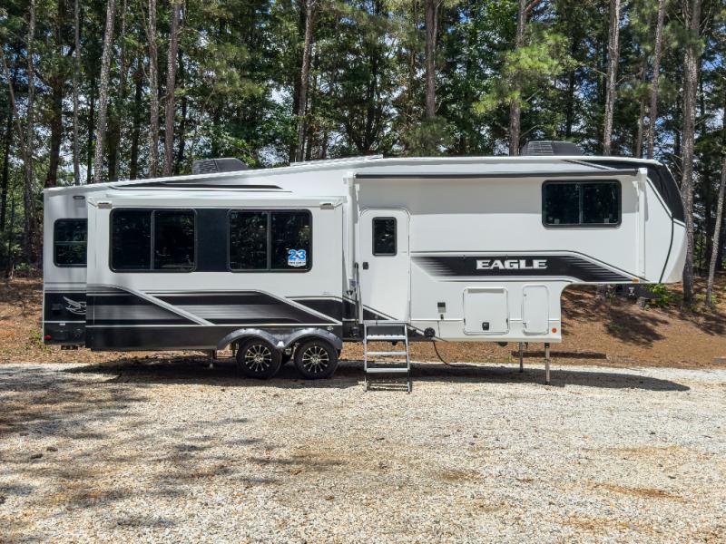 With any Eagle HT fifth wheel or travel trailer by Jayco you will enjoy a smooth drive thanks to the 4 Star Handling Package, Goodyear Endurance tires, and MORryde CRE-3000 rubberized suspension. The Customer Value Package includes amenities that are sure to make camping easier than ever, like the 60K on-demand water heater, Keyed-Alike lock system, 15,000 BTU "Whisper Quiet" A/C, and more. Handcrafted and glazed door/drawer fronts will make your space feel more like home, along with residential vinyl flooring throughout, GE appliances, and blackout roller shades with reflective side throughout to keep the sun out when you want to sleep in. Each model also includes a NuVo H2O water treatment system with filters included, interior and exterior "Blue Sync" audio connect with MB Quart Sound for your TV and phone, and 100% no floor vents for added comfort and convenience!