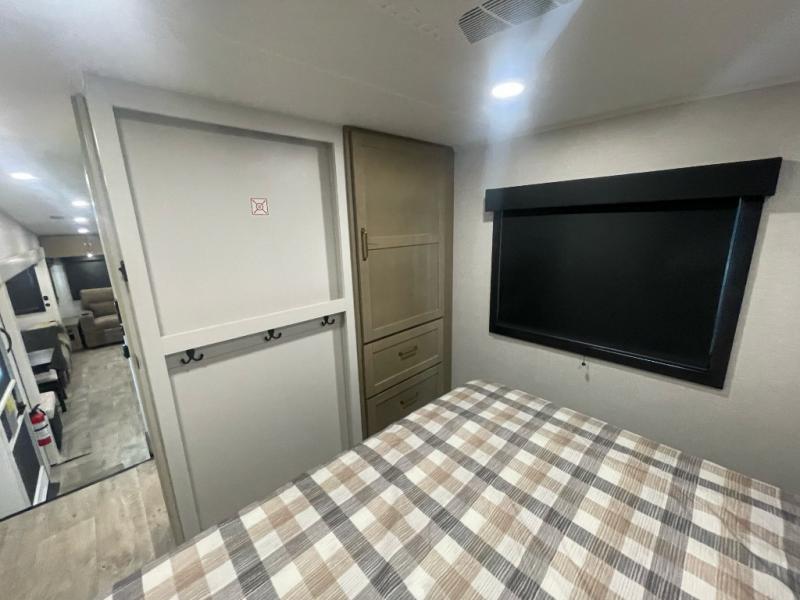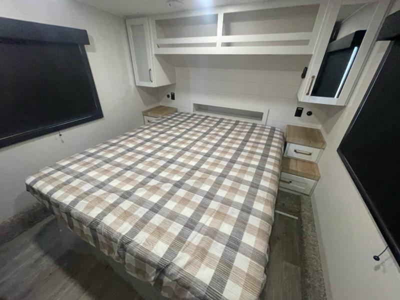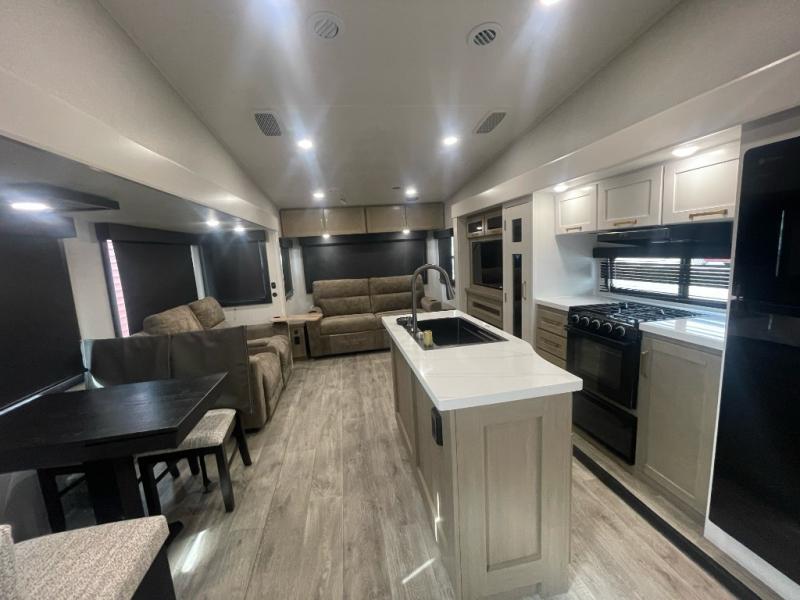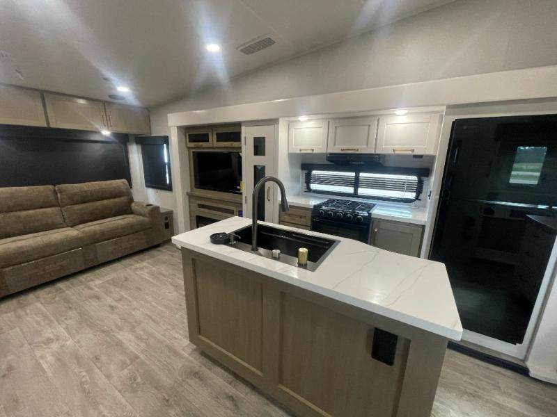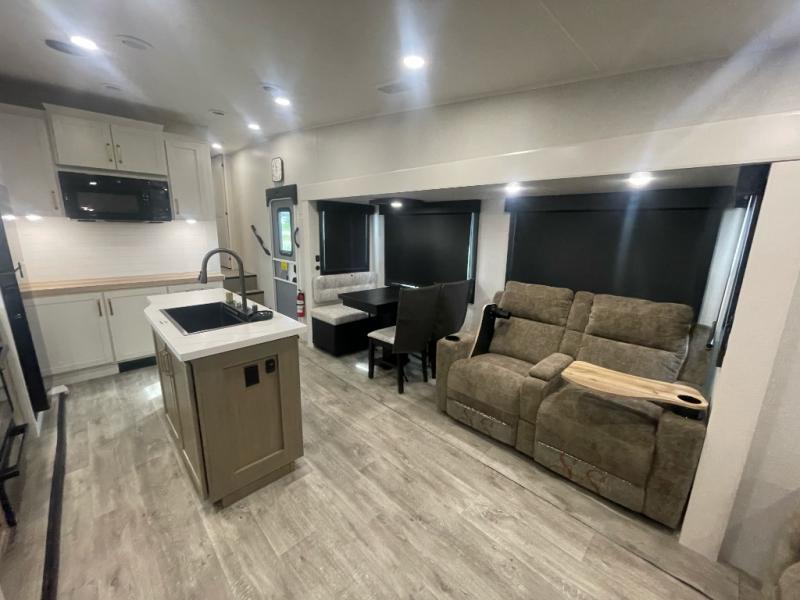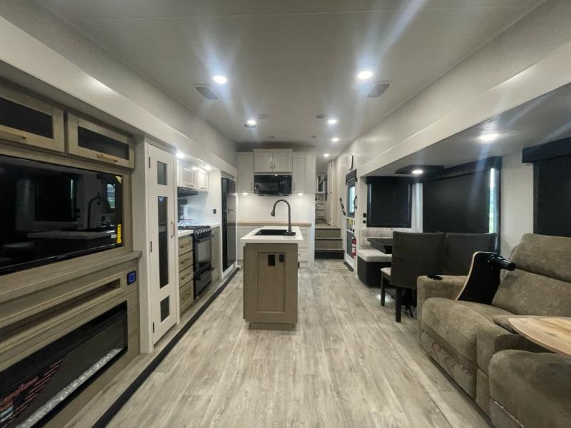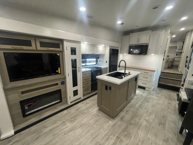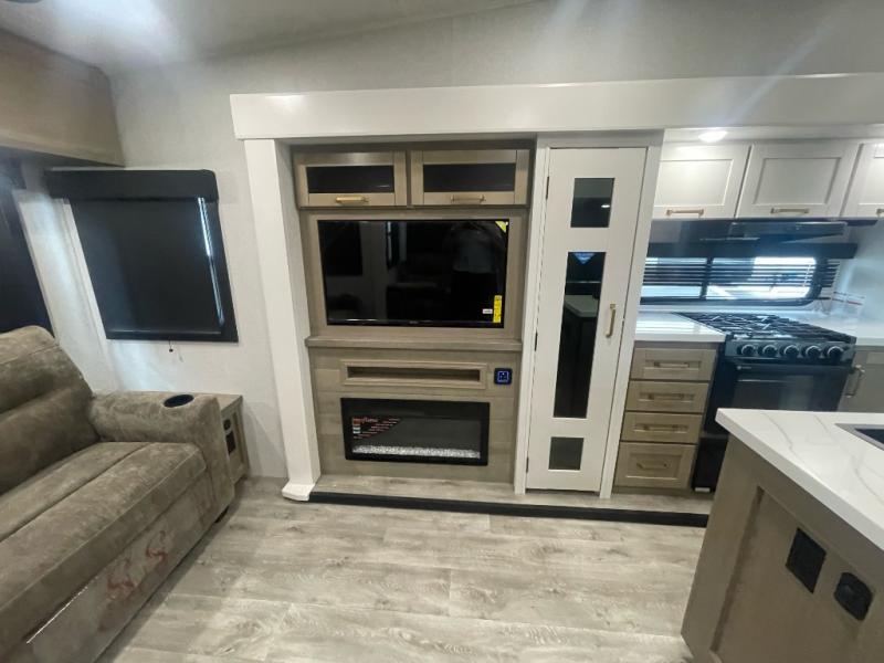 You will love how much interior space you have in this fifth wheel thanks to the dual opposing slides in the combined kitchen and living area! While your crew is relaxing on the theater seat or tri-fold sofa, you can prepare dinner on the GE black and stainless 21" range. There is also an entertainment center and fireplace across from the theater seat for easy viewing, and the table and chairs with a bench will be the perfect place to play a board game at. Head to the front to enjoy the private bedroom with an Olympic queen bed, and the full bath is close by for easy nighttime use!