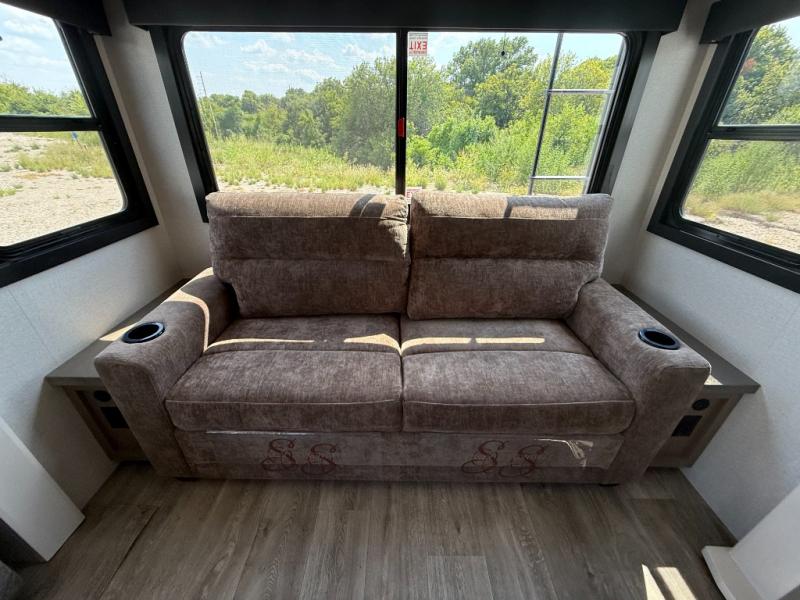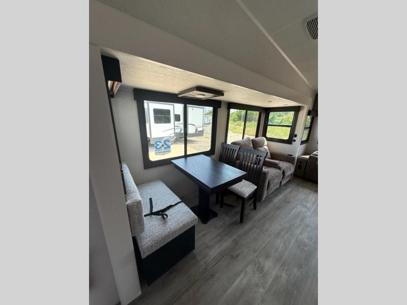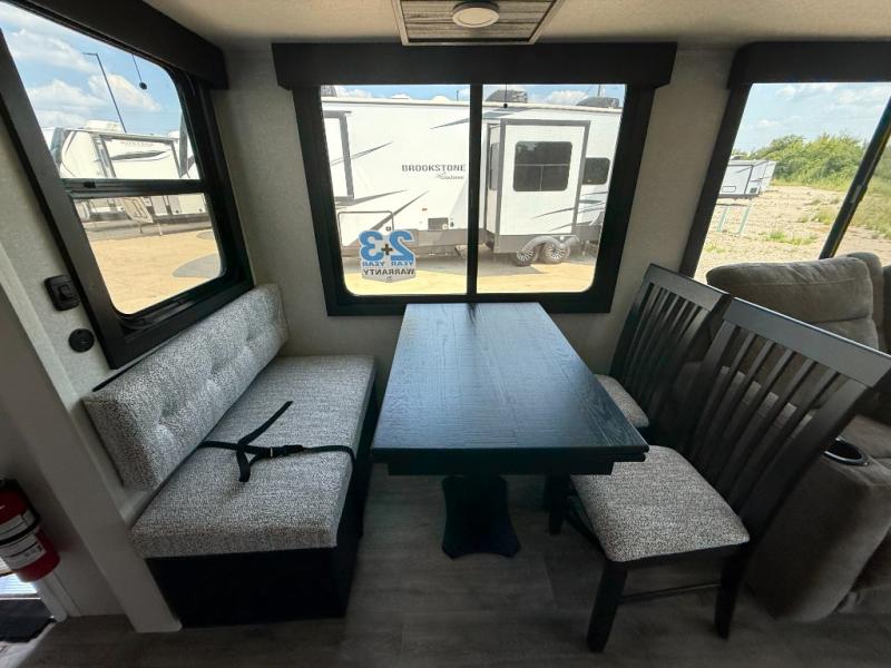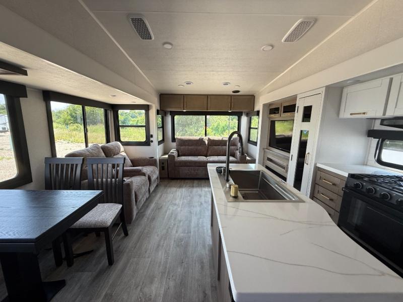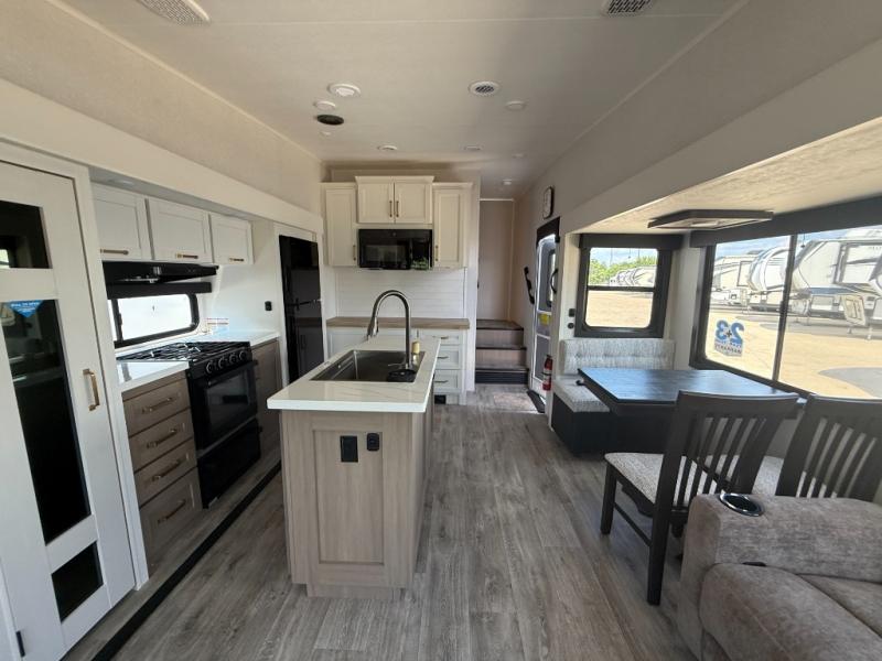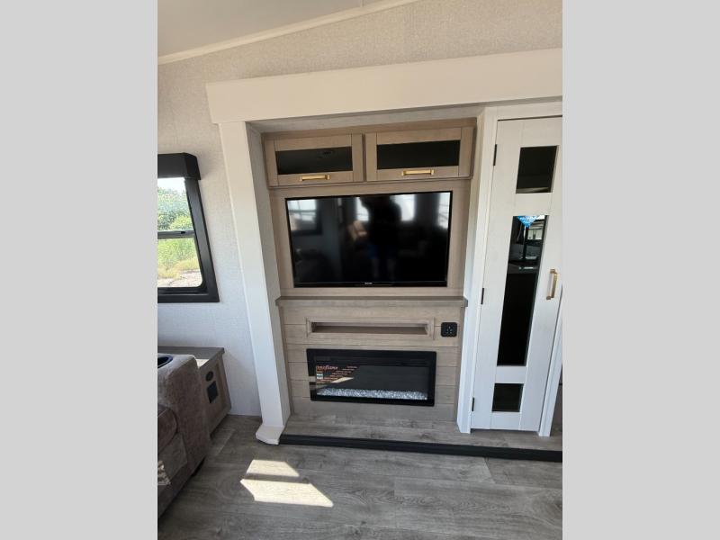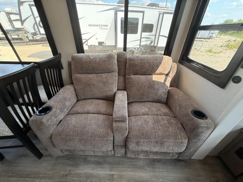 You will love how much interior space you have in this fifth wheel thanks to the dual opposing slides in the combined kitchen and living area! While your crew is relaxing on the theater seat or tri-fold sofa, you can prepare dinner on the GE black and stainless 21" range. There is also an entertainment center and fireplace across from the theater seat for easy viewing, and the table and chairs with a bench will be the perfect place to play a board game at. Head to the front to enjoy the private bedroom with an Olympic queen bed, and the full bath is close by for easy nighttime use!