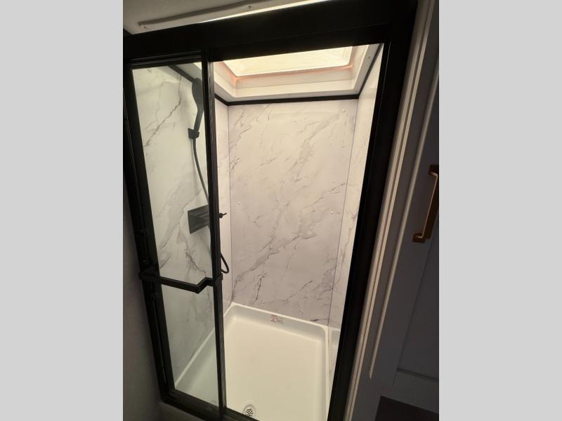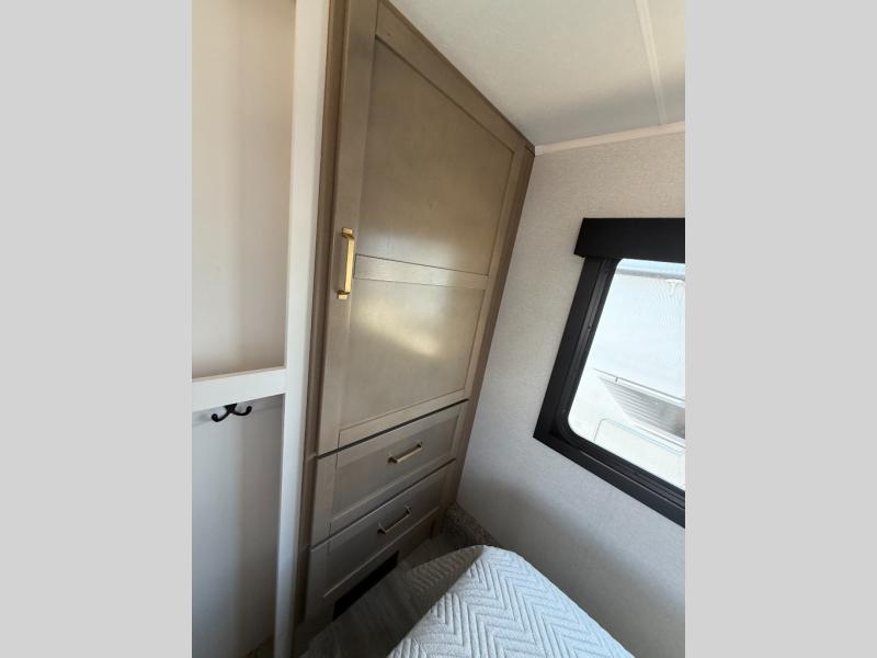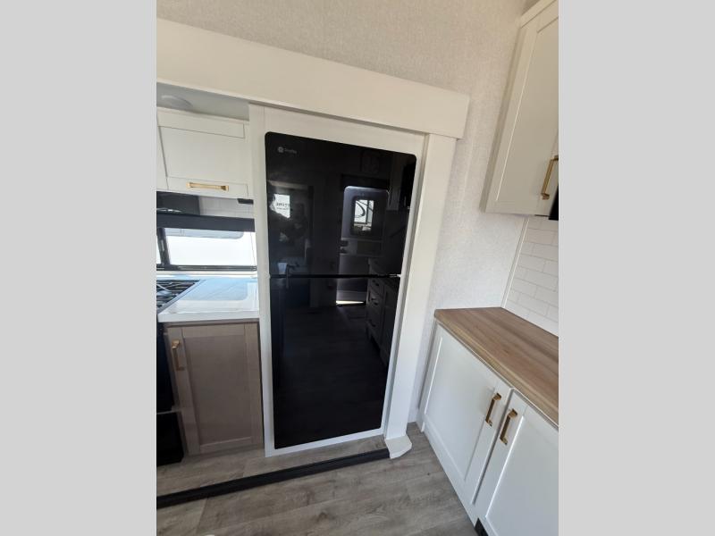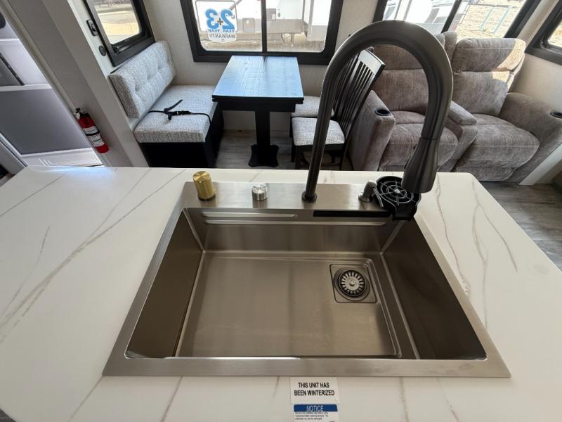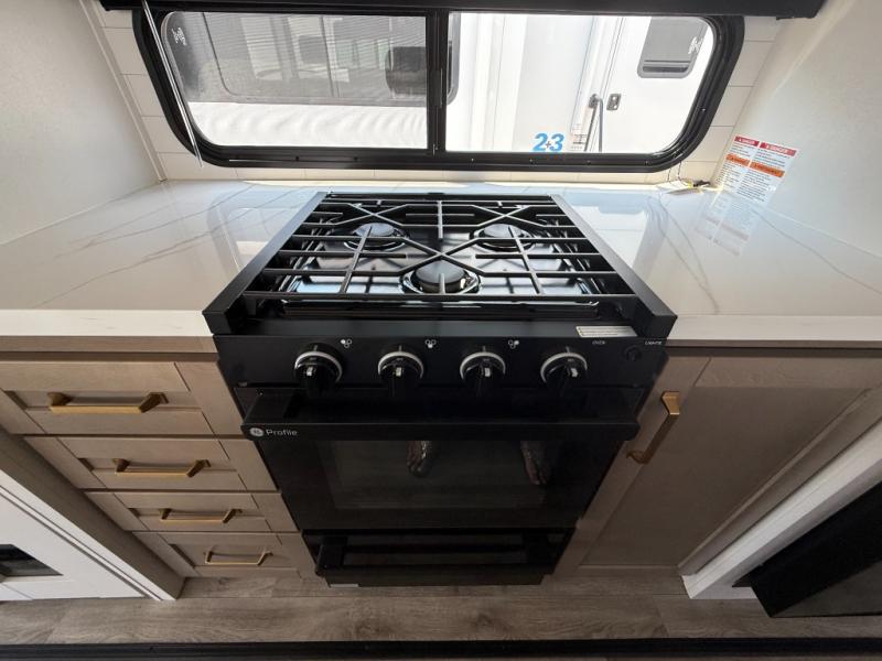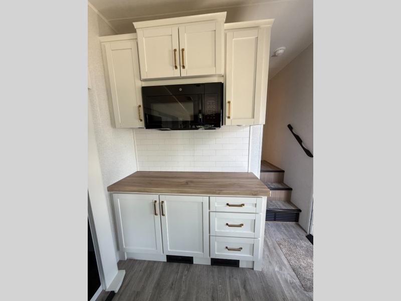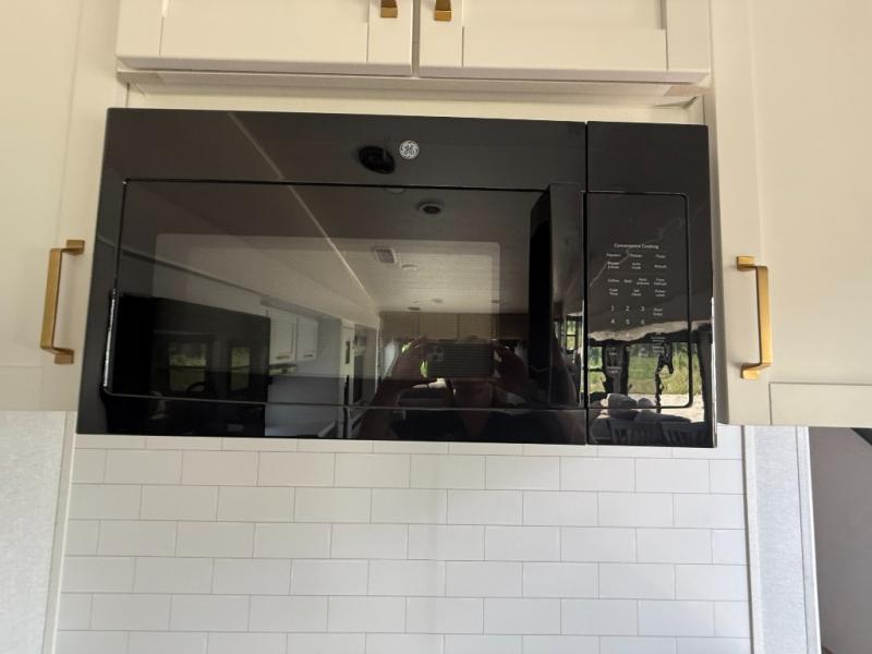 You will love how much interior space you have in this fifth wheel thanks to the dual opposing slides in the combined kitchen and living area! While your crew is relaxing on the theater seat or tri-fold sofa, you can prepare dinner on the GE black and stainless 21" range. There is also an entertainment center and fireplace across from the theater seat for easy viewing, and the table and chairs with a bench will be the perfect place to play a board game at. Head to the front to enjoy the private bedroom with an Olympic queen bed, and the full bath is close by for easy nighttime use!
