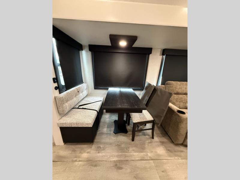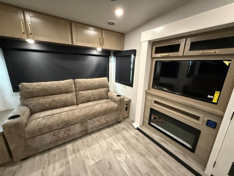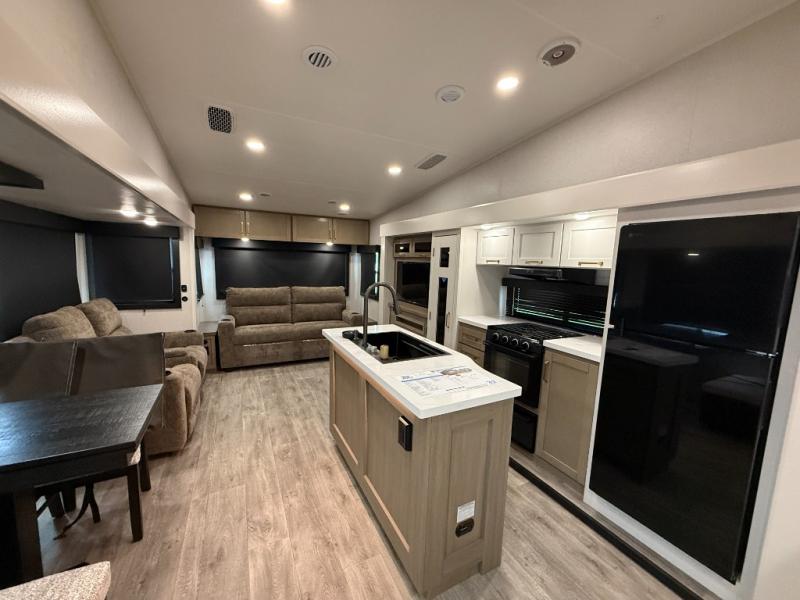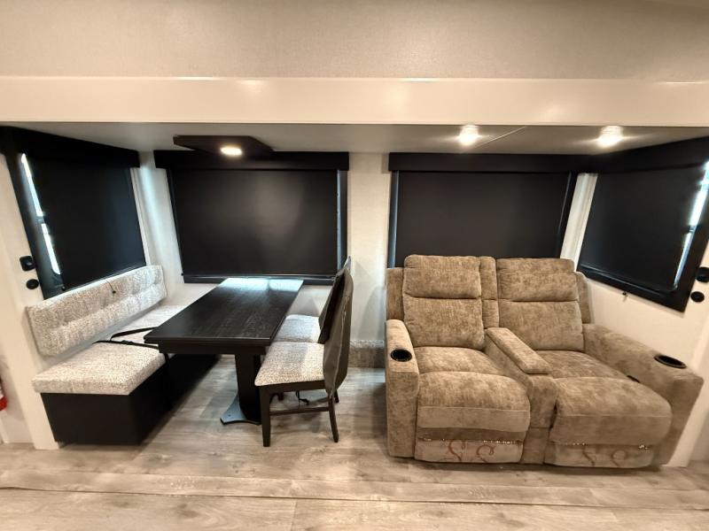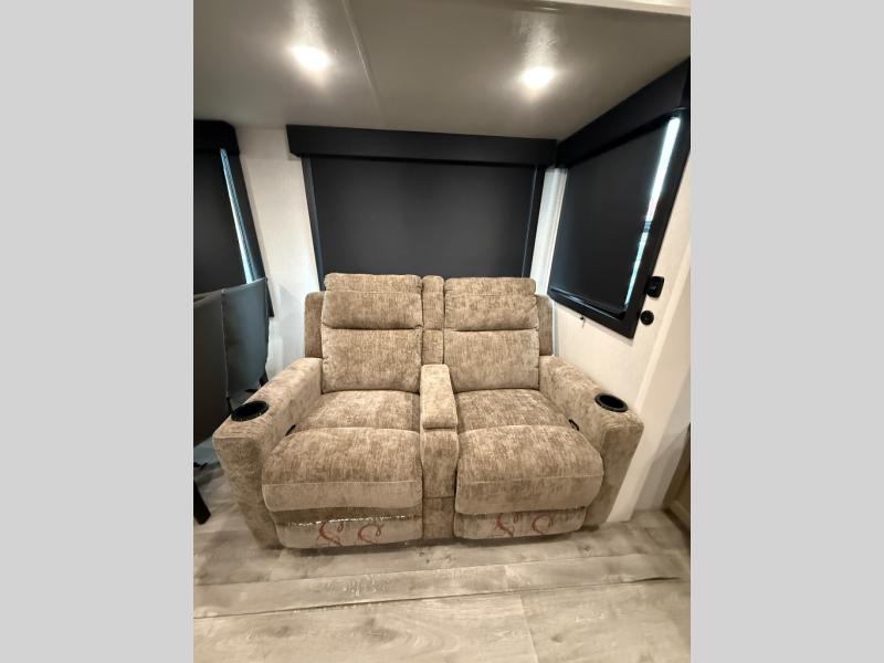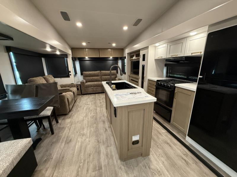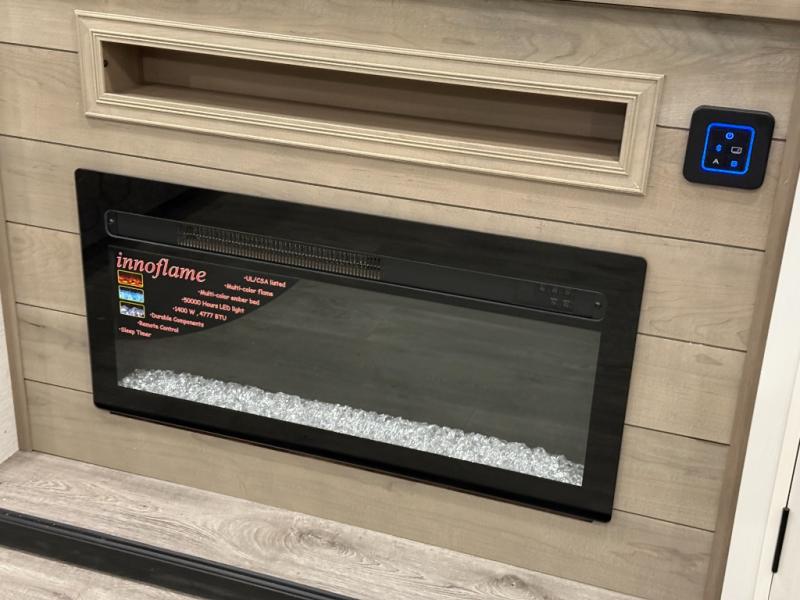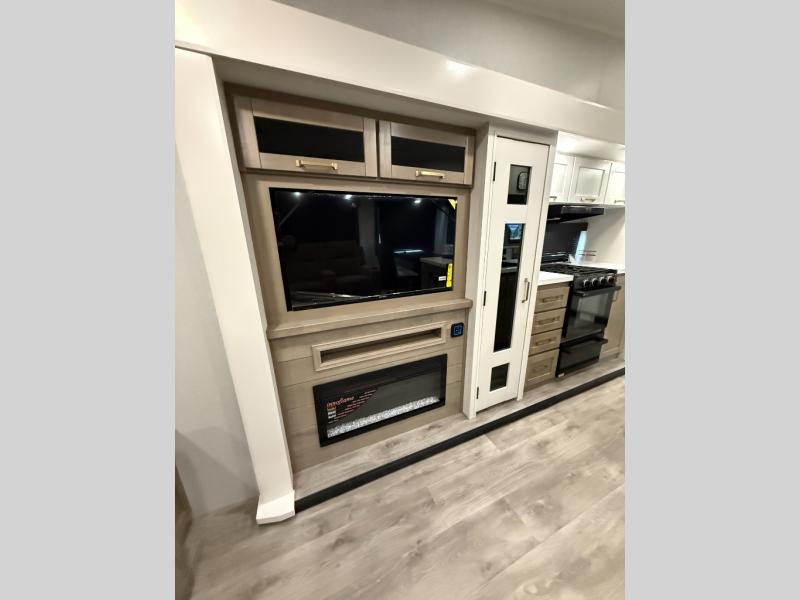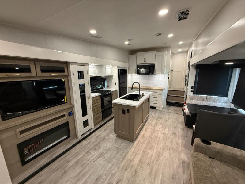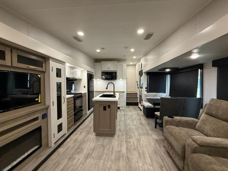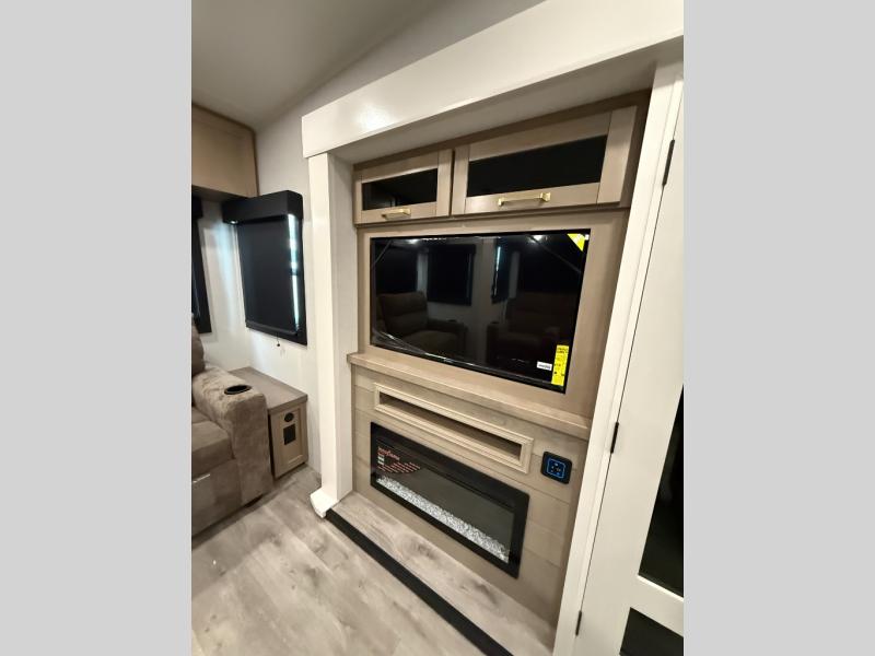 You will love how much interior space you have in this fifth wheel thanks to the dual opposing slides in the combined kitchen and living area! While your crew is relaxing on the theater seat or tri-fold sofa, you can prepare dinner on the GE black and stainless 21" range. There is also an entertainment center and fireplace across from the theater seat for easy viewing, and the table and chairs with a bench will be the perfect place to play a board game at. Head to the front to enjoy the private bedroom with an Olympic queen bed, and the full bath is close by for easy nighttime use!