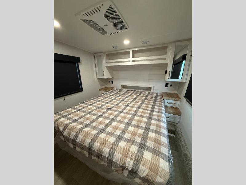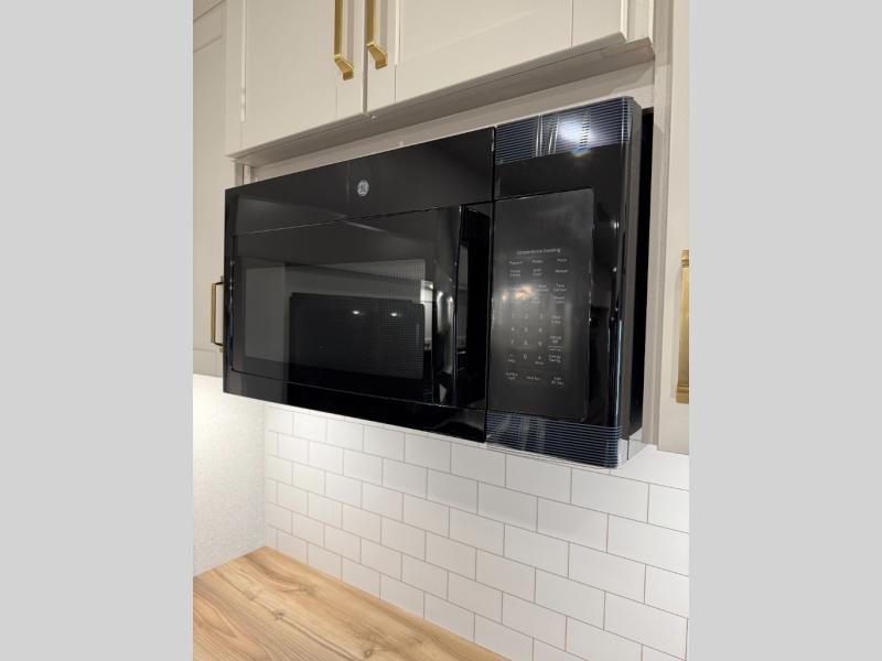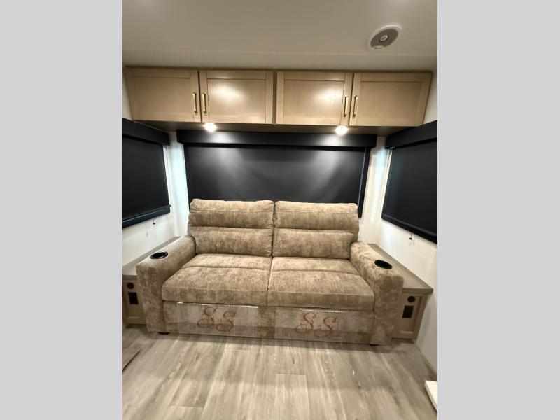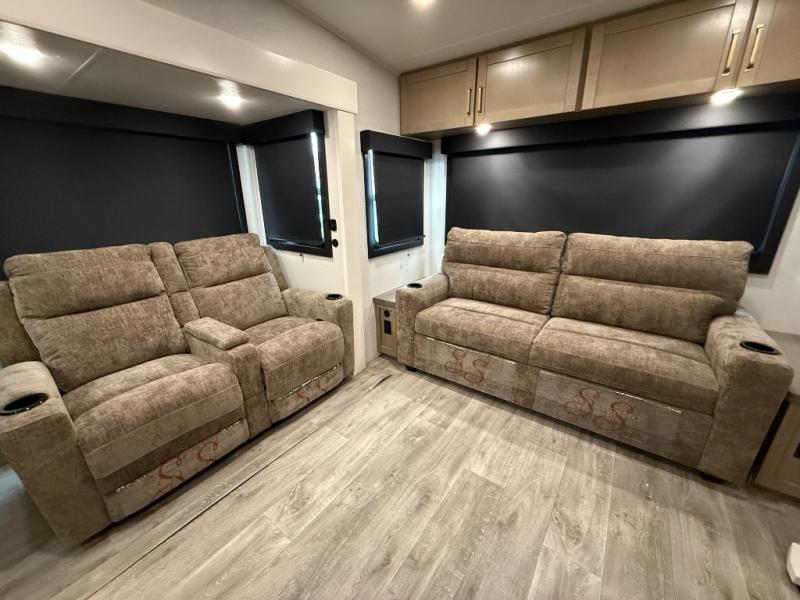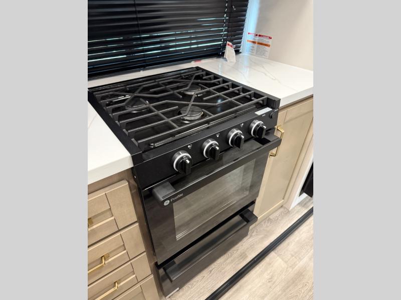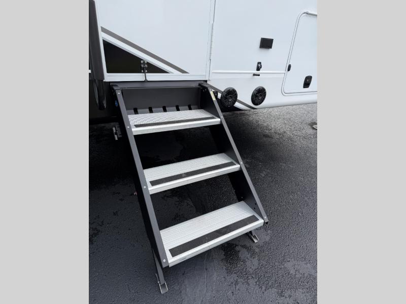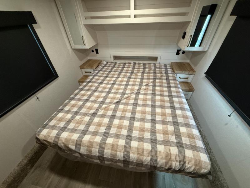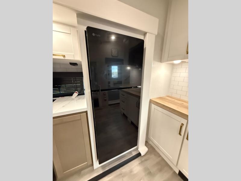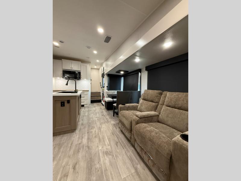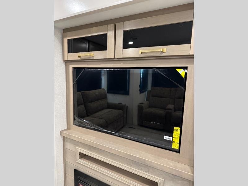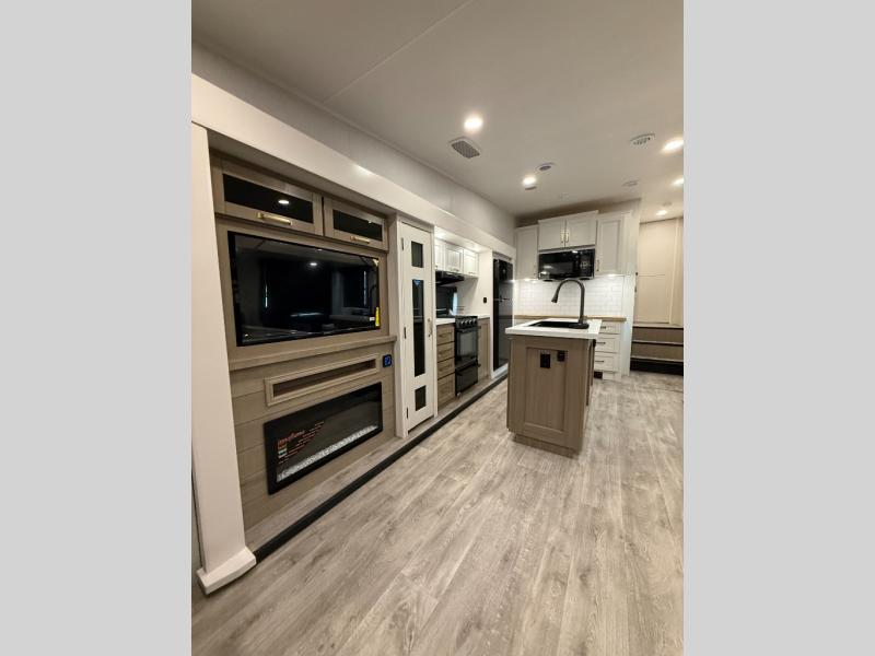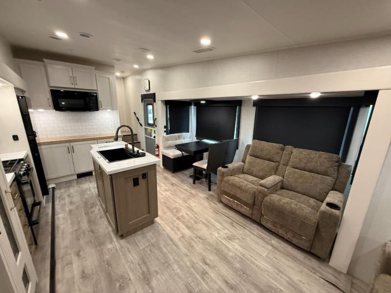 You will love how much interior space you have in this fifth wheel thanks to the dual opposing slides in the combined kitchen and living area! While your crew is relaxing on the theater seat or tri-fold sofa, you can prepare dinner on the GE black and stainless 21" range. There is also an entertainment center and fireplace across from the theater seat for easy viewing, and the table and chairs with a bench will be the perfect place to play a board game at. Head to the front to enjoy the private bedroom with an Olympic queen bed, and the full bath is close by for easy nighttime use!