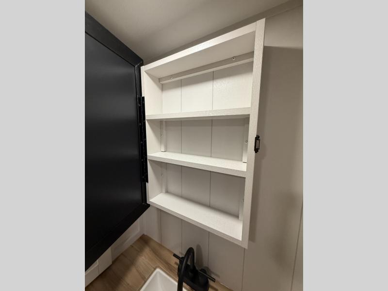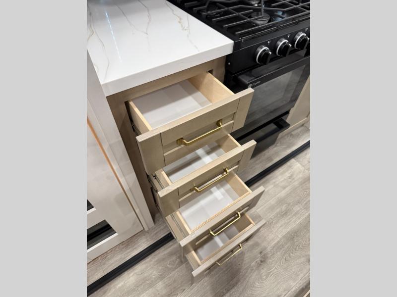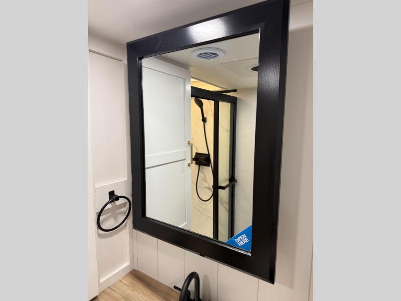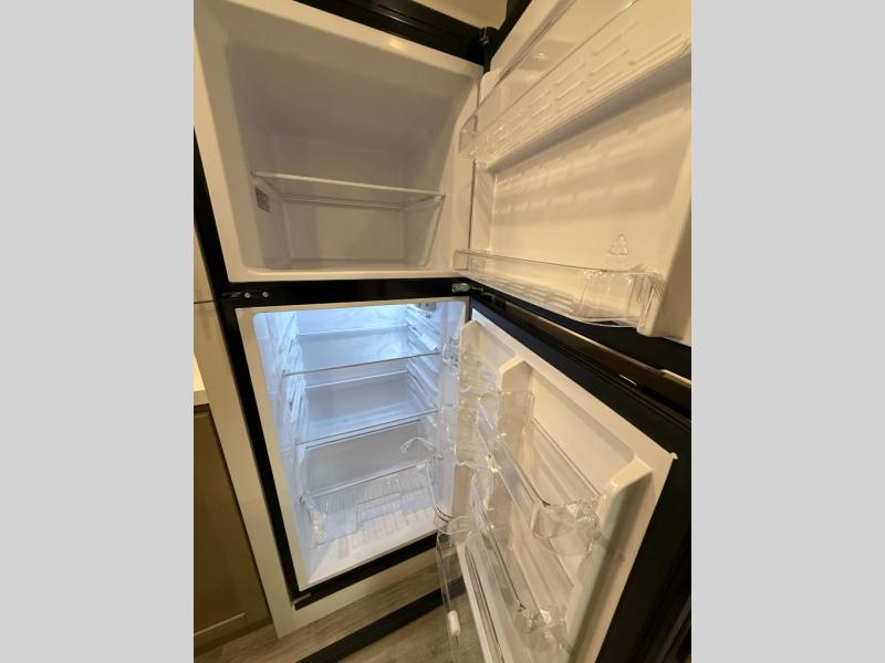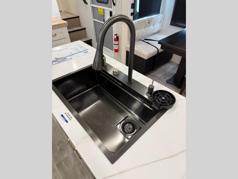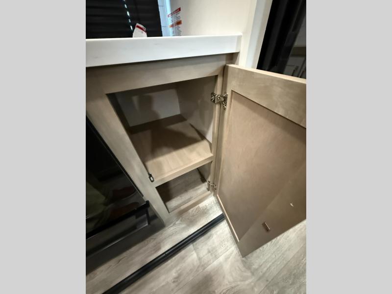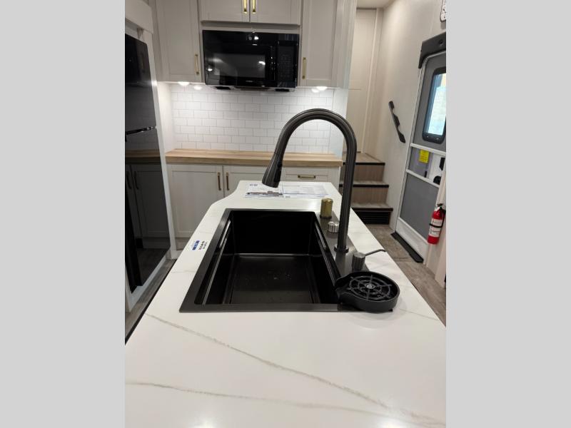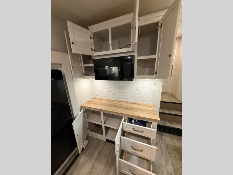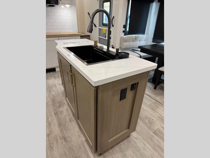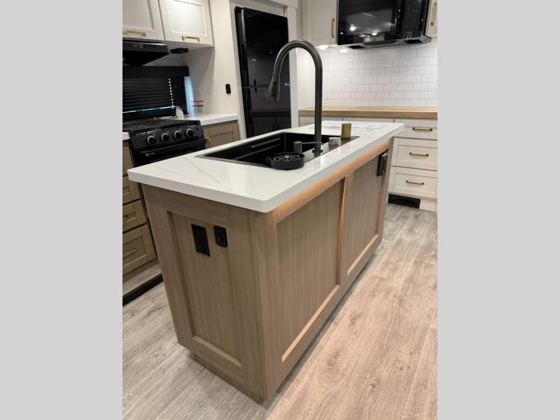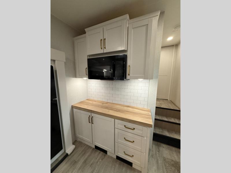 You will love how much interior space you have in this fifth wheel thanks to the dual opposing slides in the combined kitchen and living area! While your crew is relaxing on the theater seat or tri-fold sofa, you can prepare dinner on the GE black and stainless 21" range. There is also an entertainment center and fireplace across from the theater seat for easy viewing, and the table and chairs with a bench will be the perfect place to play a board game at. Head to the front to enjoy the private bedroom with an Olympic queen bed, and the full bath is close by for easy nighttime use!