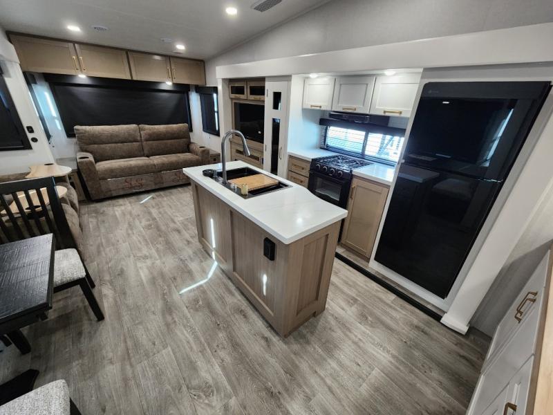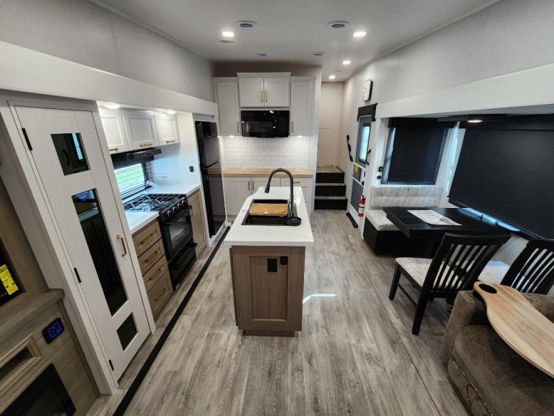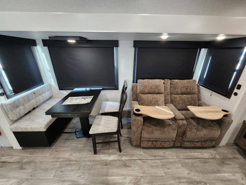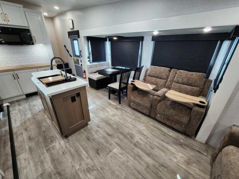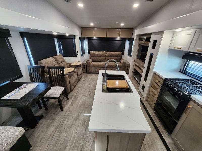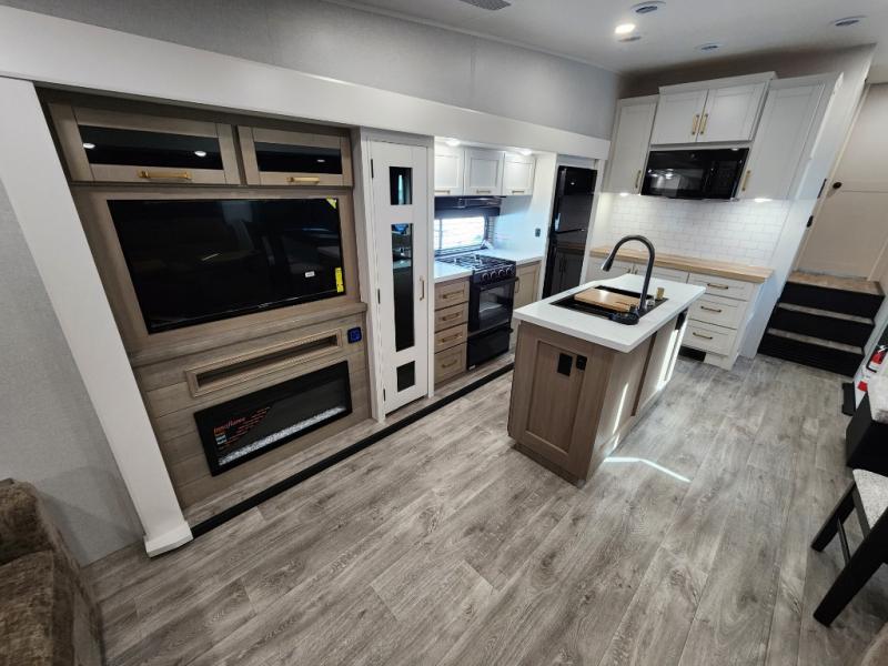 You will love how much interior space you have in this fifth wheel thanks to the dual opposing slides in the combined kitchen and living area! While your crew is relaxing on the theater seat or tri-fold sofa, you can prepare dinner on the GE black and stainless 21" range. There is also an entertainment center and fireplace across from the theater seat for easy viewing, and the table and chairs with a bench will be the perfect place to play a board game at. Head to the front to enjoy the private bedroom with an Olympic queen bed, and the full bath is close by for easy nighttime use!