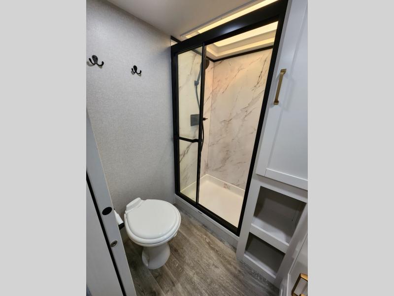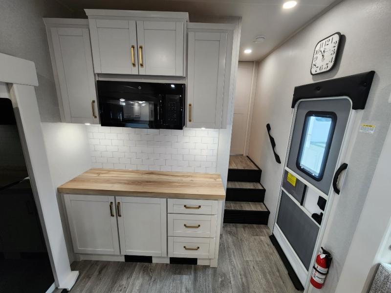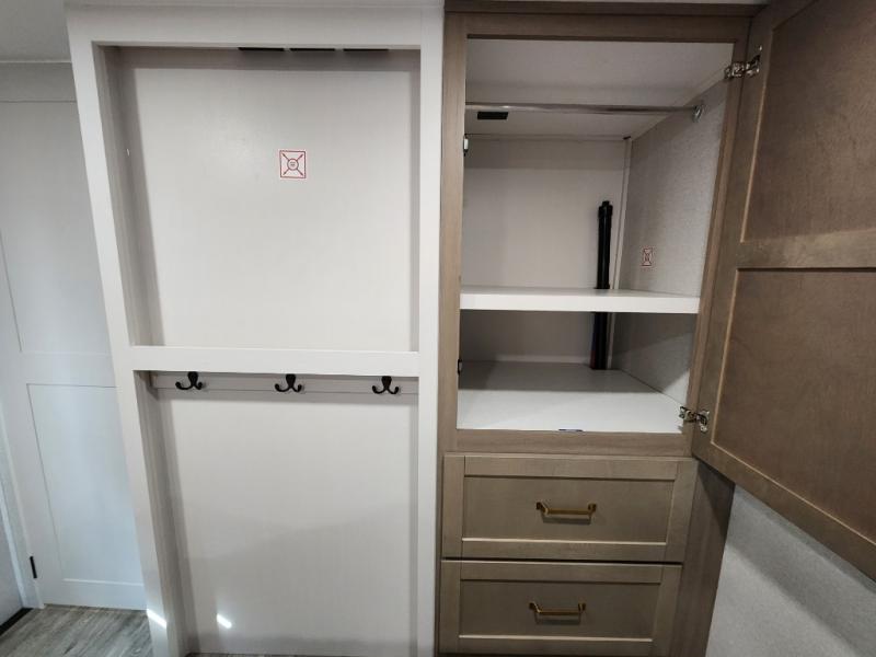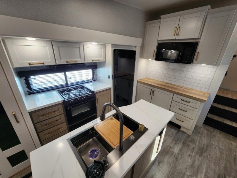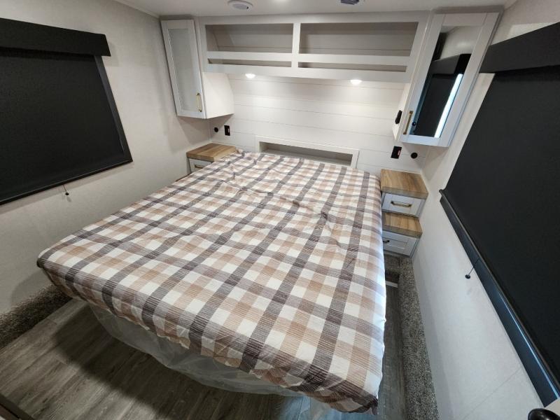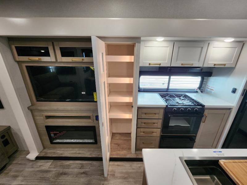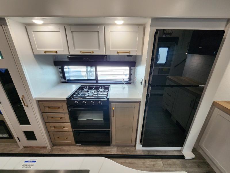 You will love how much interior space you have in this fifth wheel thanks to the dual opposing slides in the combined kitchen and living area! While your crew is relaxing on the theater seat or tri-fold sofa, you can prepare dinner on the GE black and stainless 21" range. There is also an entertainment center and fireplace across from the theater seat for easy viewing, and the table and chairs with a bench will be the perfect place to play a board game at. Head to the front to enjoy the private bedroom with an Olympic queen bed, and the full bath is close by for easy nighttime use!