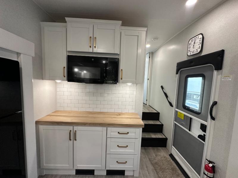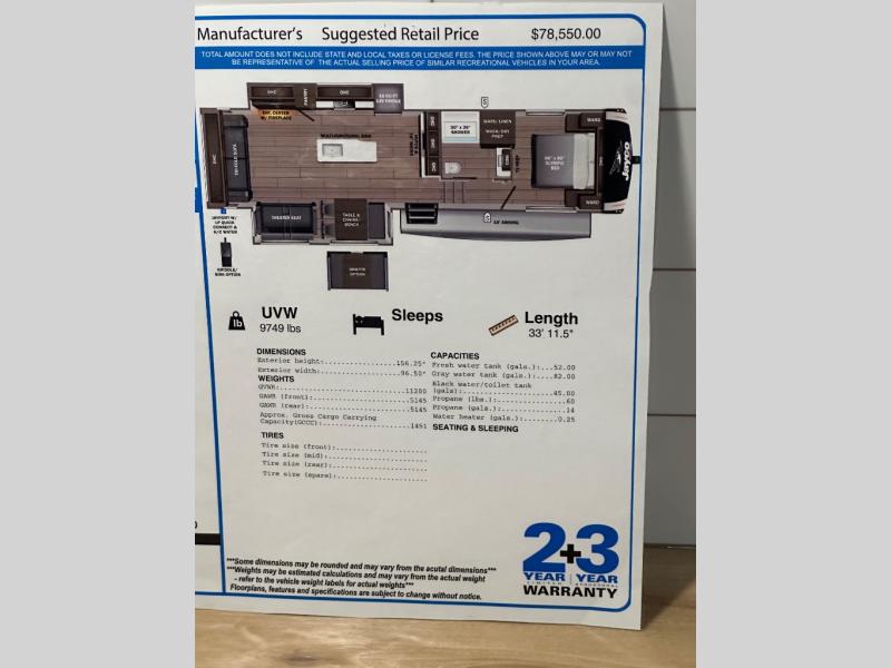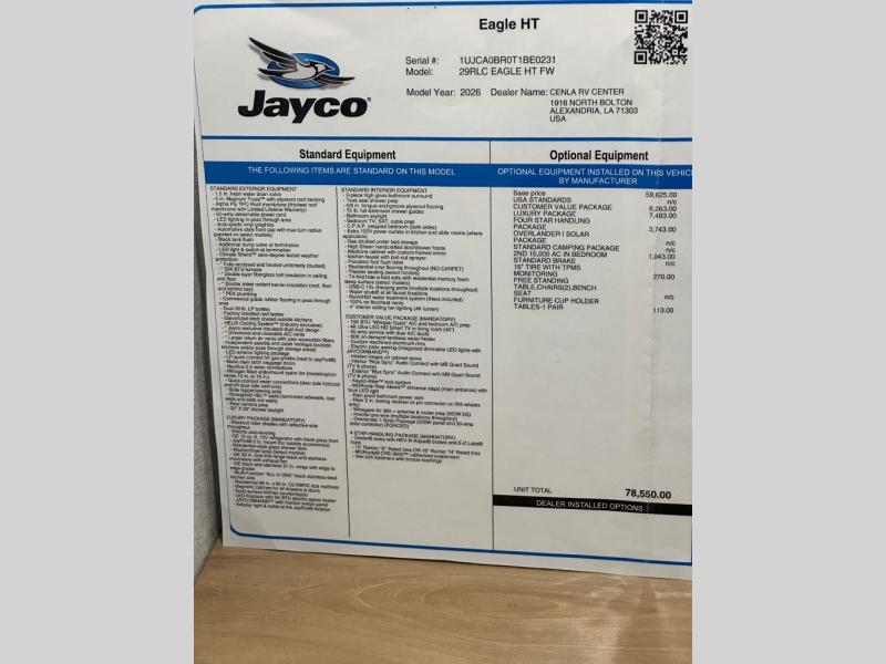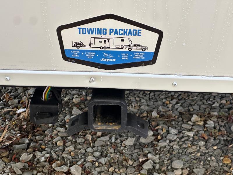With any Eagle HT fifth wheel or travel trailer by Jayco you will enjoy a smooth drive thanks to the 4 Star Handling Package and MORryde CRE-3000 rubberized suspension. The Customer Value Package includes amenities that are sure to make camping easier than ever, like the 60K on-demand water heater, Keyed-Alike lock system, 15,000 BTU "Whisper Quiet" A/C, and more. Handcrafted door/drawer fronts will make your space feel more like home, along with residential vinyl flooring throughout, GE appliances, and blackout roller shades with reflective side throughout to keep the sun out when you want to sleep in. Each model also includes a NuVo H2O water treatment system with filters included, interior and exterior "Blue Sync" audio connect with MB Quart Sound for your TV and phone, and 100% no floor vents for added comfort and convenience!