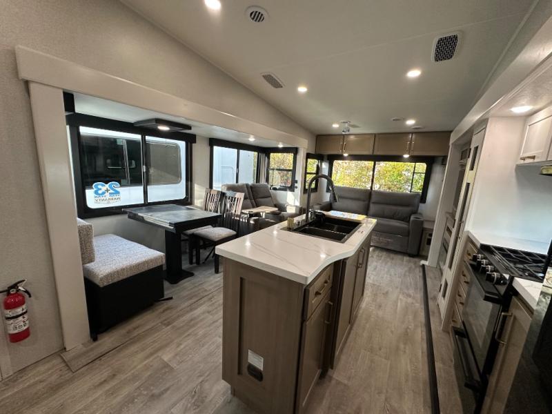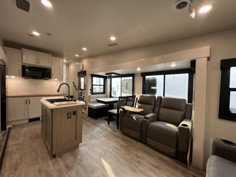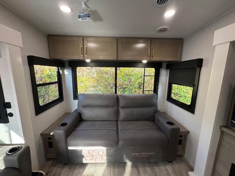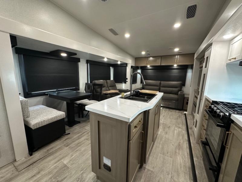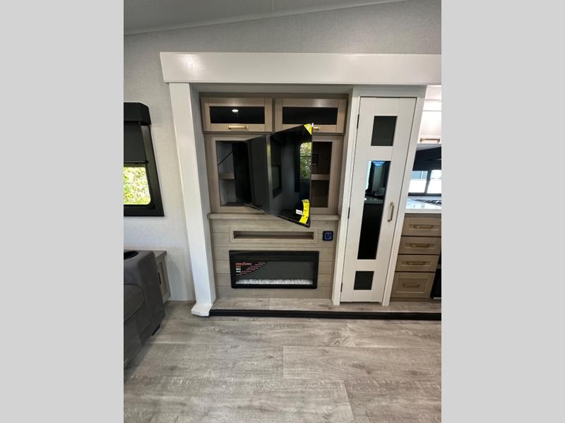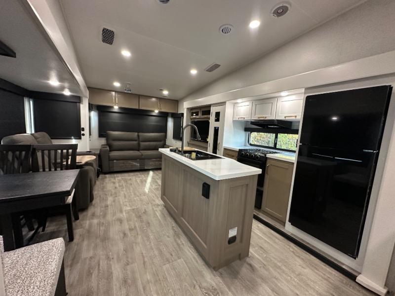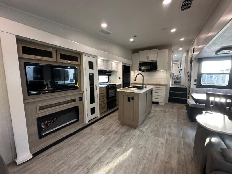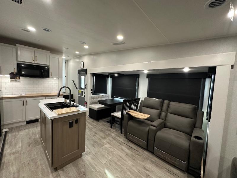 You will love how much interior space you have in this fifth wheel thanks to the dual opposing slides in the combined kitchen and living area! While your crew is relaxing on the theater seat or tri-fold sofa, you can prepare dinner on the GE black and stainless 21" range. There is also an entertainment center and fireplace across from the theater seat for easy viewing, and the table and chairs with a bench will be the perfect place to play a board game at. Head to the front to enjoy the private bedroom with an Olympic queen bed, and the full bath is close by for easy nighttime use!