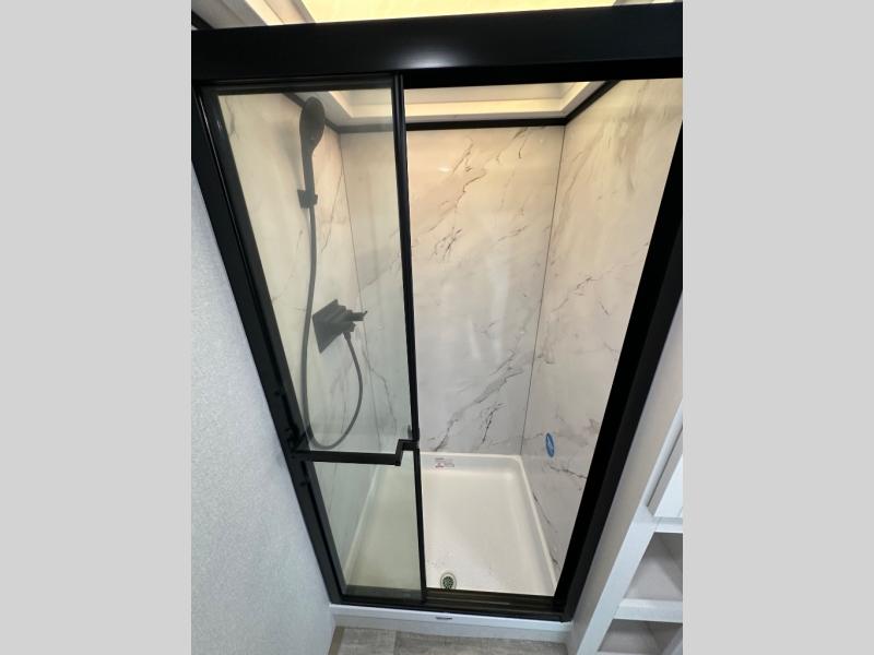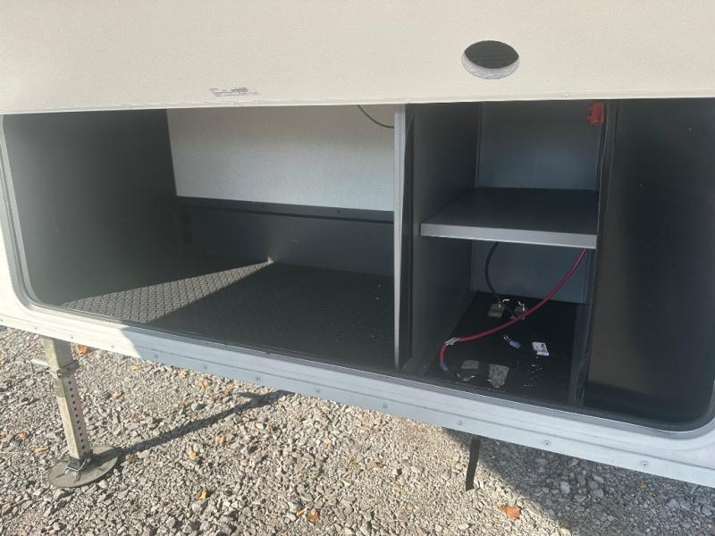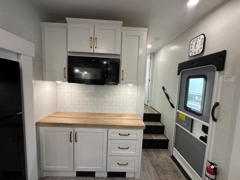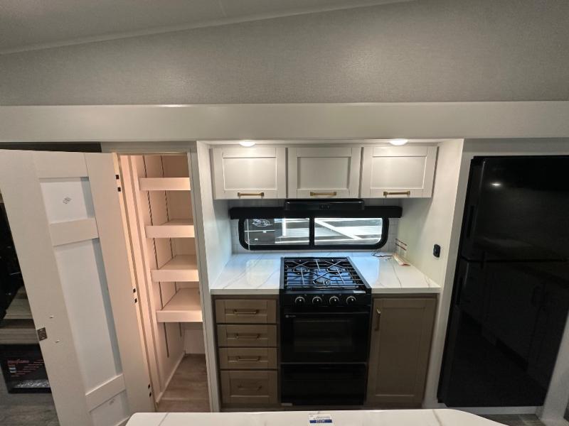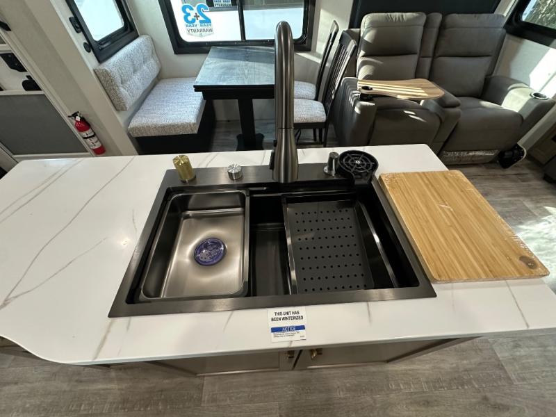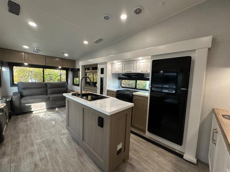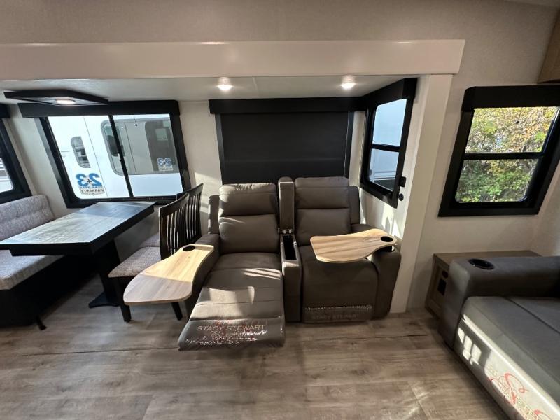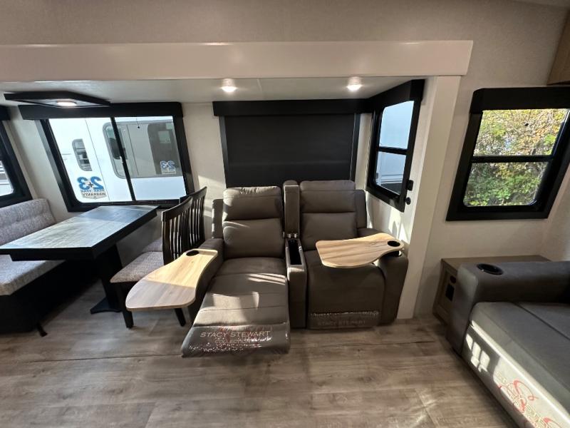 You will love how much interior space you have in this fifth wheel thanks to the dual opposing slides in the combined kitchen and living area! While your crew is relaxing on the theater seat or tri-fold sofa, you can prepare dinner on the GE black and stainless 21" range. There is also an entertainment center and fireplace across from the theater seat for easy viewing, and the table and chairs with a bench will be the perfect place to play a board game at. Head to the front to enjoy the private bedroom with an Olympic queen bed, and the full bath is close by for easy nighttime use!