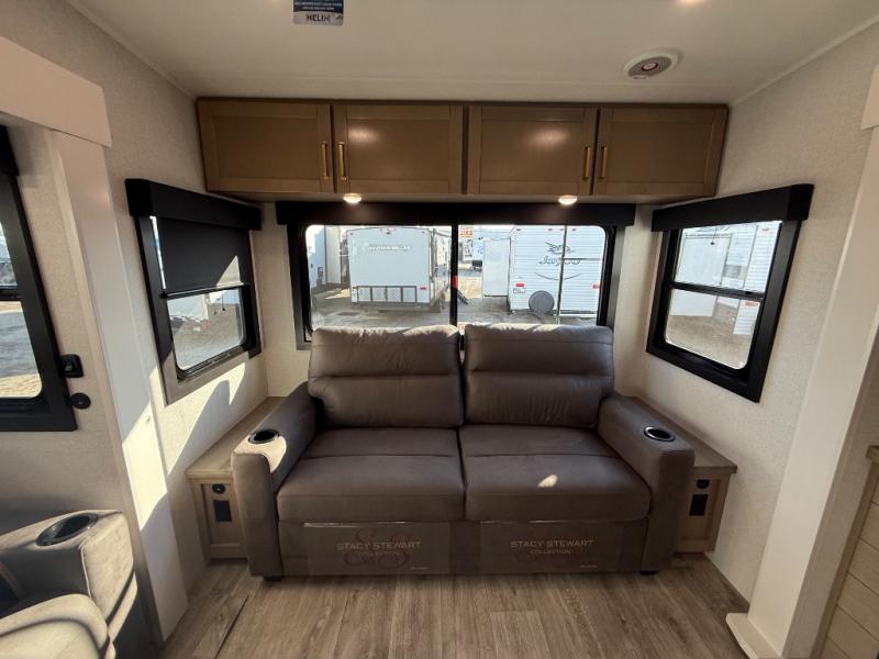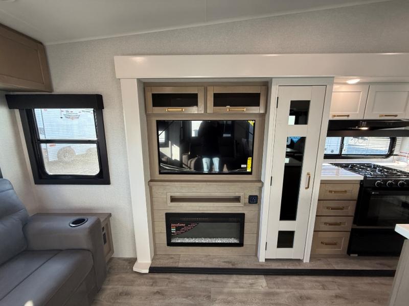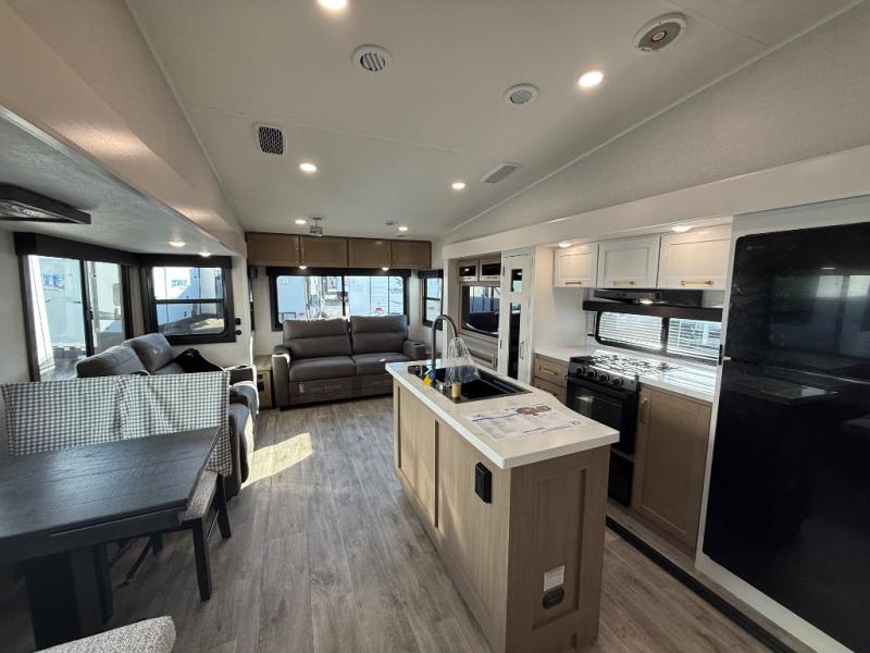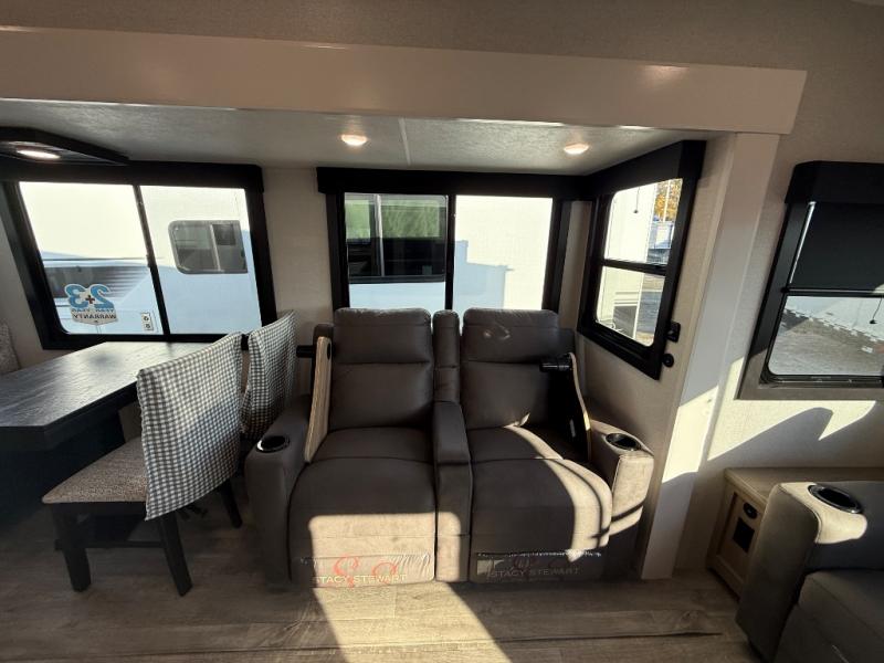 You will love how much interior space you have in this fifth wheel thanks to the dual opposing slides in the combined kitchen and living area! While your crew is relaxing on the theater seat or tri-fold sofa, you can prepare dinner on the GE black and stainless 21" range. There is also an entertainment center and fireplace across from the theater seat for easy viewing, and the table and chairs with a bench will be the perfect place to play a board game at. Head to the front to enjoy the private bedroom with an Olympic queen bed, and the full bath is close by for easy nighttime use!