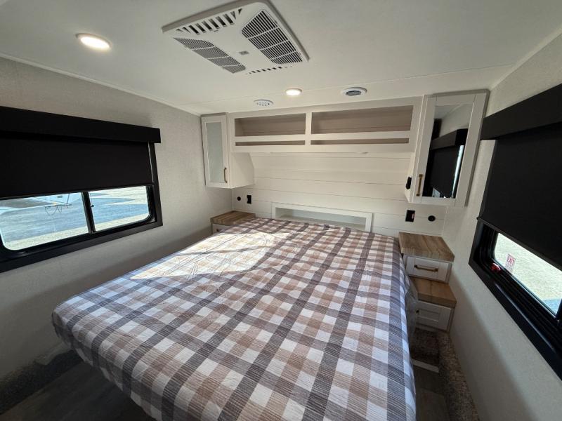 With any Eagle HT fifth wheel or travel trailer by Jayco you will enjoy a smooth drive thanks to the 4 Star Handling Package and MORryde CRE-3000 rubberized suspension. The Customer Value Package includes amenities that are sure to make camping easier than ever, like the 60K on-demand water heater, Keyed-Alike lock system, 15,000 BTU "Whisper Quiet" A/C, and more. Handcrafted door/drawer fronts will make your space feel more like home, along with residential vinyl flooring throughout, GE appliances, and blackout roller shades with reflective side throughout to keep the sun out when you want to sleep in. Each model also includes a NuVo H2O water treatment system with filters included, interior and exterior "Blue Sync" audio connect with MB Quart Sound for your TV and phone, and 100% no floor vents for added comfort and convenience!