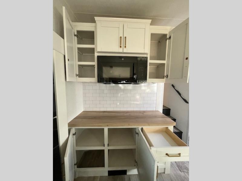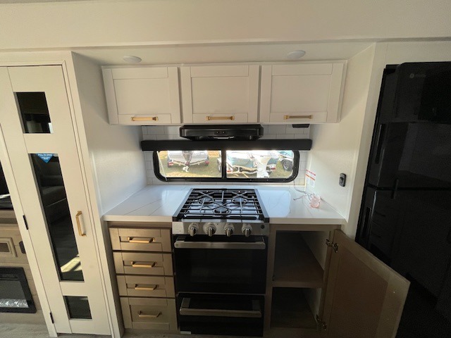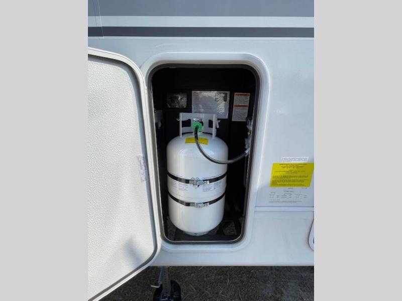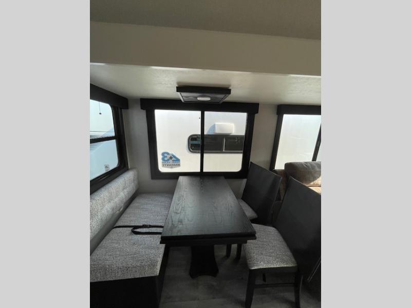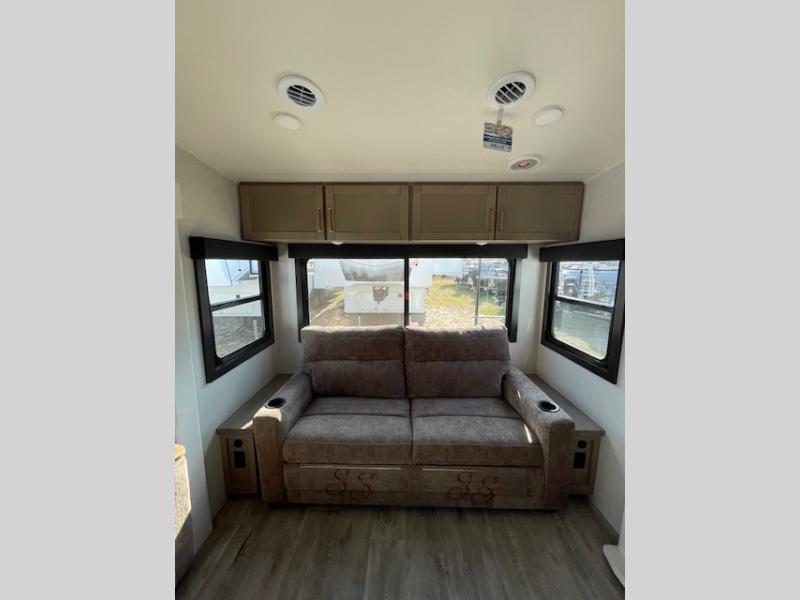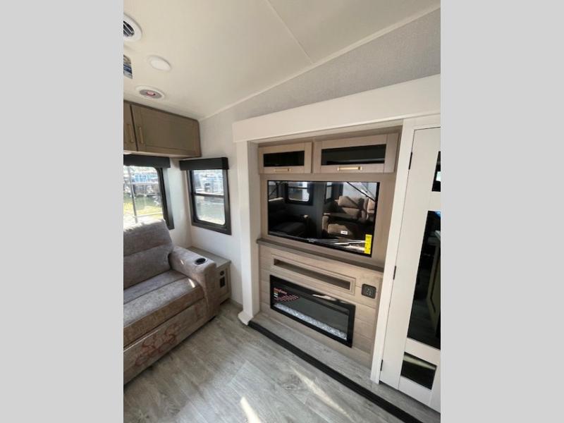 You will love how much interior space you have in this fifth wheel thanks to the dual opposing slides in the combined kitchen and living area! While your crew is relaxing on the theater seat or tri-fold sofa, you can prepare dinner on the GE black and stainless 21" range. There is also an entertainment center and fireplace across from the theater seat for easy viewing, and the table and chairs with a bench will be the perfect place to play a board game at. Head to the front to enjoy the private bedroom with an Olympic queen bed, and the full bath is close by for easy nighttime use!