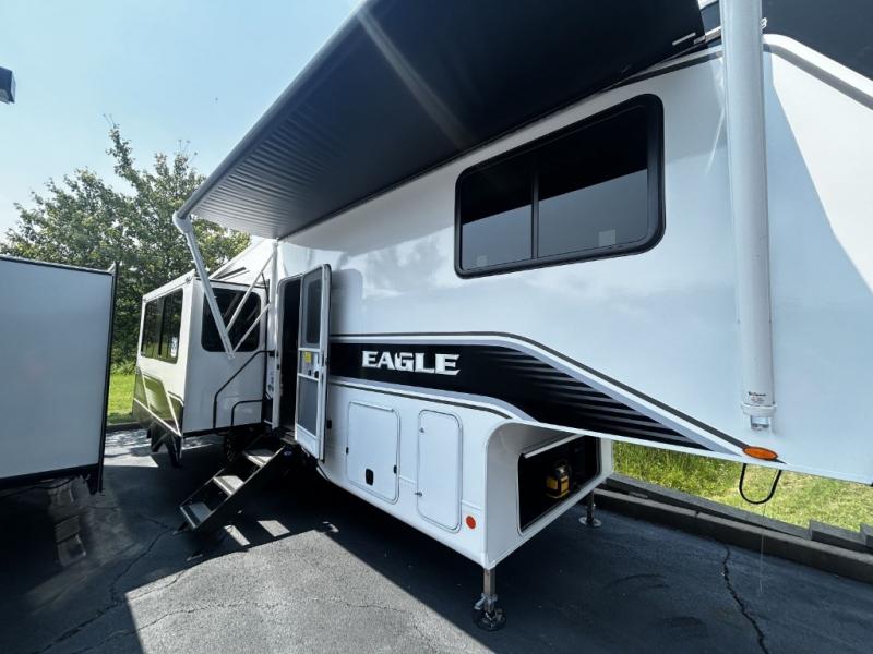 With any Eagle HT fifth wheel or travel trailer by Jayco you will enjoy a smooth drive thanks to the 4 Star Handling Package and MORryde CRE-3000 rubberized suspension. The Customer Value Package includes amenities that are sure to make camping easier than ever, like the 60K on-demand water heater, Keyed-Alike lock system, 15,000 BTU "Whisper Quiet" A/C, and more. Handcrafted door/drawer fronts will make your space feel more like home, along with residential vinyl flooring throughout, GE appliances, and blackout roller shades with reflective side throughout to keep the sun out when you want to sleep in. Each model also includes a NuVo H2O water treatment system with filters included, interior and exterior "Blue Sync" audio connect with MB Quart Sound for your TV and phone, and 100% no floor vents for added comfort and convenience!