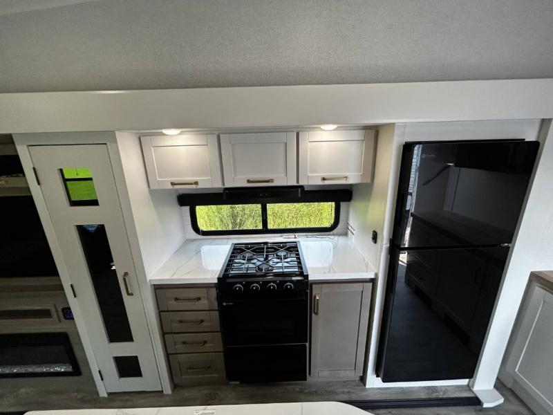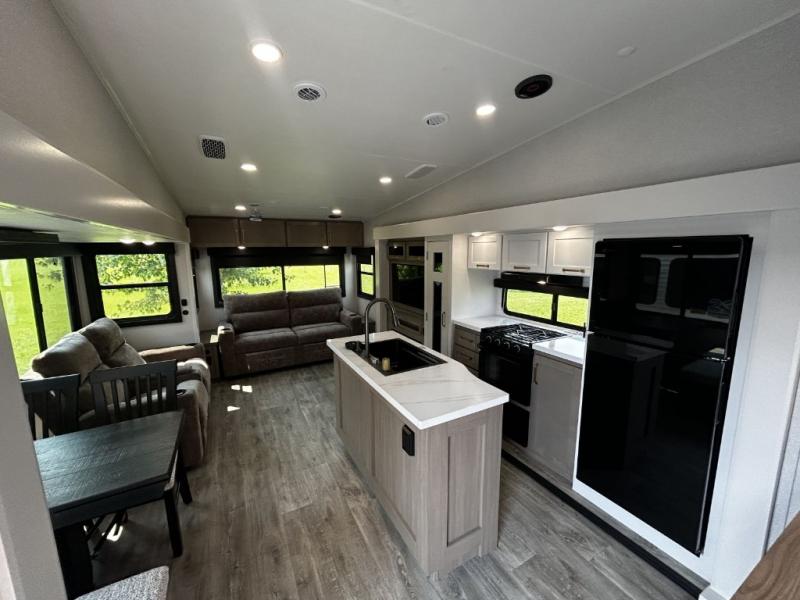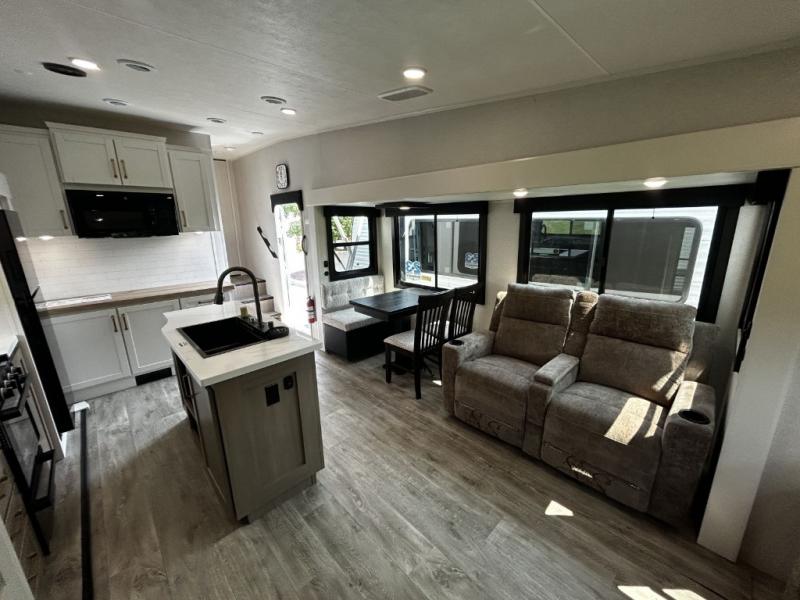 You will love how much interior space you have in this fifth wheel thanks to the dual opposing slides in the combined kitchen and living area! While your crew is relaxing on the theater seat or tri-fold sofa, you can prepare dinner on the GE black and stainless 21" range. There is also an entertainment center and fireplace across from the theater seat for easy viewing, and the table and chairs with a bench will be the perfect place to play a board game at. Head to the front to enjoy the private bedroom with an Olympic queen bed, and the full bath is close by for easy nighttime use!