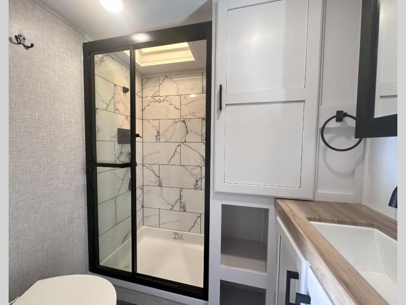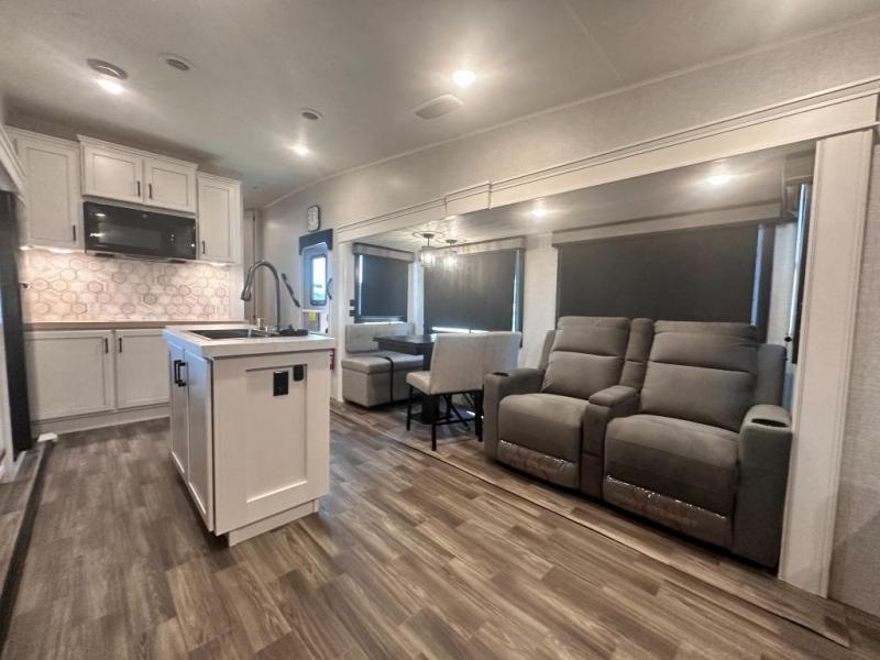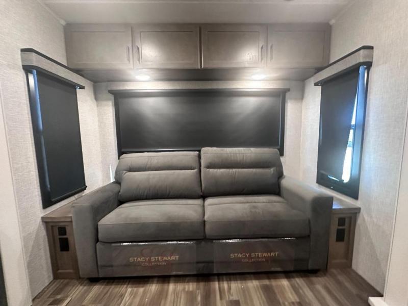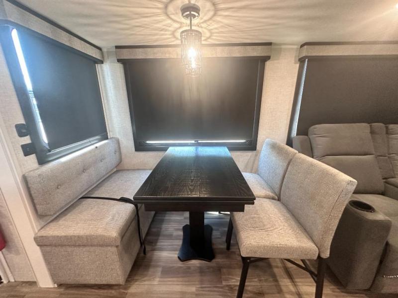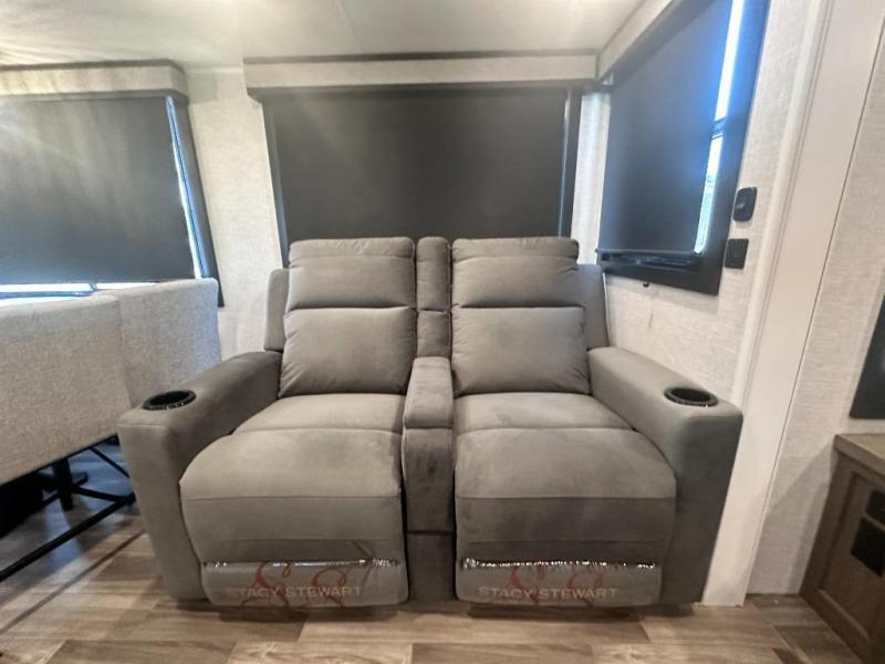 You will love how much interior space you have in this fifth wheel thanks to the dual opposing slides in the combined kitchen and living area! While your crew is relaxing on the theater seat or tri-fold sofa, you can prepare dinner on the GE black and stainless 21" range. There is also an entertainment center and fireplace across from the theater seat for easy viewing, and the table and chairs with a bench will be the perfect place to play a board game at. Head to the front to enjoy the private bedroom with an Olympic queen bed, and the full bath is close by for easy nighttime use!