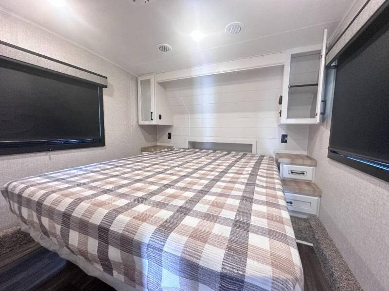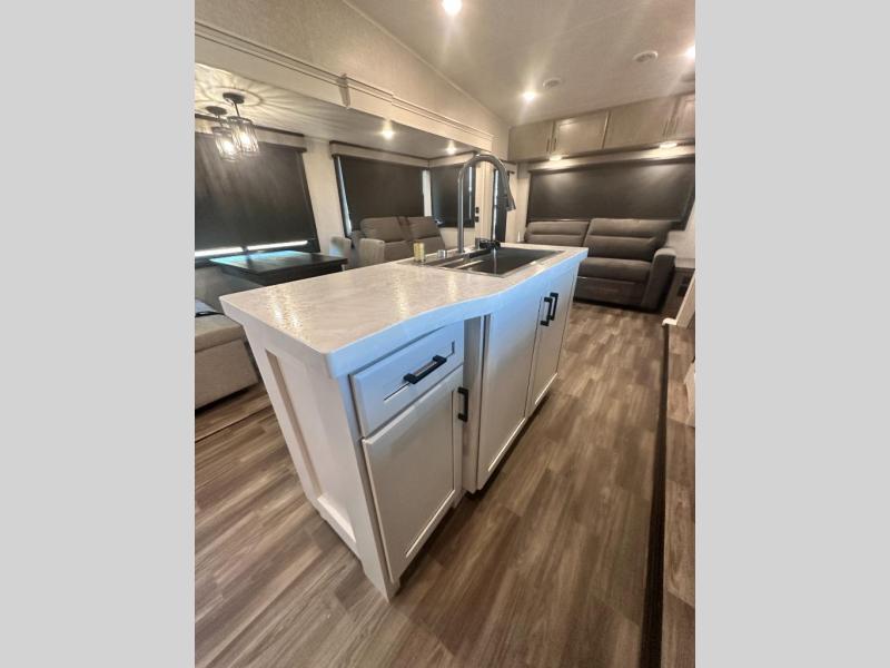 With any Eagle HT fifth wheel or travel trailer by Jayco you will enjoy a smooth drive thanks to the 4 Star Handling Package and MORryde CRE-3000 rubberized suspension. The Customer Value Package includes amenities that are sure to make camping easier than ever, like the 60K on-demand water heater, Keyed-Alike lock system, 15,000 BTU "Whisper Quiet" A/C, and more. Handcrafted door/drawer fronts will make your space feel more like home, along with residential vinyl flooring throughout, GE appliances, and blackout roller shades with reflective side throughout to keep the sun out when you want to sleep in. Each model also includes a NuVo H2O water treatment system with filters included, interior and exterior "Blue Sync" audio connect with MB Quart Sound for your TV and phone, and 100% no floor vents for added comfort and convenience!