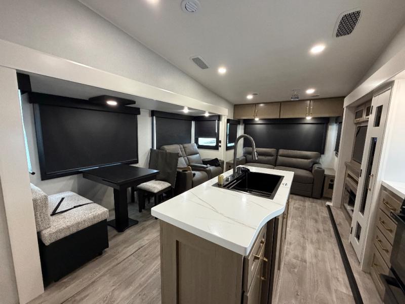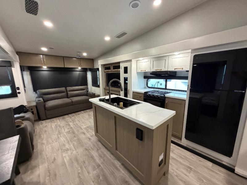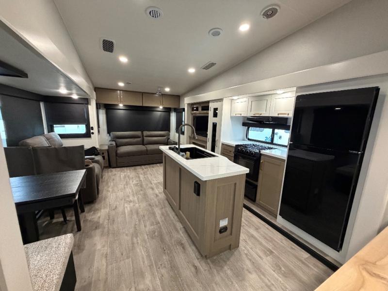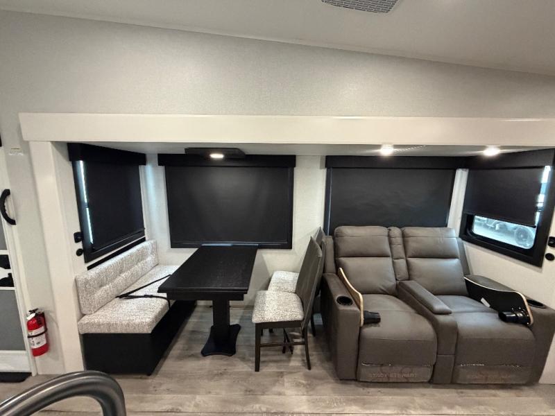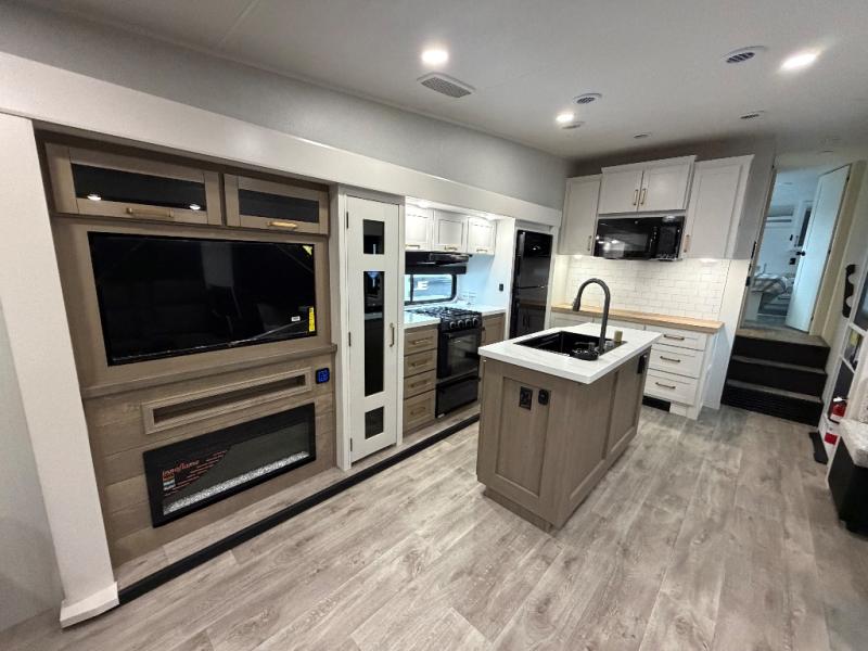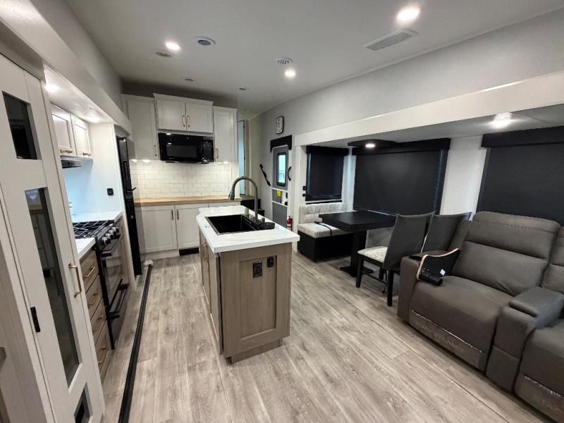 You will love how much interior space you have in this fifth wheel thanks to the dual opposing slides in the combined kitchen and living area! While your crew is relaxing on the theater seat or tri-fold sofa, you can prepare dinner on the GE black and stainless 21" range. There is also an entertainment center and fireplace across from the theater seat for easy viewing, and the table and chairs with a bench will be the perfect place to play a board game at. Head to the front to enjoy the private bedroom with an Olympic queen bed, and the full bath is close by for easy nighttime use!