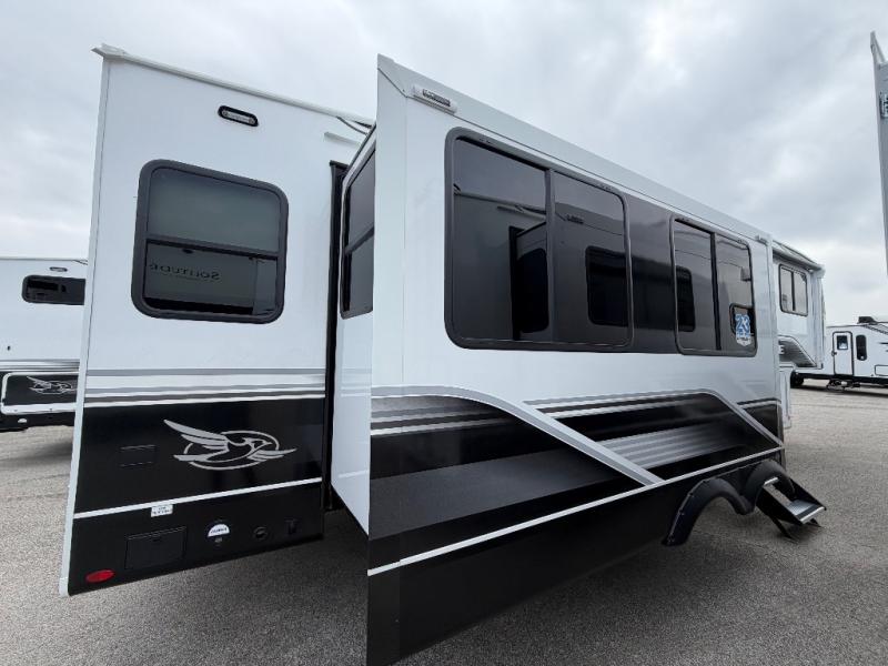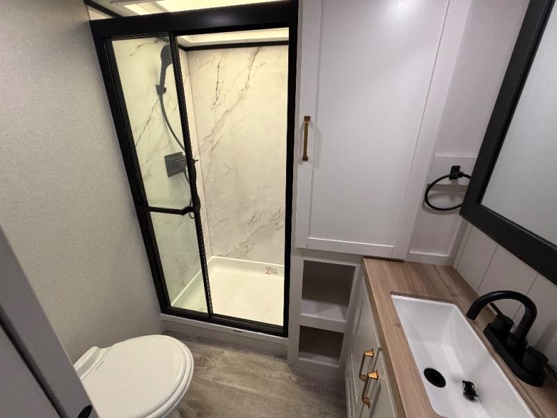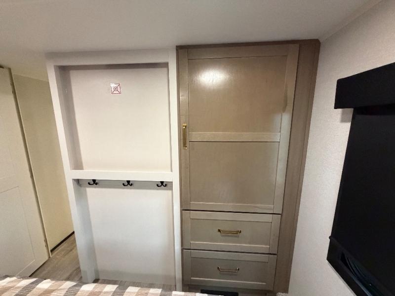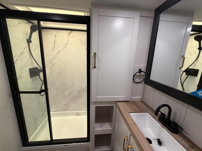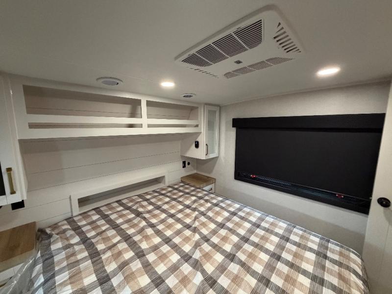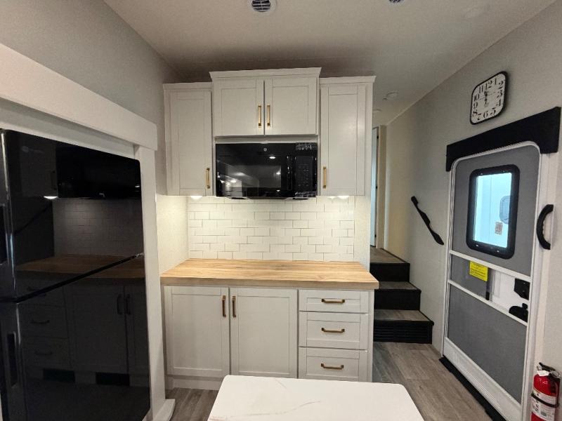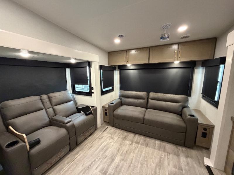 You will love how much interior space you have in this fifth wheel thanks to the dual opposing slides in the combined kitchen and living area! While your crew is relaxing on the theater seat or tri-fold sofa, you can prepare dinner on the GE black and stainless 21" range. There is also an entertainment center and fireplace across from the theater seat for easy viewing, and the table and chairs with a bench will be the perfect place to play a board game at. Head to the front to enjoy the private bedroom with an Olympic queen bed, and the full bath is close by for easy nighttime use!