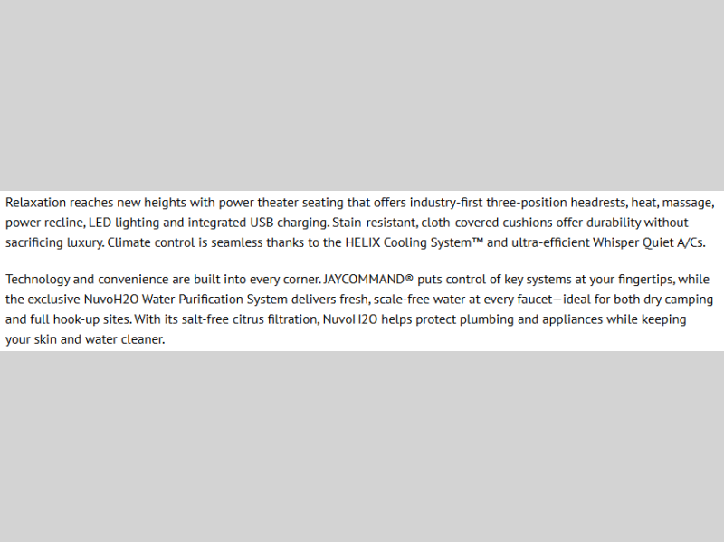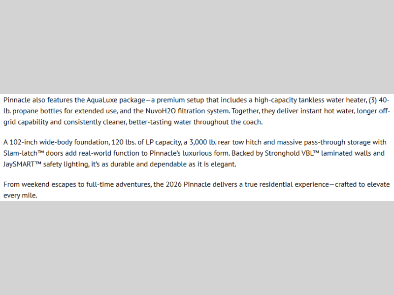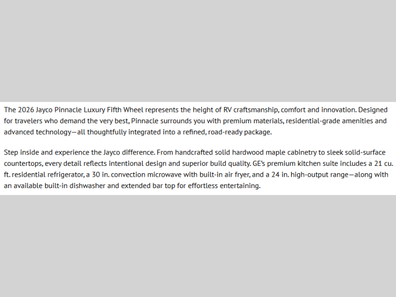 With any Eagle HT fifth wheel or travel trailer by Jayco you will enjoy a smooth drive thanks to the 4 Star Handling Package and MORryde CRE-3000 rubberized suspension. The Customer Value Package includes amenities that are sure to make camping easier than ever, like the 60K on-demand water heater, Keyed-Alike lock system, 15,000 BTU "Whisper Quiet" A/C, and more. Handcrafted door/drawer fronts will make your space feel more like home, along with residential vinyl flooring throughout, GE appliances, and blackout roller shades with reflective side throughout to keep the sun out when you want to sleep in. Each model also includes a NuVo H2O water treatment system with filters included, interior and exterior "Blue Sync" audio connect with MB Quart Sound for your TV and phone, and 100% no floor vents for added comfort and convenience!