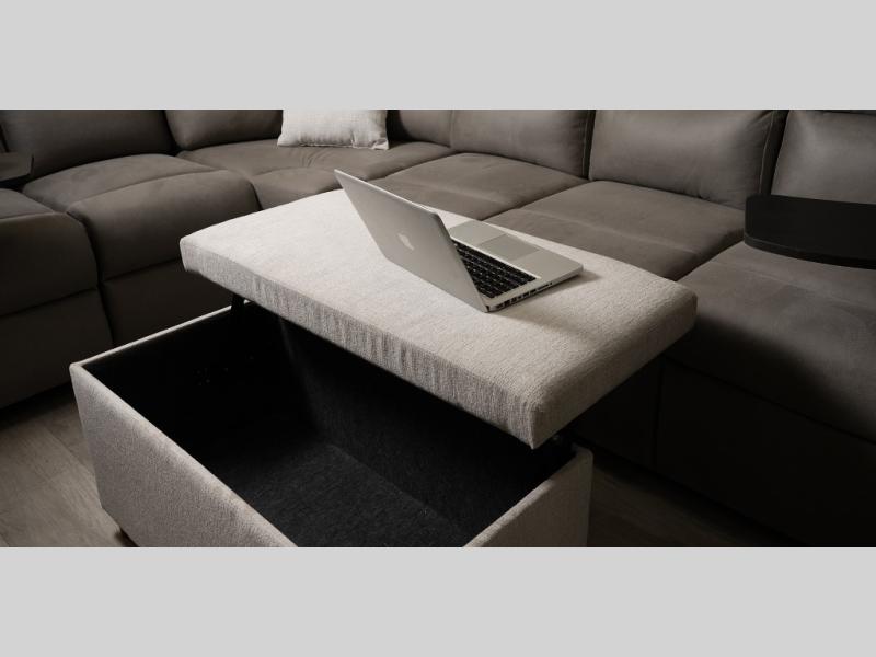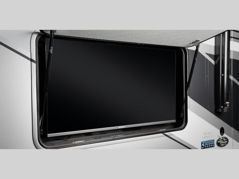You will love how much interior space you have in this fifth wheel thanks to the dual opposing slides in the combined kitchen and living area! While your crew is relaxing on the theater seat or tri-fold sofa, you can prepare dinner on the GE black and stainless 21" range. There is also an entertainment center and fireplace across from the theater seat for easy viewing, and the table and chairs with a bench will be the perfect place to play a board game at. Head to the front to enjoy the private bedroom with an Olympic queen bed, and the full bath is close by for easy nighttime use!