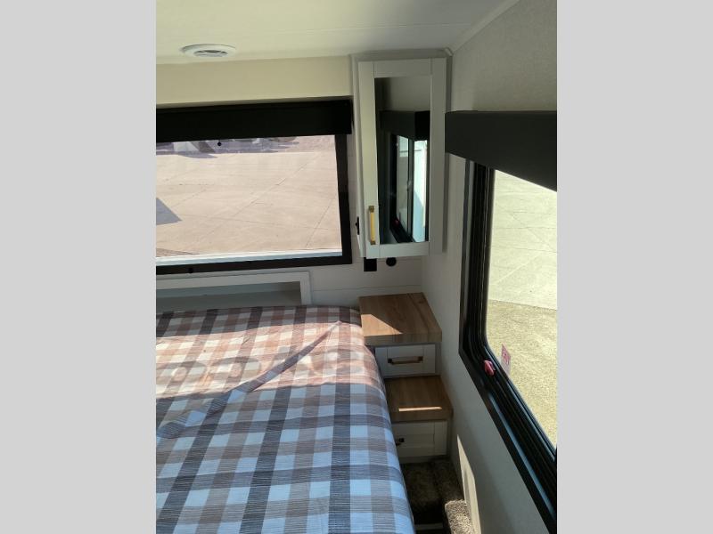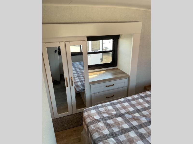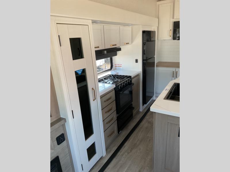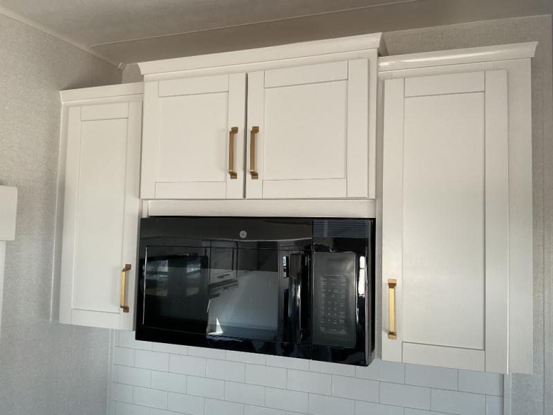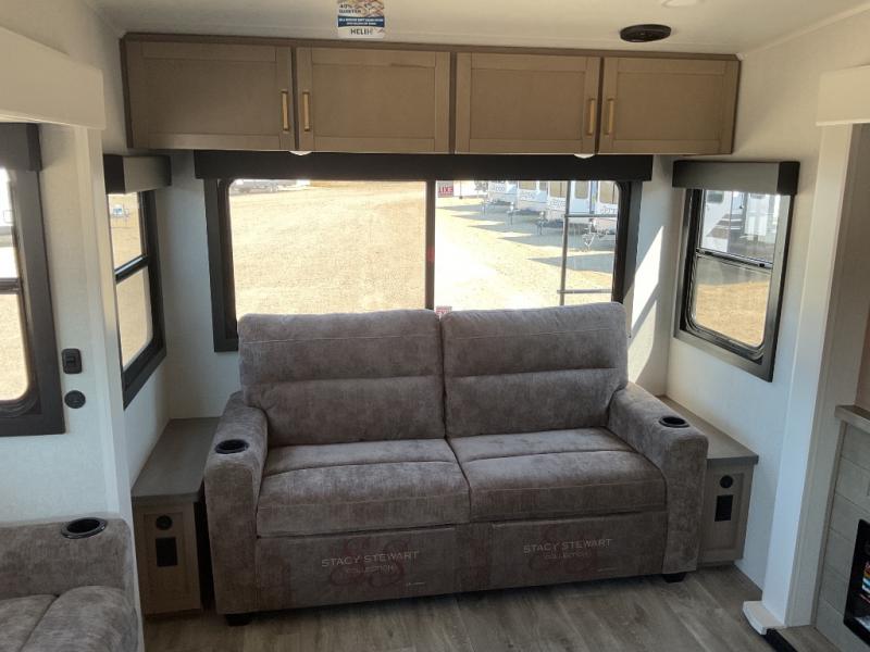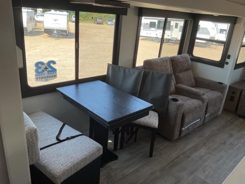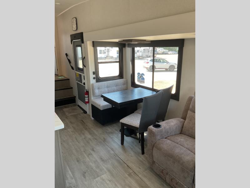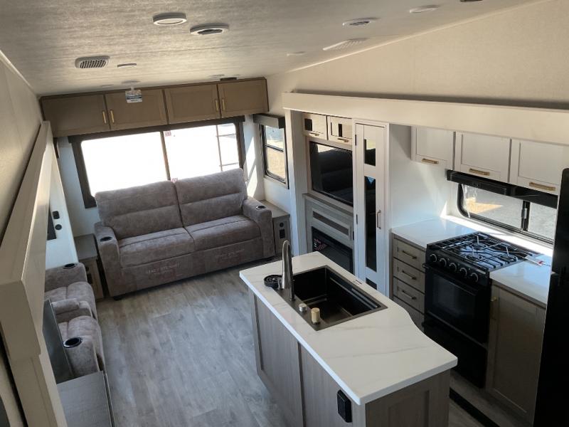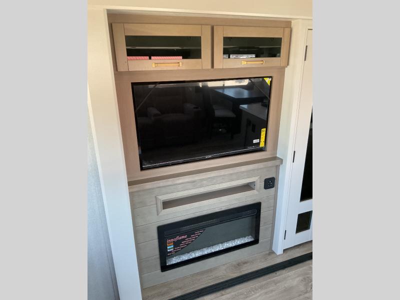 Pack your bags and head off on adventure in this spacious fifth wheel for four! The dual opposing slides in the kitchen and main living area will give your crew more space to relax. Speaking of relaxing, there is a theater seat across from the fireplace and TV plus a tri-fold sofa to make it a movie night. This unit includes a kitchen island with an All-In-One sink for easy cleaning, a hutch with added storage, plus a GE 10 cu. ft. 12V refrigerator. The front master bedroom includes an Olympic queen bed, dual wardrobes plus a third wardrobe within the bedroom slide out, and TV prep if you want the option to watch a show in bed!