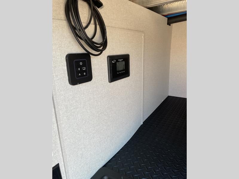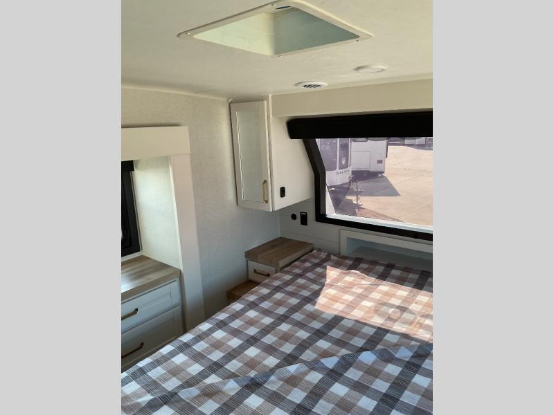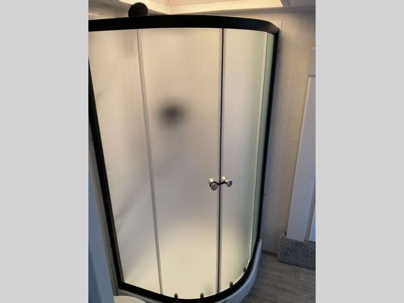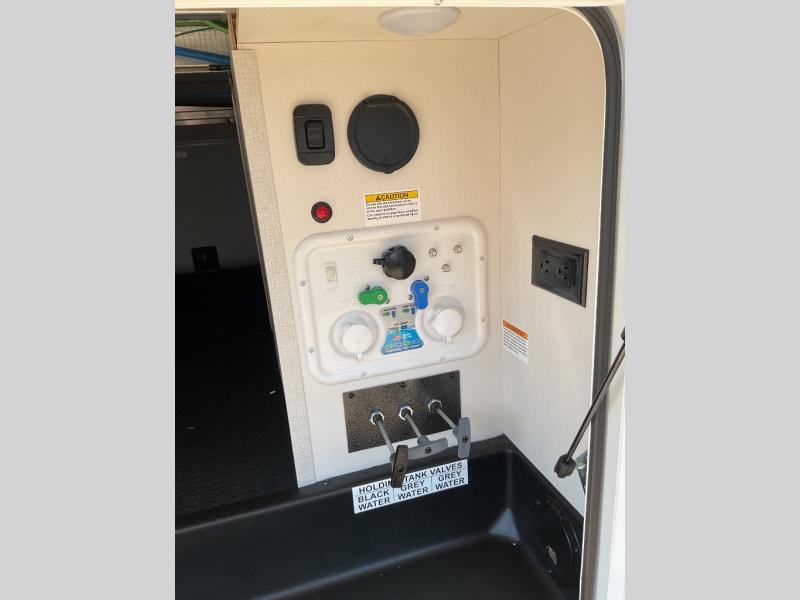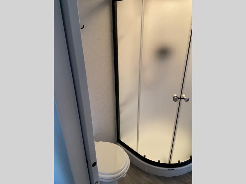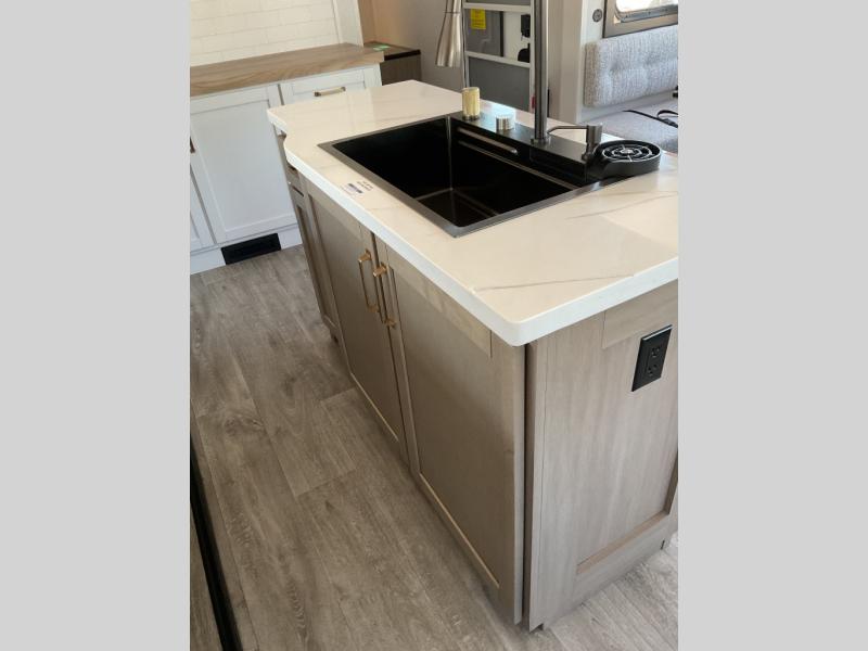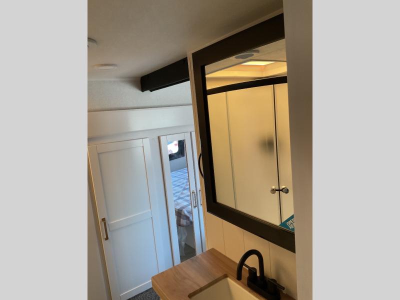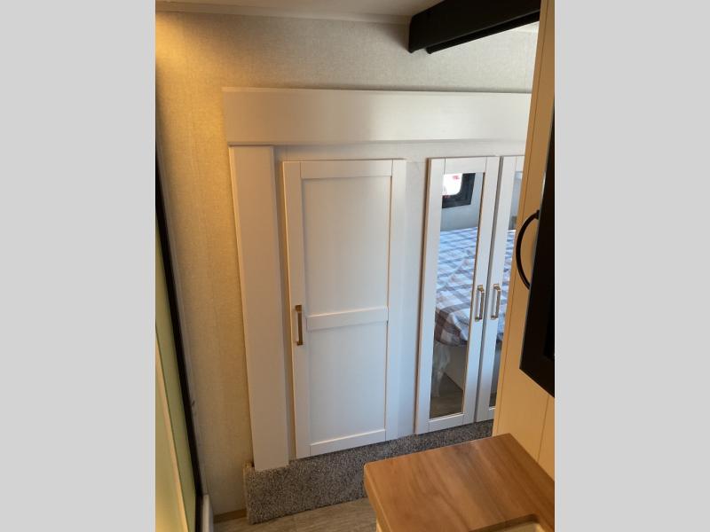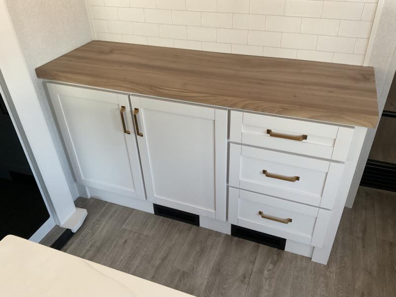 Pack your bags and head off on adventure in this spacious fifth wheel for four! The dual opposing slides in the kitchen and main living area will give your crew more space to relax. Speaking of relaxing, there is a theater seat across from the fireplace and TV plus a tri-fold sofa to make it a movie night. This unit includes a kitchen island with an All-In-One sink for easy cleaning, a hutch with added storage, plus a GE 10 cu. ft. 12V refrigerator. The front master bedroom includes an Olympic queen bed, dual wardrobes plus a third wardrobe within the bedroom slide out, and TV prep if you want the option to watch a show in bed!