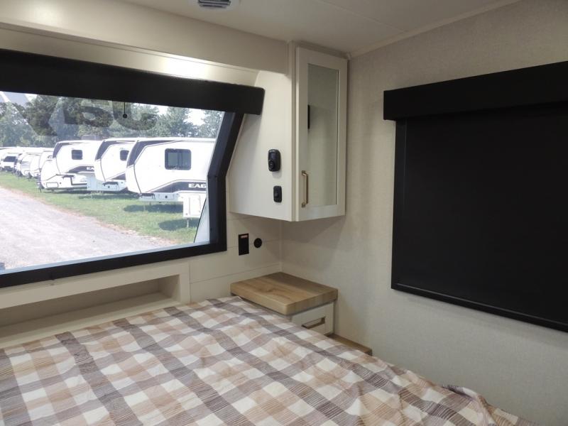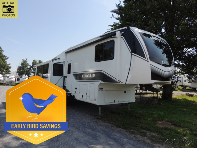 With any Eagle HT fifth wheel or travel trailer by Jayco you will enjoy a smooth drive thanks to the 4 Star Handling Package, Goodyear Endurance tires, and MORryde CRE-3000 rubberized suspension. The Customer Value Package includes amenities that are sure to make camping easier than ever, like the 60K on-demand water heater, Keyed-Alike lock system, 15,000 BTU "Whisper Quiet" A/C, and more. Handcrafted and glazed door/drawer fronts will make your space feel more like home, along with residential vinyl flooring throughout, GE appliances, and blackout roller shades with reflective side throughout to keep the sun out when you want to sleep in. Each model also includes a NuVo H2O water treatment system with filters included, interior and exterior "Blue Sync" audio connect with MB Quart Sound for your TV and phone, and 100% no floor vents for added comfort and convenience!