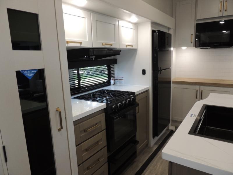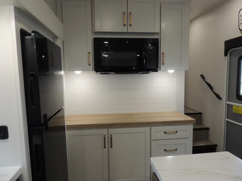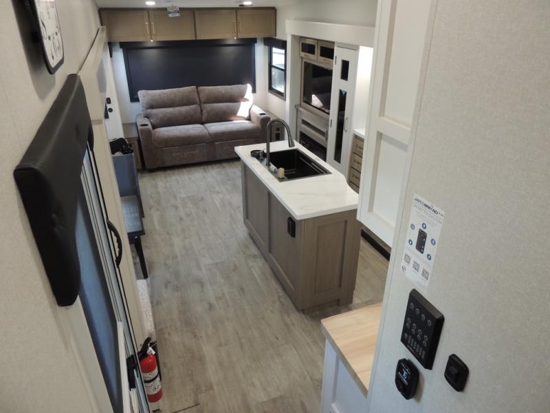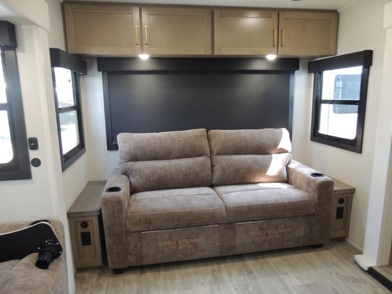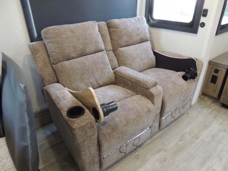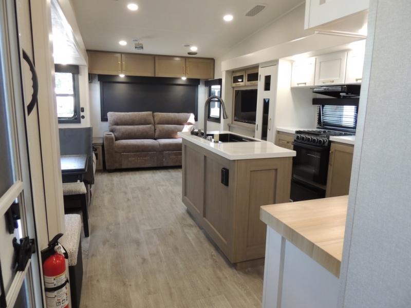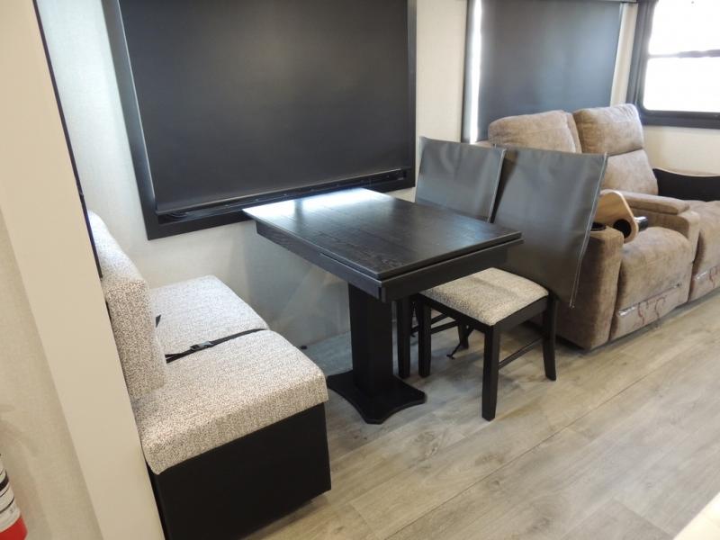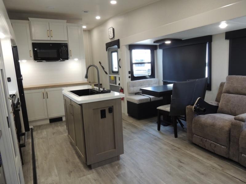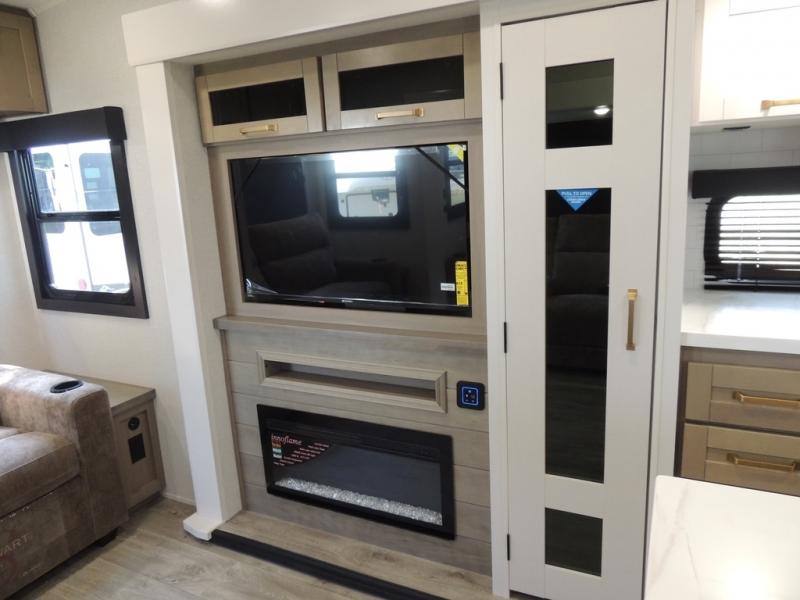 Pack your bags and head off on adventure in this spacious fifth wheel for four! The dual opposing slides in the kitchen and main living area will give your crew more space to relax. Speaking of relaxing, there is a theater seat across from the fireplace and TV plus a tri-fold sofa to make it a movie night. This unit includes a kitchen island with an All-In-One sink for easy cleaning, a hutch with added storage, plus a GE 10 cu. ft. 12V refrigerator. The front master bedroom includes an Olympic queen bed, dual wardrobes plus a third wardrobe within the bedroom slide out, and TV prep if you want the option to watch a show in bed!