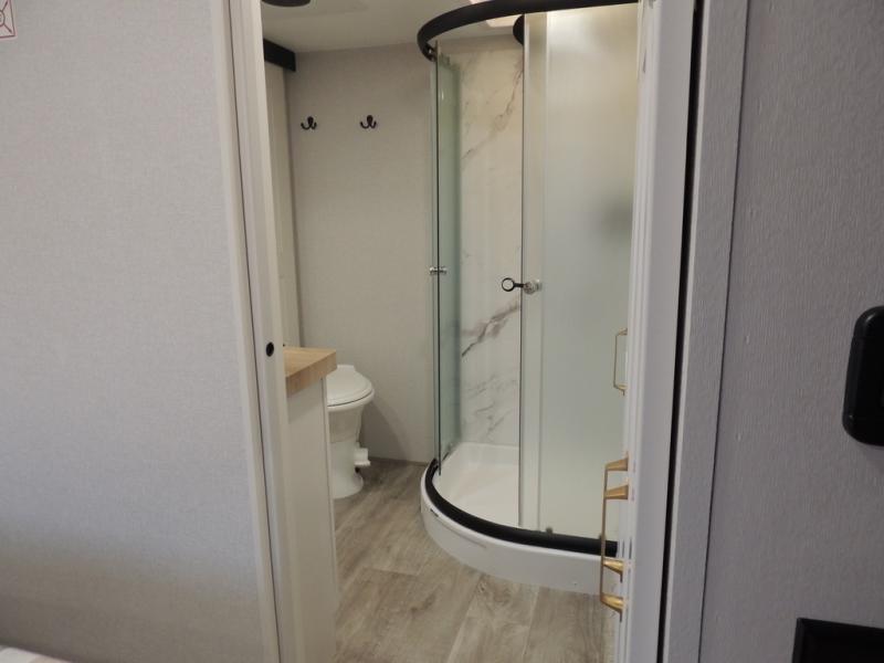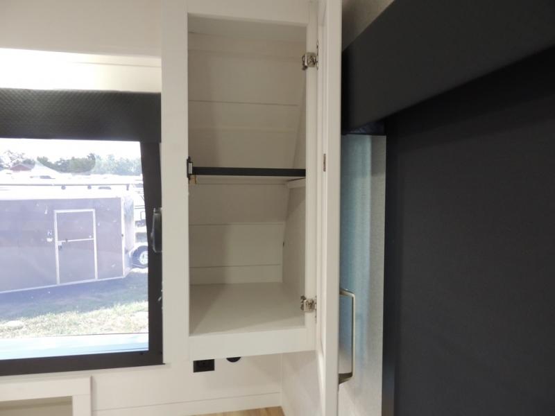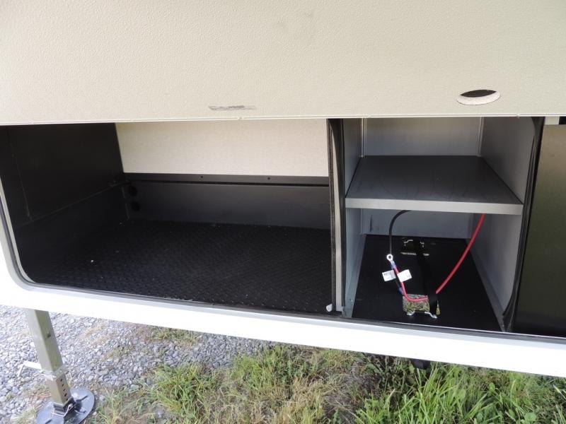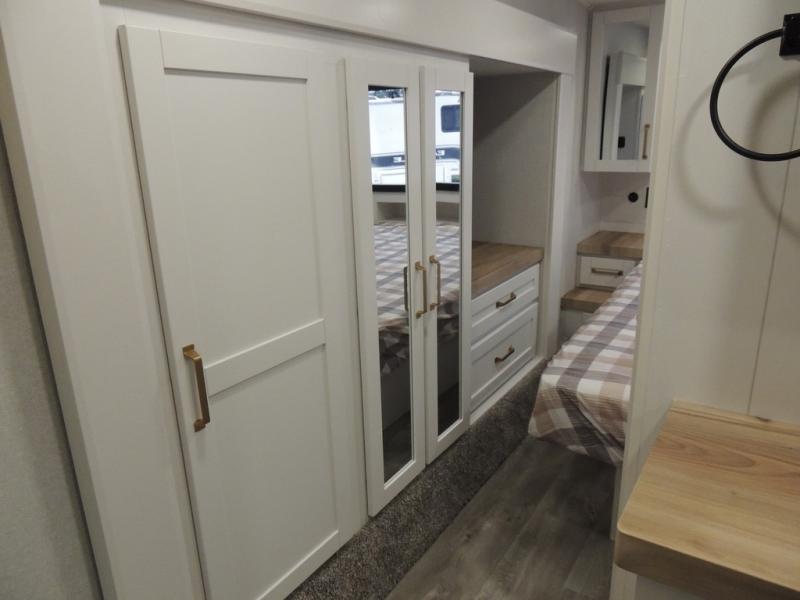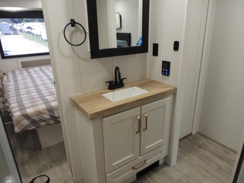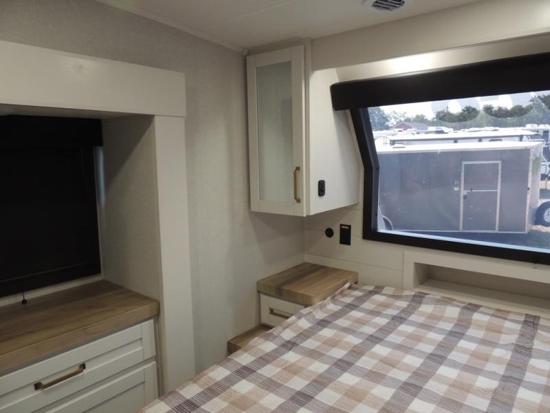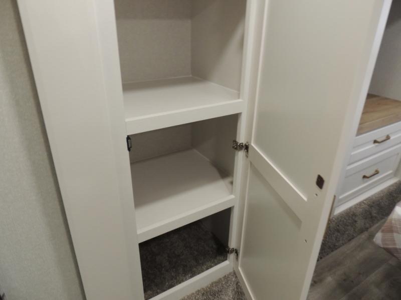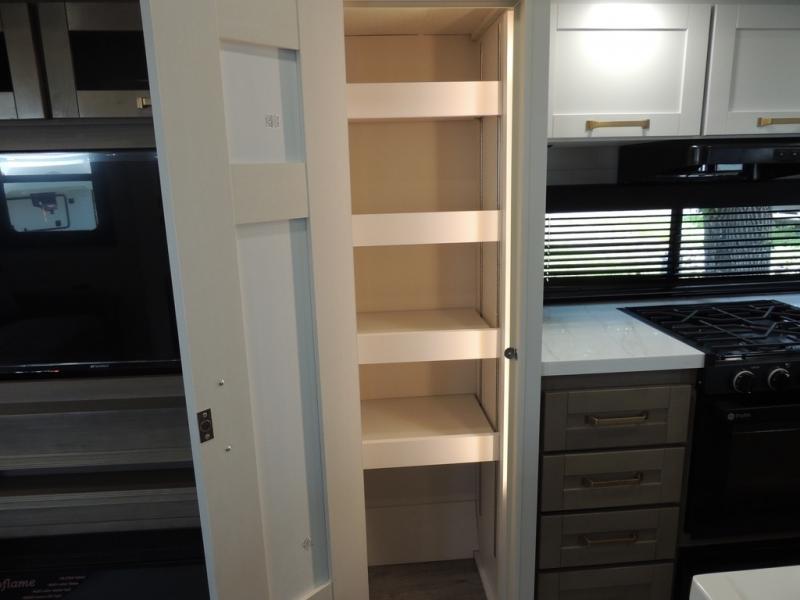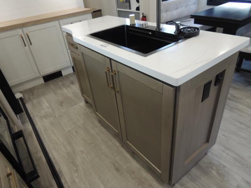 Pack your bags and head off on adventure in this spacious fifth wheel for four! The dual opposing slides in the kitchen and main living area will give your crew more space to relax. Speaking of relaxing, there is a theater seat across from the fireplace and TV plus a tri-fold sofa to make it a movie night. This unit includes a kitchen island with an All-In-One sink for easy cleaning, a hutch with added storage, plus a GE 10 cu. ft. 12V refrigerator. The front master bedroom includes an Olympic queen bed, dual wardrobes plus a third wardrobe within the bedroom slide out, and TV prep if you want the option to watch a show in bed!