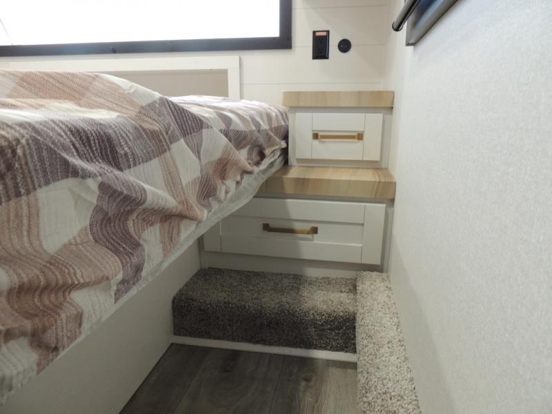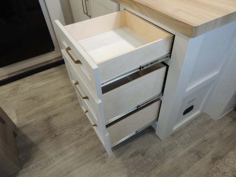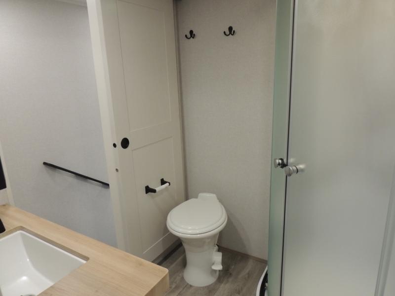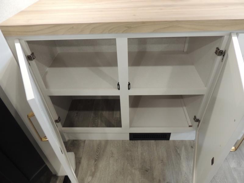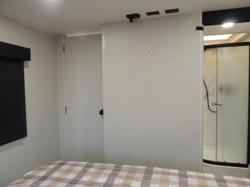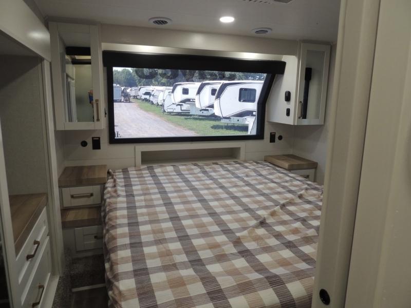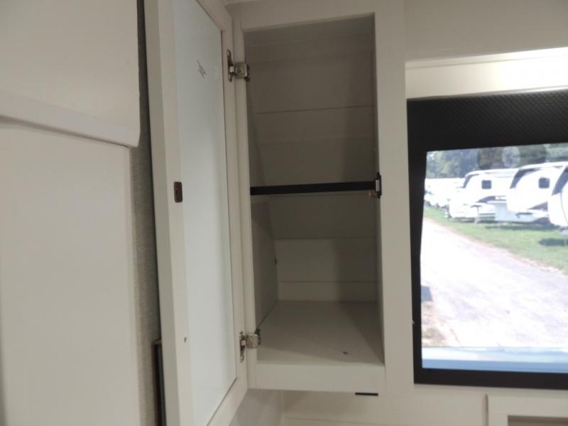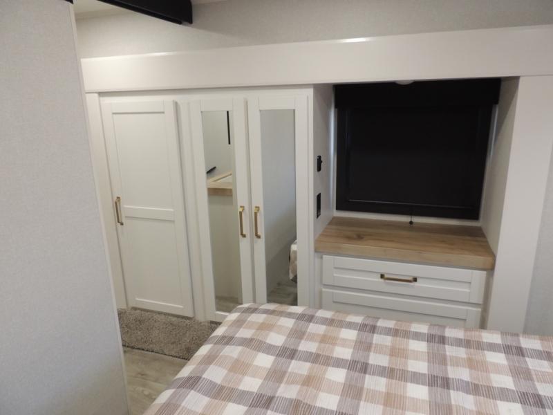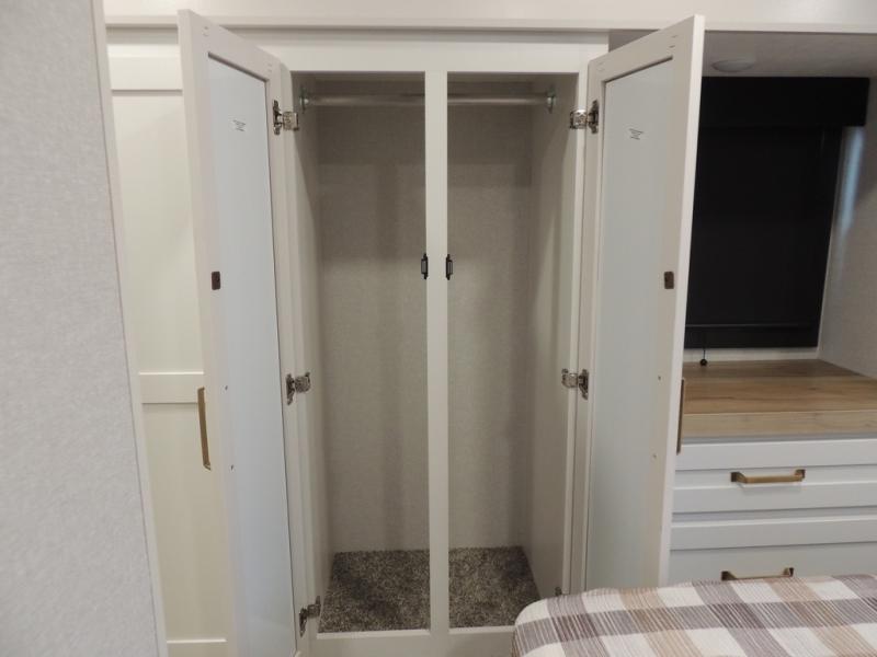 Pack your bags and head off on adventure in this spacious fifth wheel for four! The dual opposing slides in the kitchen and main living area will give your crew more space to relax. Speaking of relaxing, there is a theater seat across from the fireplace and TV plus a tri-fold sofa to make it a movie night. This unit includes a kitchen island with an All-In-One sink for easy cleaning, a hutch with added storage, plus a GE 10 cu. ft. 12V refrigerator. The front master bedroom includes an Olympic queen bed, dual wardrobes plus a third wardrobe within the bedroom slide out, and TV prep if you want the option to watch a show in bed!