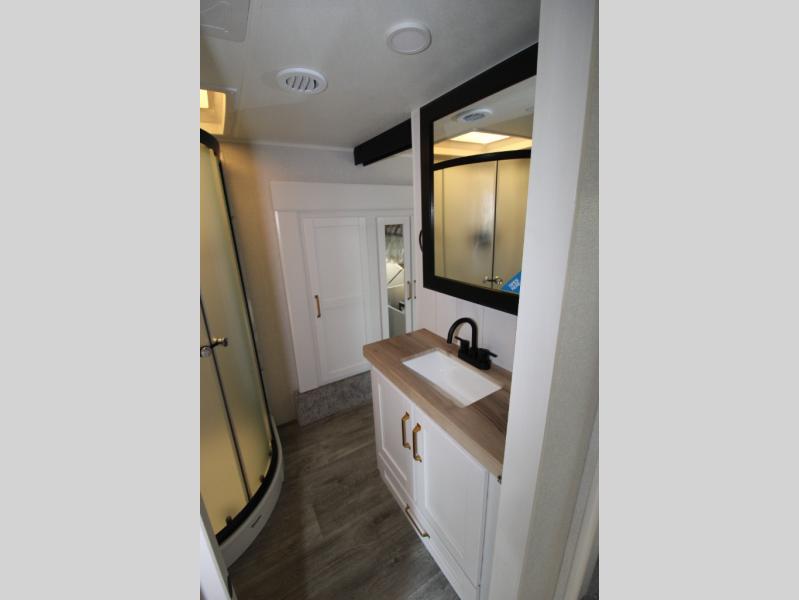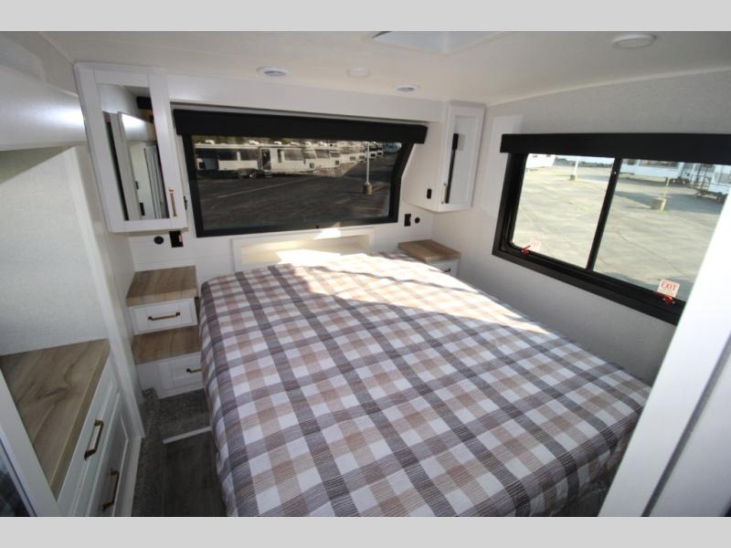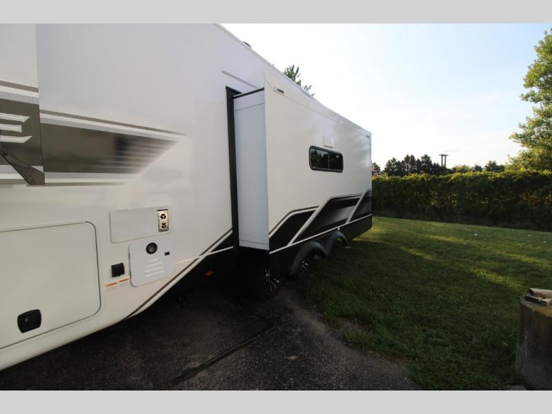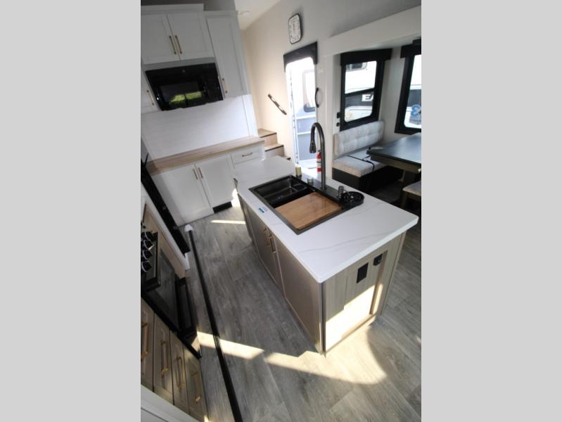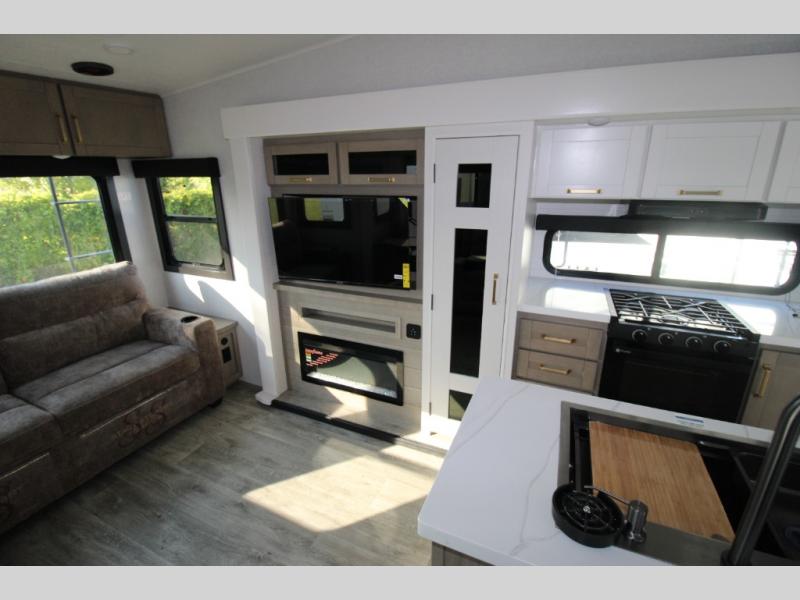 Pack your bags and head off on adventure in this spacious fifth wheel for four! The dual opposing slides in the kitchen and main living area will give your crew more space to relax. Speaking of relaxing, there is a theater seat across from the fireplace and TV plus a tri-fold sofa to make it a movie night. This unit includes a kitchen island with an All-In-One sink for easy cleaning, a hutch with added storage, plus a GE 10 cu. ft. 12V refrigerator. The front master bedroom includes an Olympic queen bed, dual wardrobes plus a third wardrobe within the bedroom slide out, and TV prep if you want the option to watch a show in bed!
